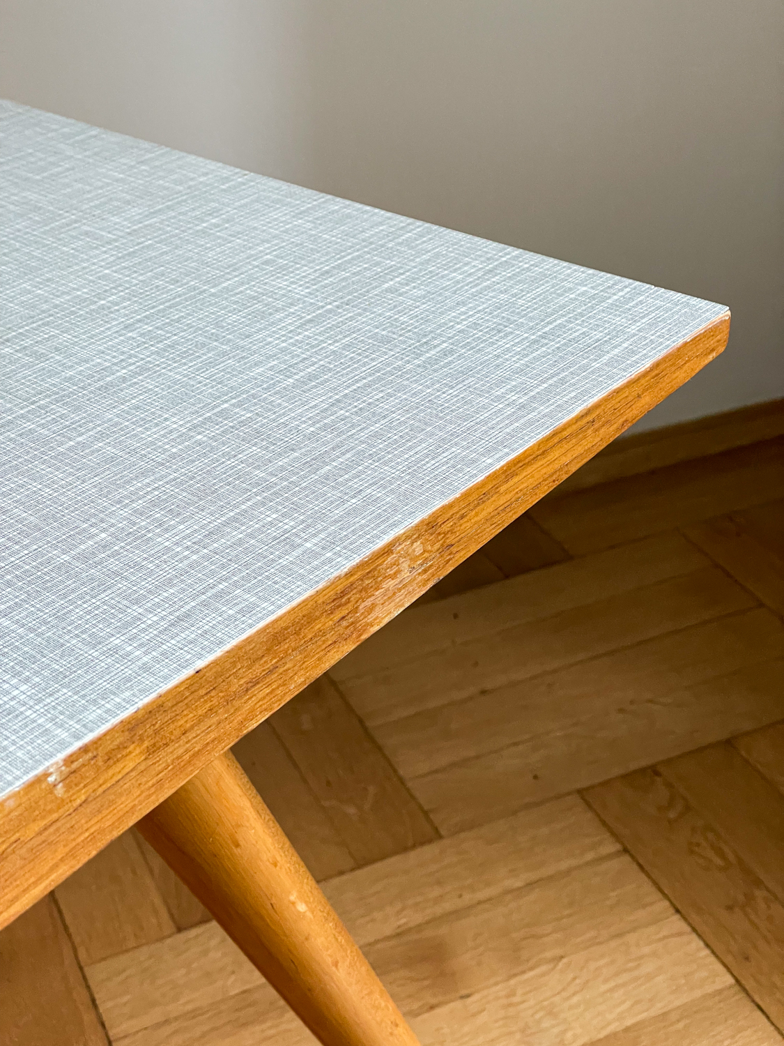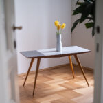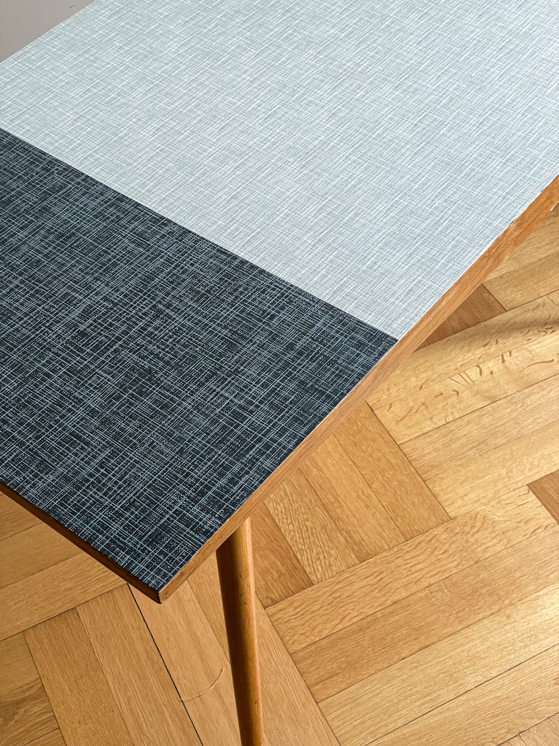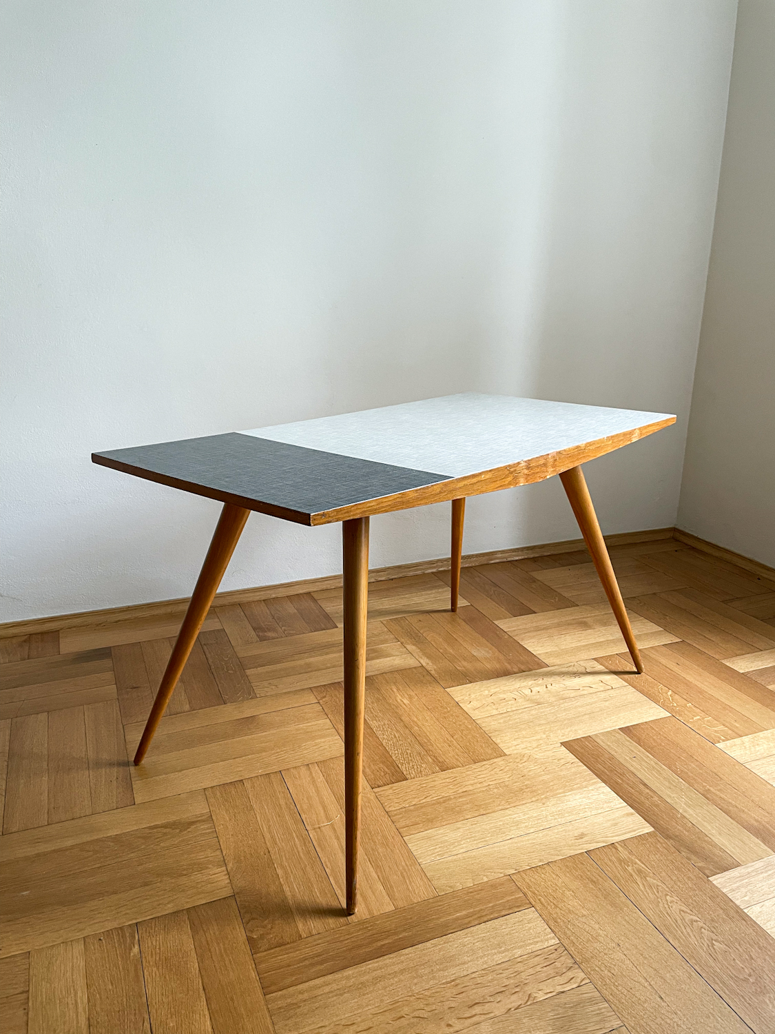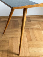Konferenční stolek z 60. let minulého století s umakartovou deskou v černo-bílém provedení na subtilních nohou ve tvaru kuželu. Stolek působí velmi elegantím dojmem.