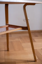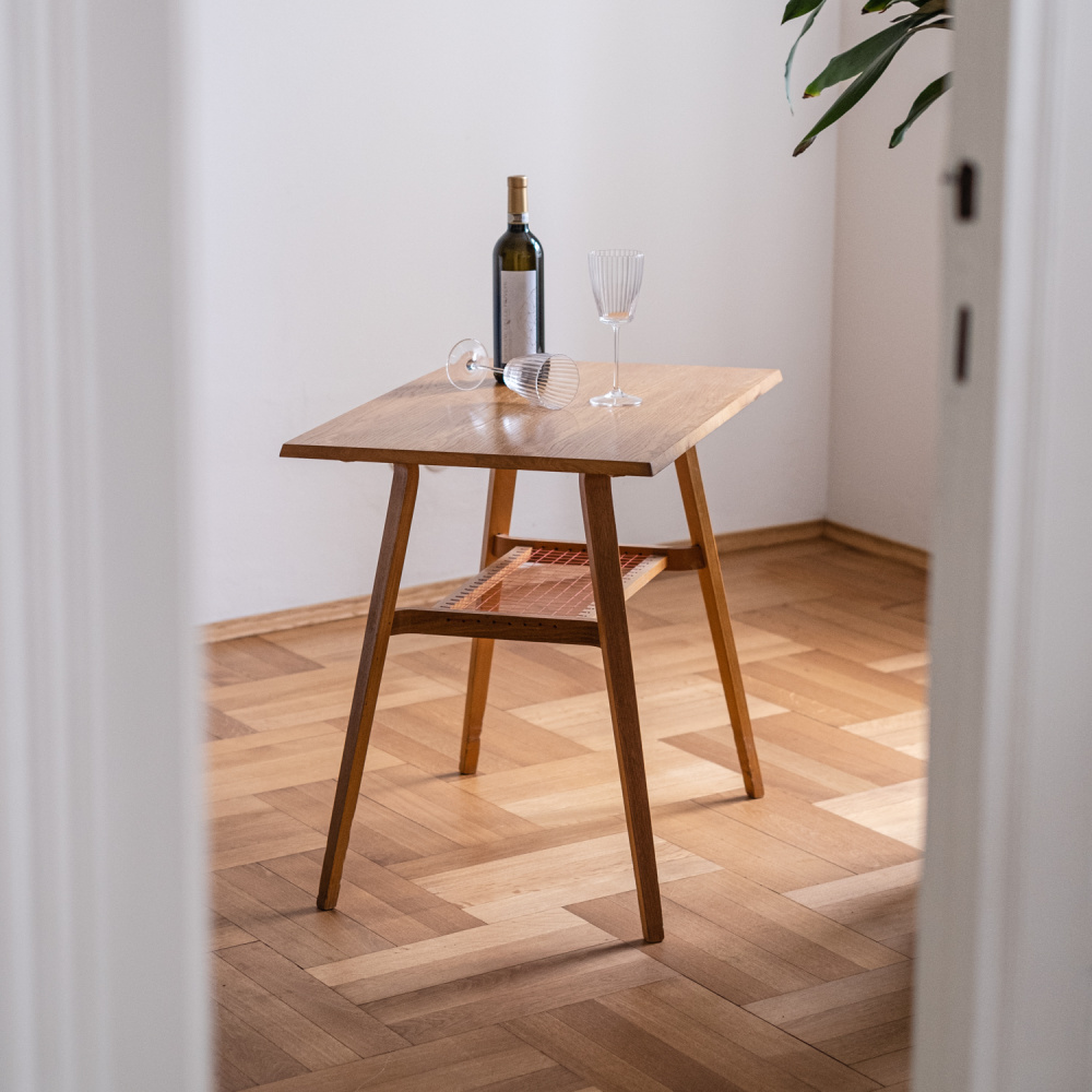 Stolek z 60. let v provedení světlý dub (dýha) sloužil jako televizní stůl. Je v krásném stavu a bude se hodit jako konferenční či odkládací stolek. Dolní polička je tvořena výpletem v červené barvě. Preferujete-li jinou barevnost, máme je ještě v provedení se zeleným výpletem.