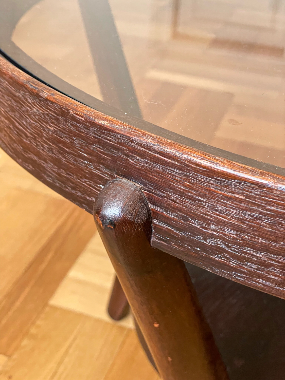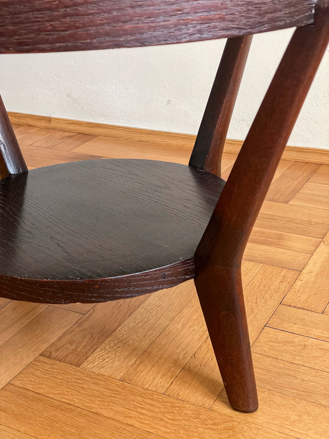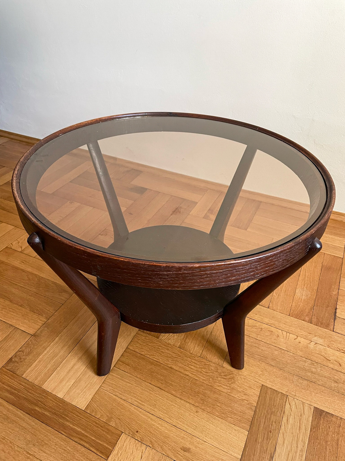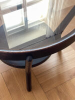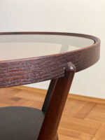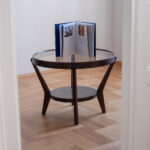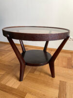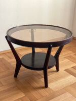 Tmavě hnědý konferenční stolek ze 40. let byl navržen Karlem Koželkou a Antonínem Kropáčkem a patří do souboru nábytku, který získal v roce 1946 stříbrnou medaili na milánském Trienále, nejstarší a nejprestižnější mezinárodní přehlídce designu a architektury.