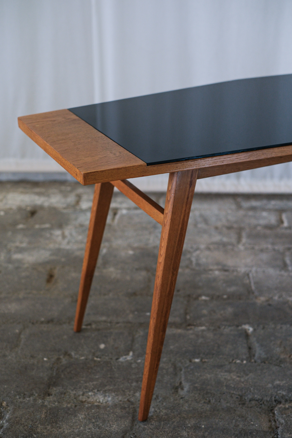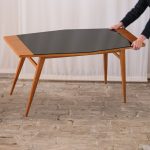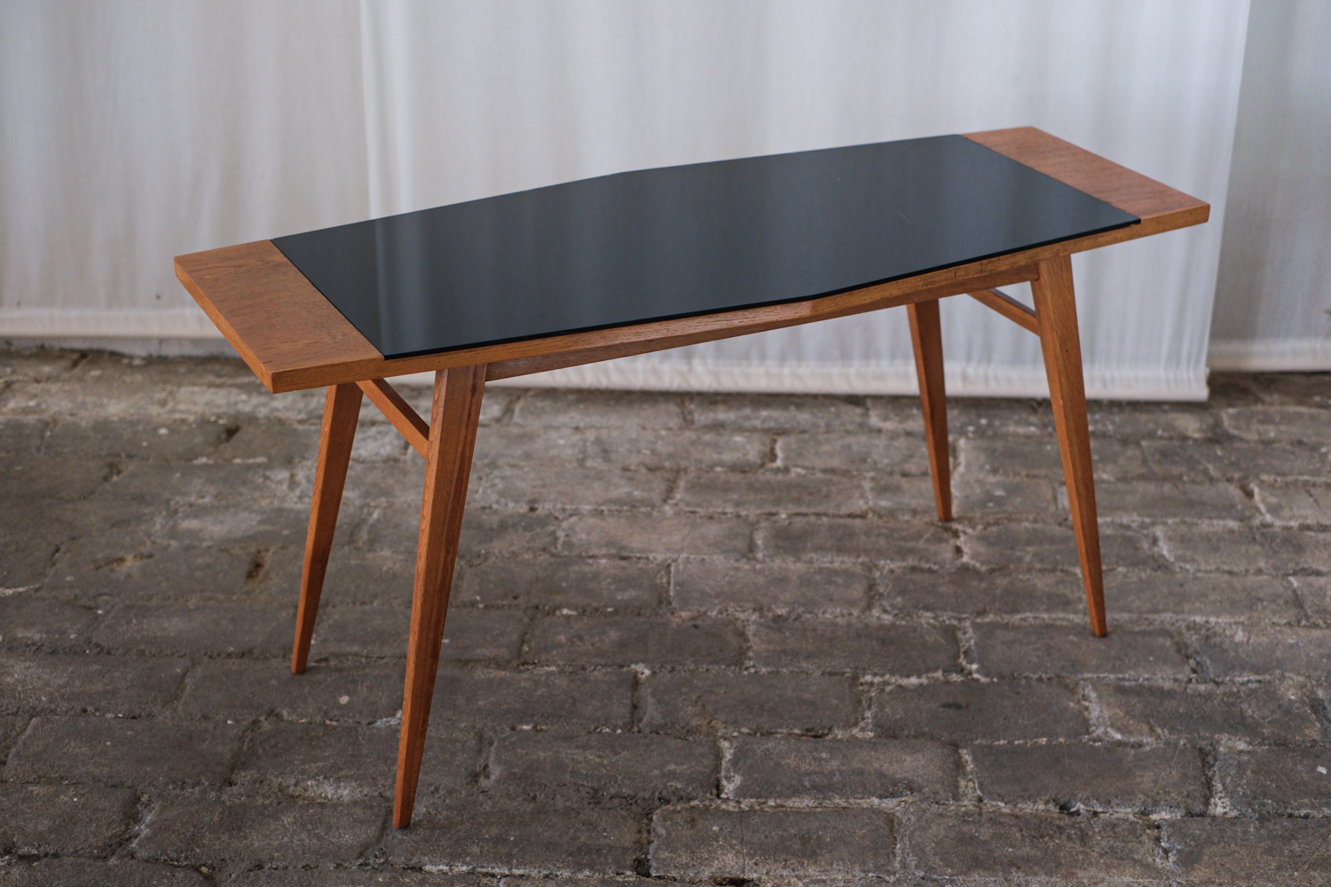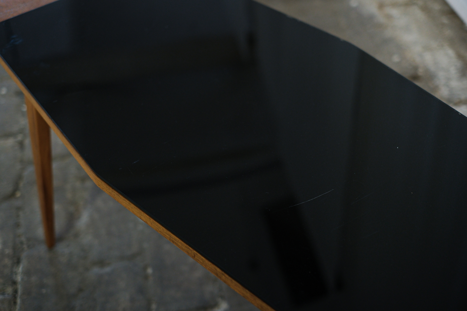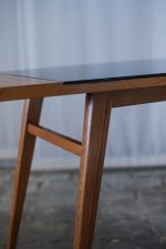 Stolek, který zaujme na první pohled svou neobvyklou siluetou. Horní deska se sklem v černé barvě s nepravidelným, téměř organickým tvarem je zasazena do rámu z masivního dřeva v teplém odstínu medového dubu. Štíhlé, elegantně zkosené nohy podtrhují dynamiku celého stolku typickou pro 60. léta minulého století, kdy se československý design inspiroval skandinávskou estetikou i modernistickou lehkostí. Konferenční stolek, krásně vynikne v kombinaci s minimalistickým interiérem i retro nábytkem.