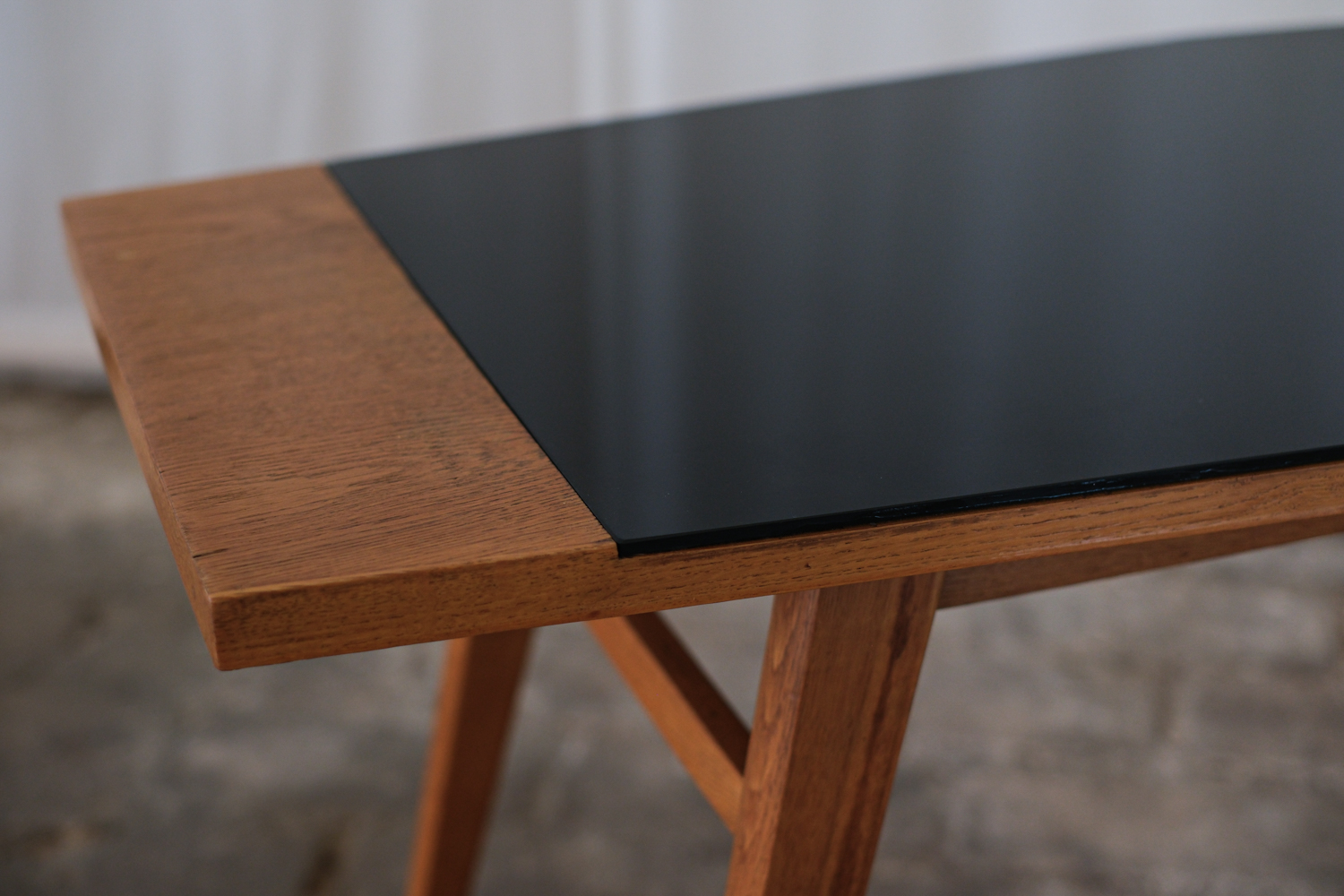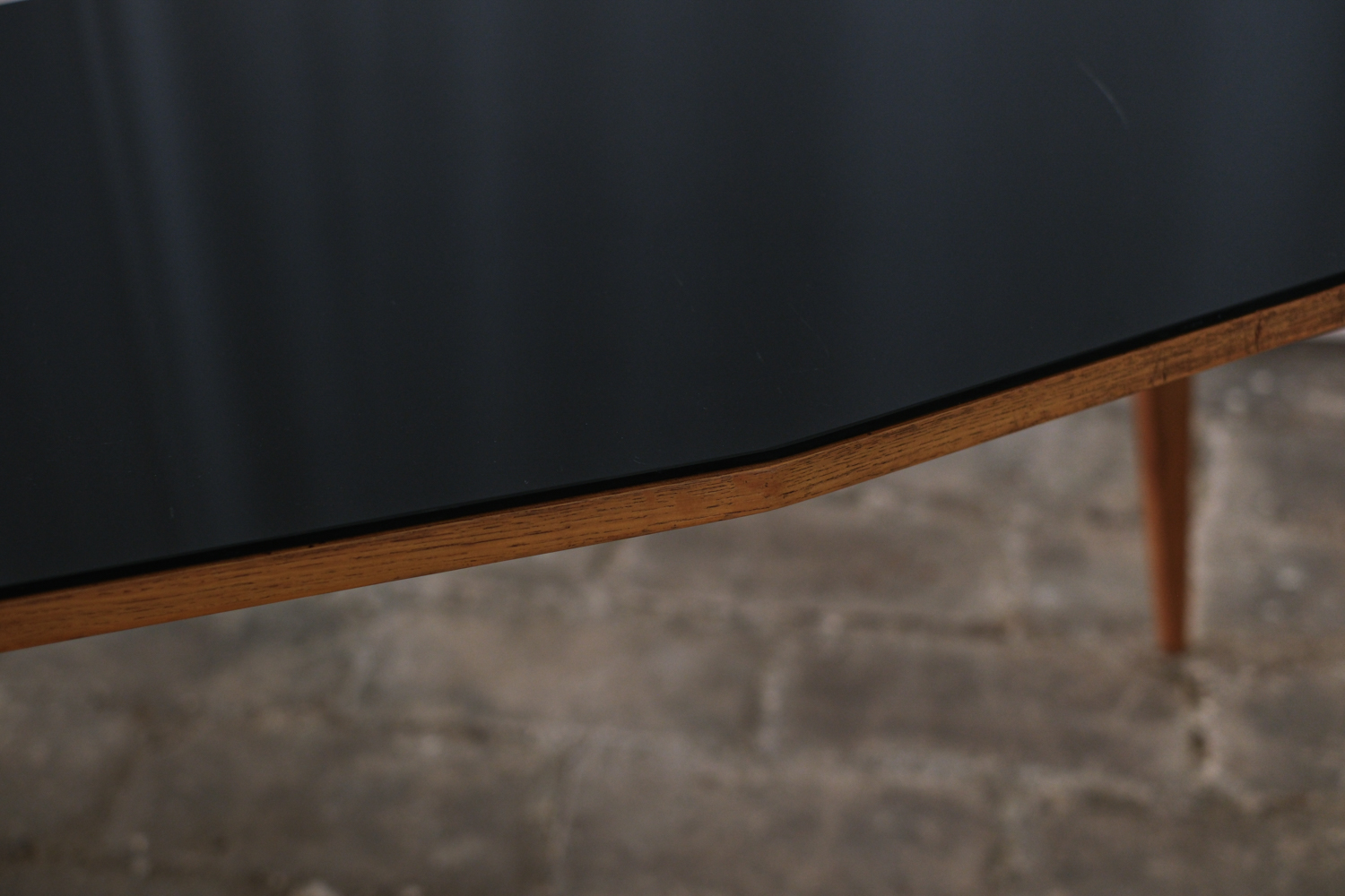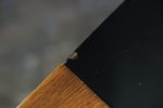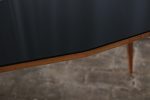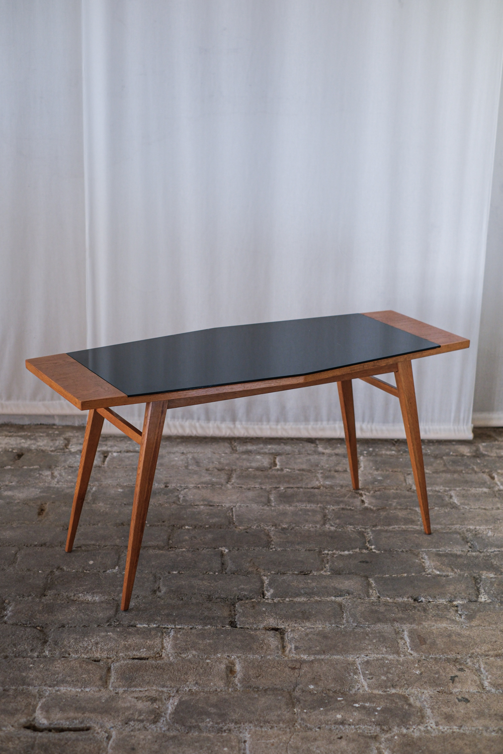 Stolek, který zaujme na první pohled svou neobvyklou siluetou. Horní deska se sklem v černé barvě s nepravidelným, téměř organickým tvarem je zasazena do rámu z masivního dřeva v teplém odstínu medového dubu. Štíhlé, elegantně zkosené nohy podtrhují dynamiku celého stolku typickou pro 60. léta minulého století, kdy se československý design inspiroval skandinávskou estetikou i modernistickou lehkostí. Konferenční stolek, krásně vynikne v kombinaci s minimalistickým interiérem i retro nábytkem.