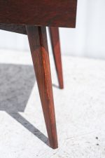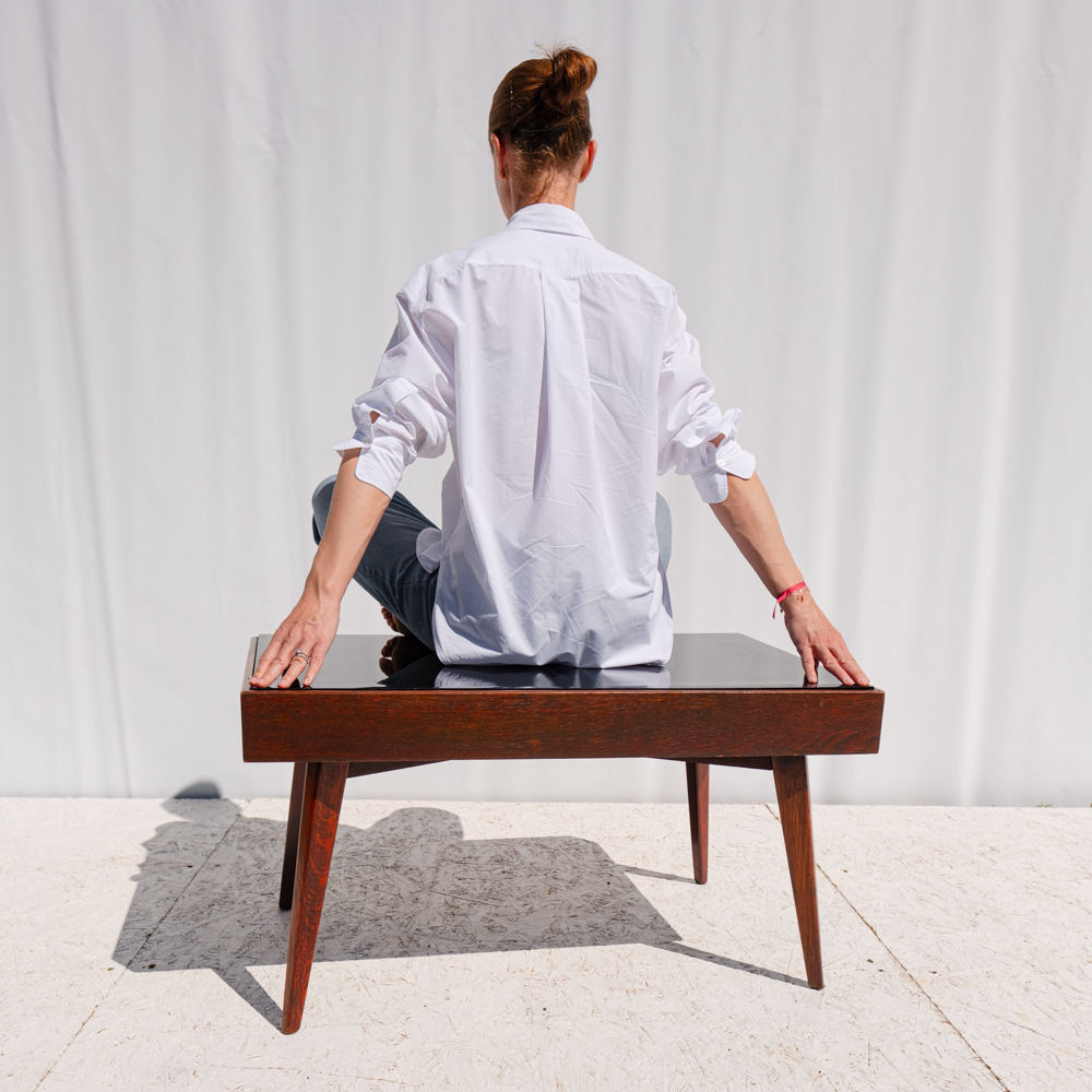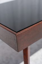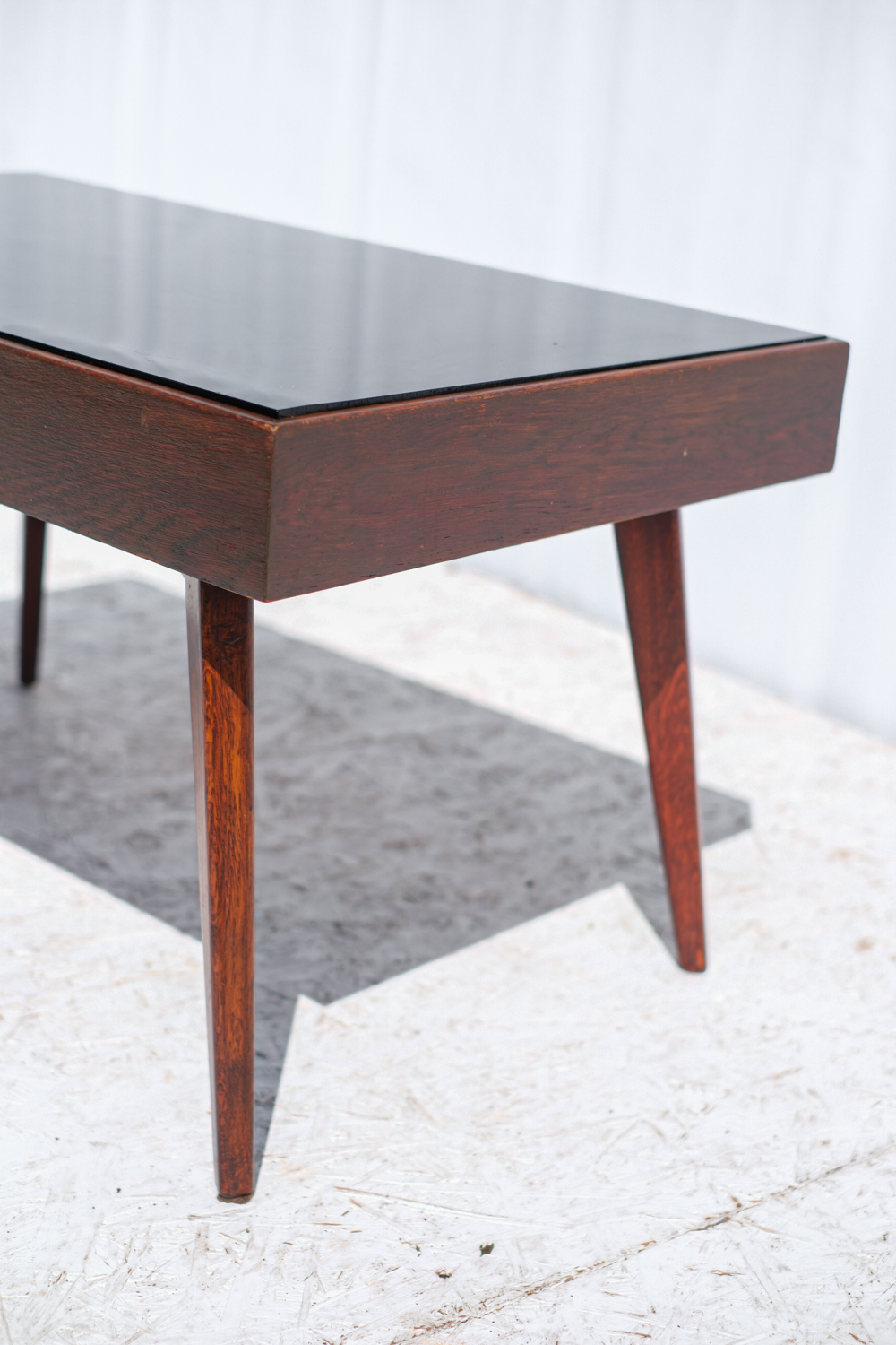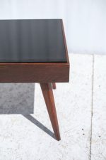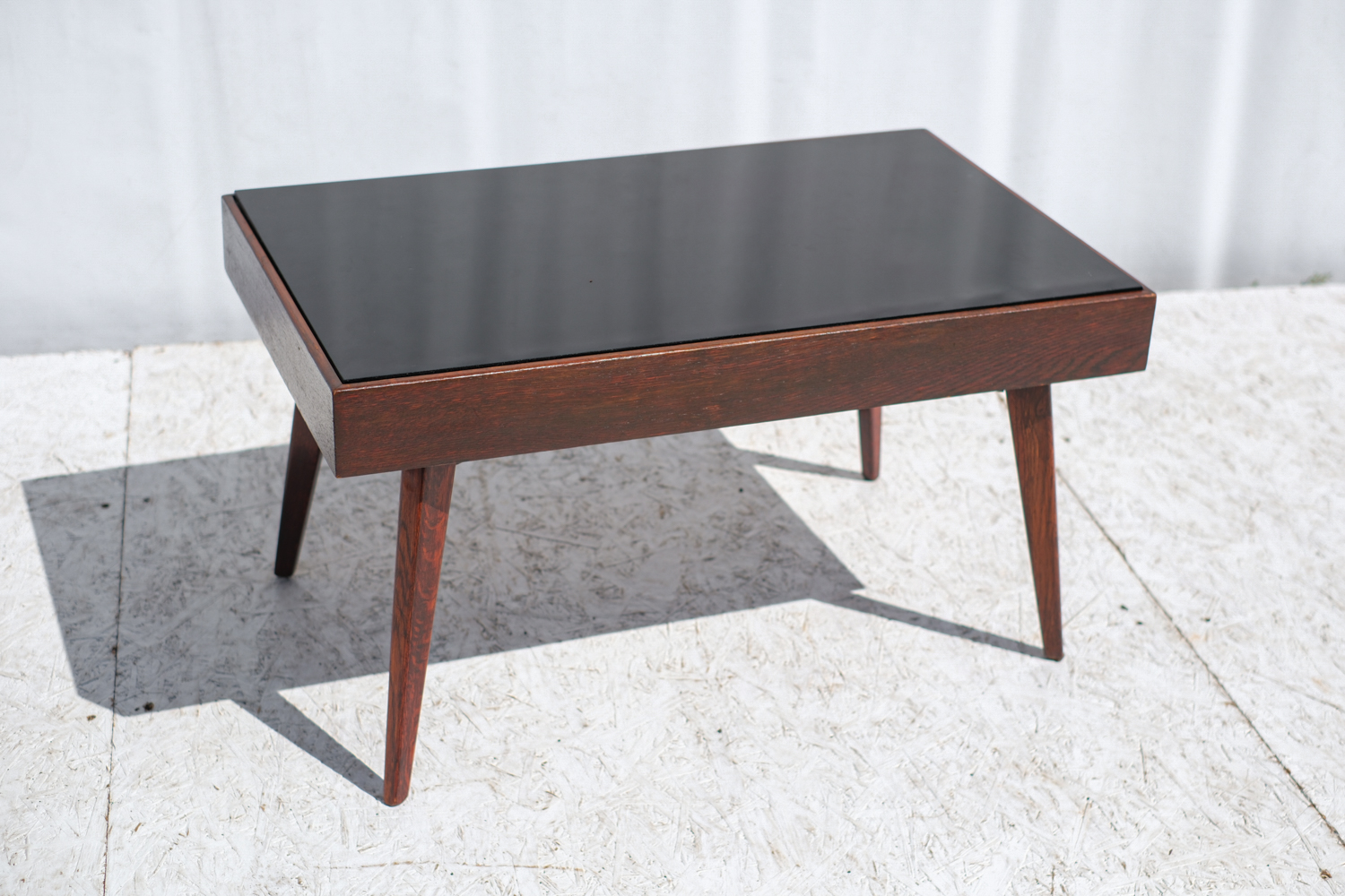 Minimalistický konferenční stolek z 60. let minulého století, typický pro československý nábytkový design té doby. Kónické nohy, tmavě mořená dýha a kontrastní černá skleněná deska tvoří nadčasovou kombinaci, která se hodí do retro i moderně laděného interiéru.