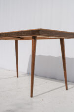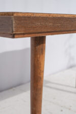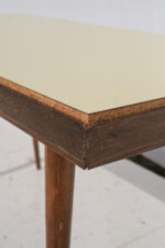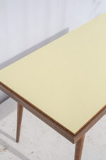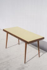Retro konferenční stolek z 60. let minulého století s oboustrannou umakartovou deskou. Potřebujete-li do interiéru dostat více barev, můžete zvolit pastelovou žlutou stranu, pro decentnější ladění naopak šedou verzi.