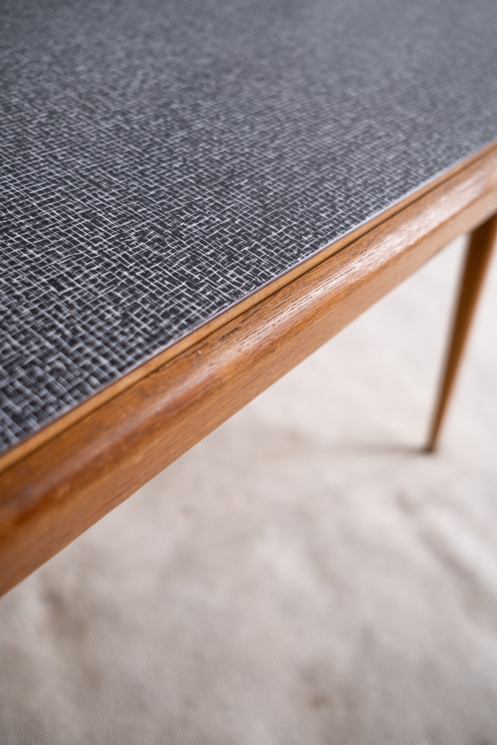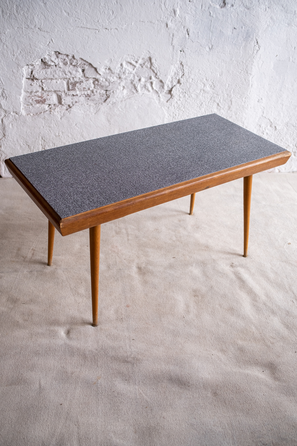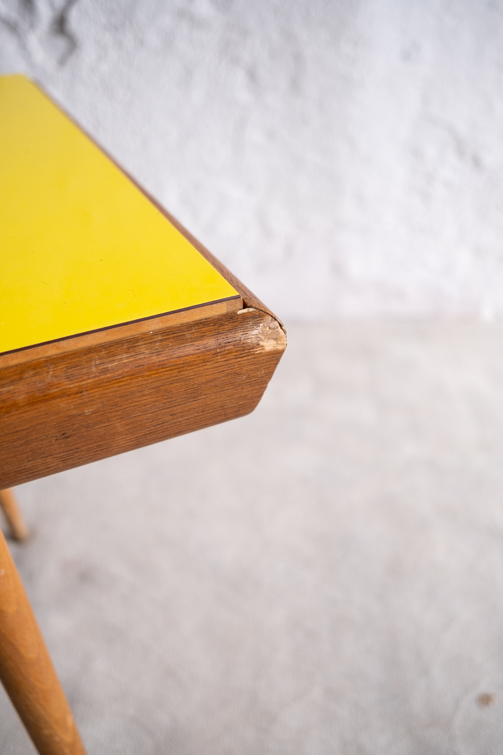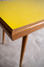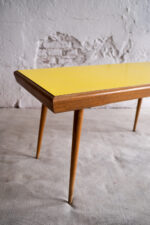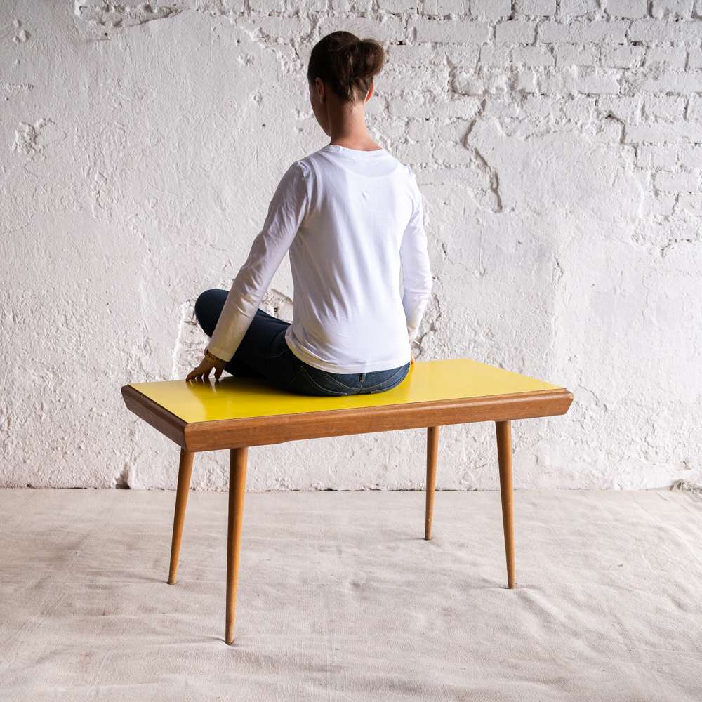 Konferenční stolek vyroben pro Interiér Praha v 70. let minulého století. Umakartová deska je oboustranná a můžete si tak zvolit buď výraznější žlutou nebo střídmější šedou variantu s drobným vzorkem. Máte tak vlastně dva stolky v jednom, ale vždy minimalistický a nadčasový.