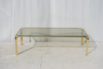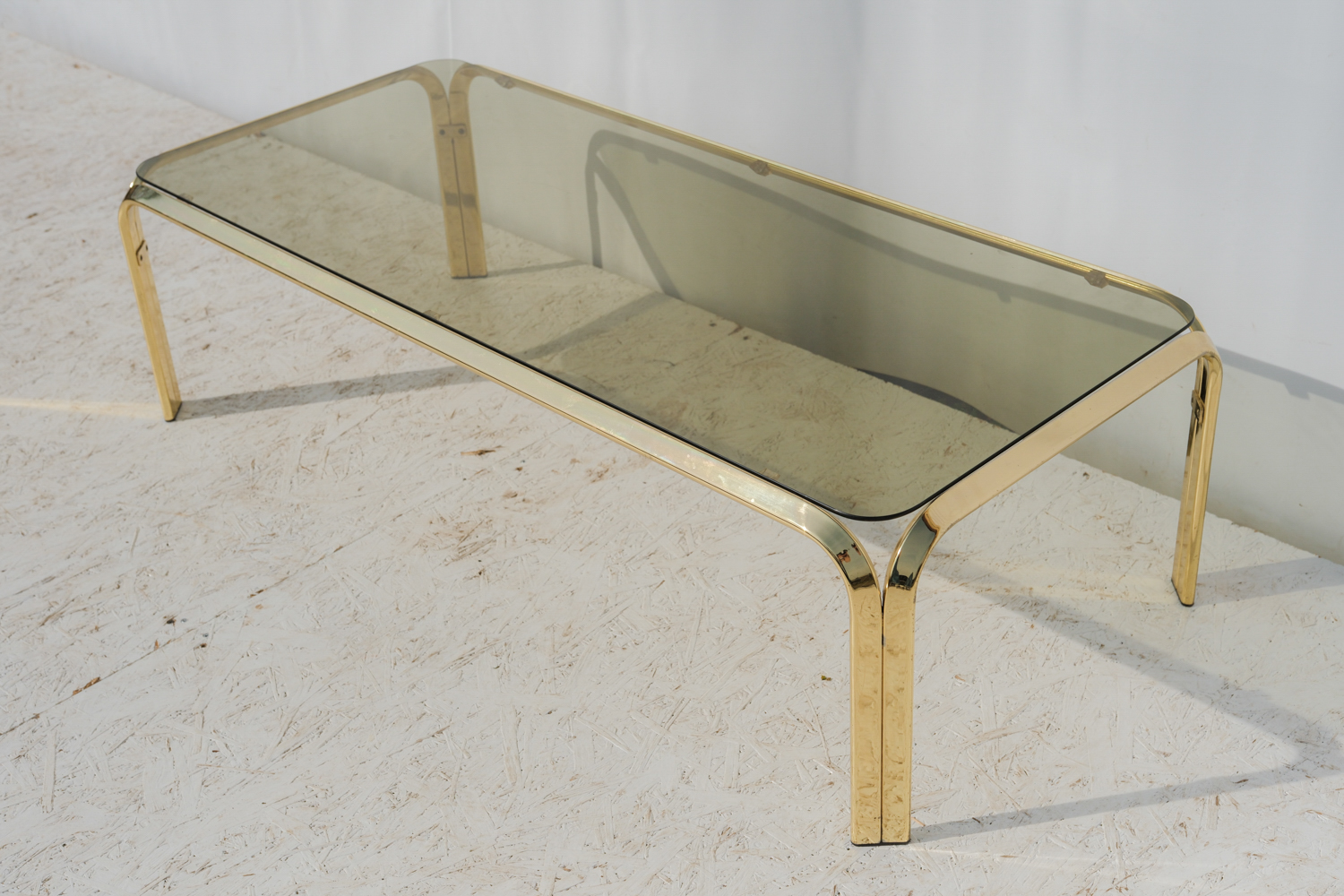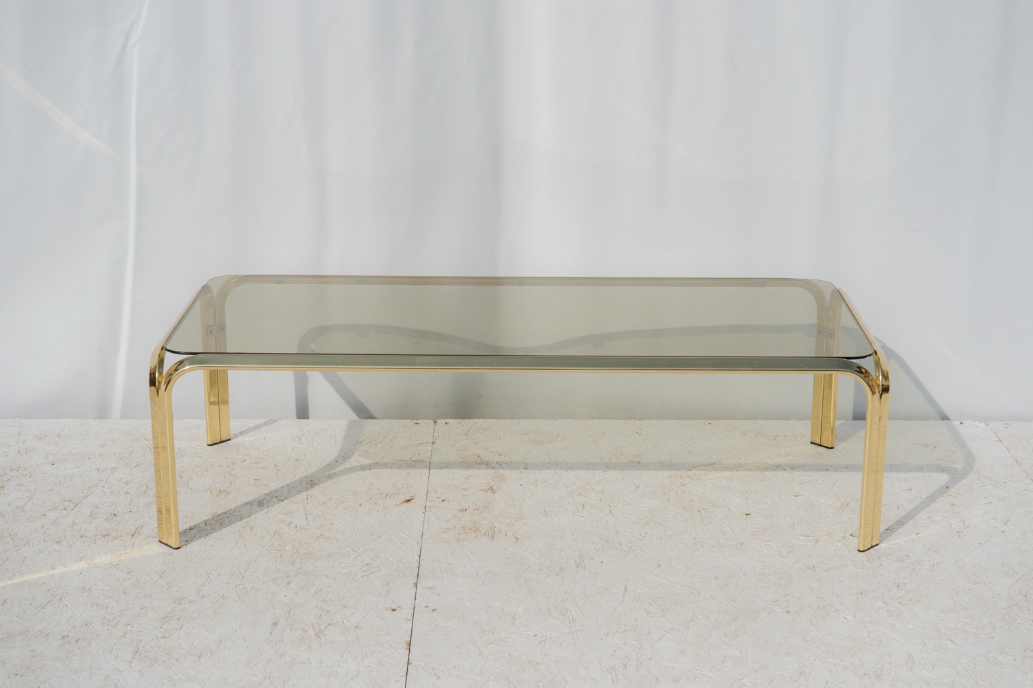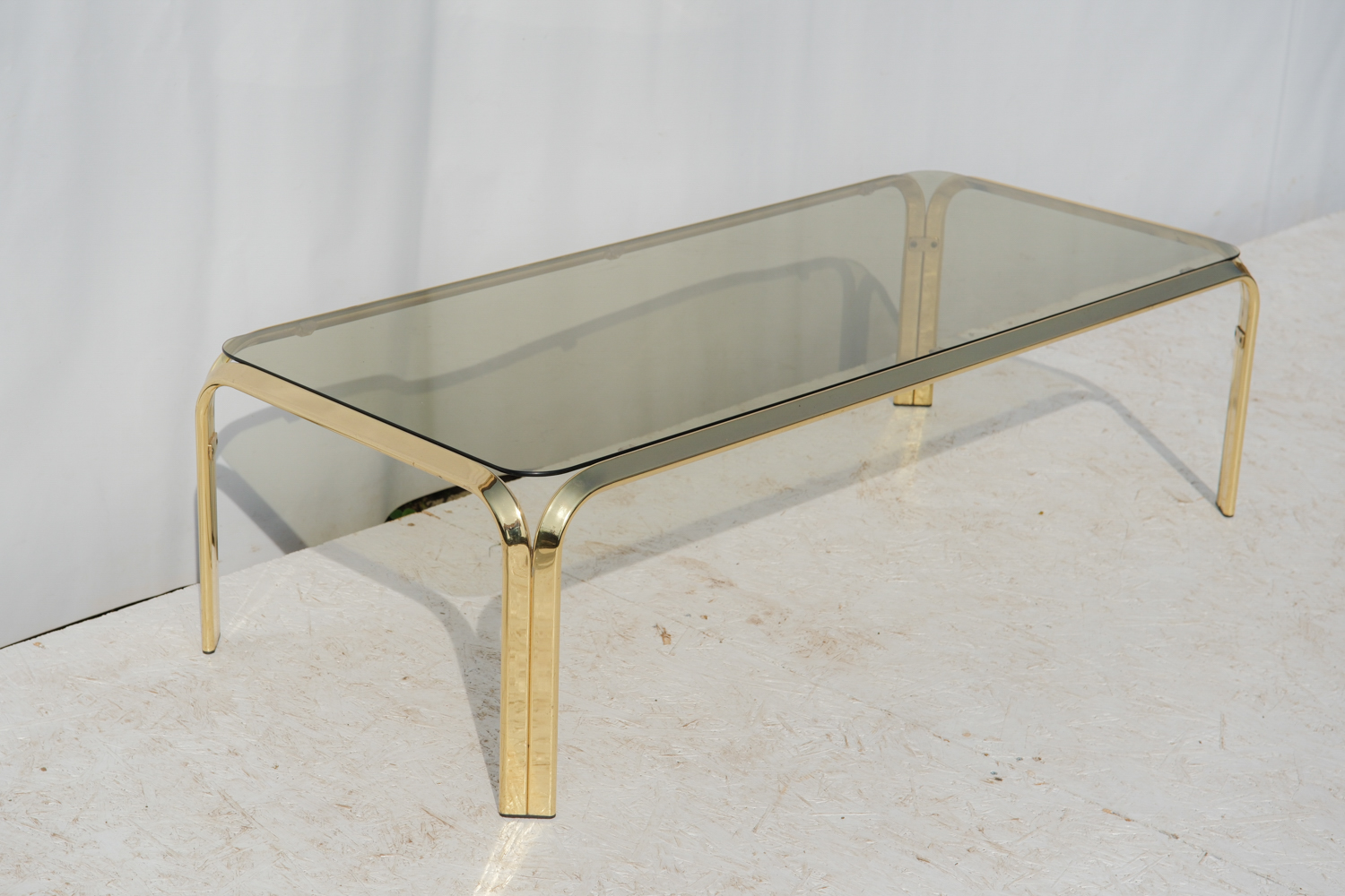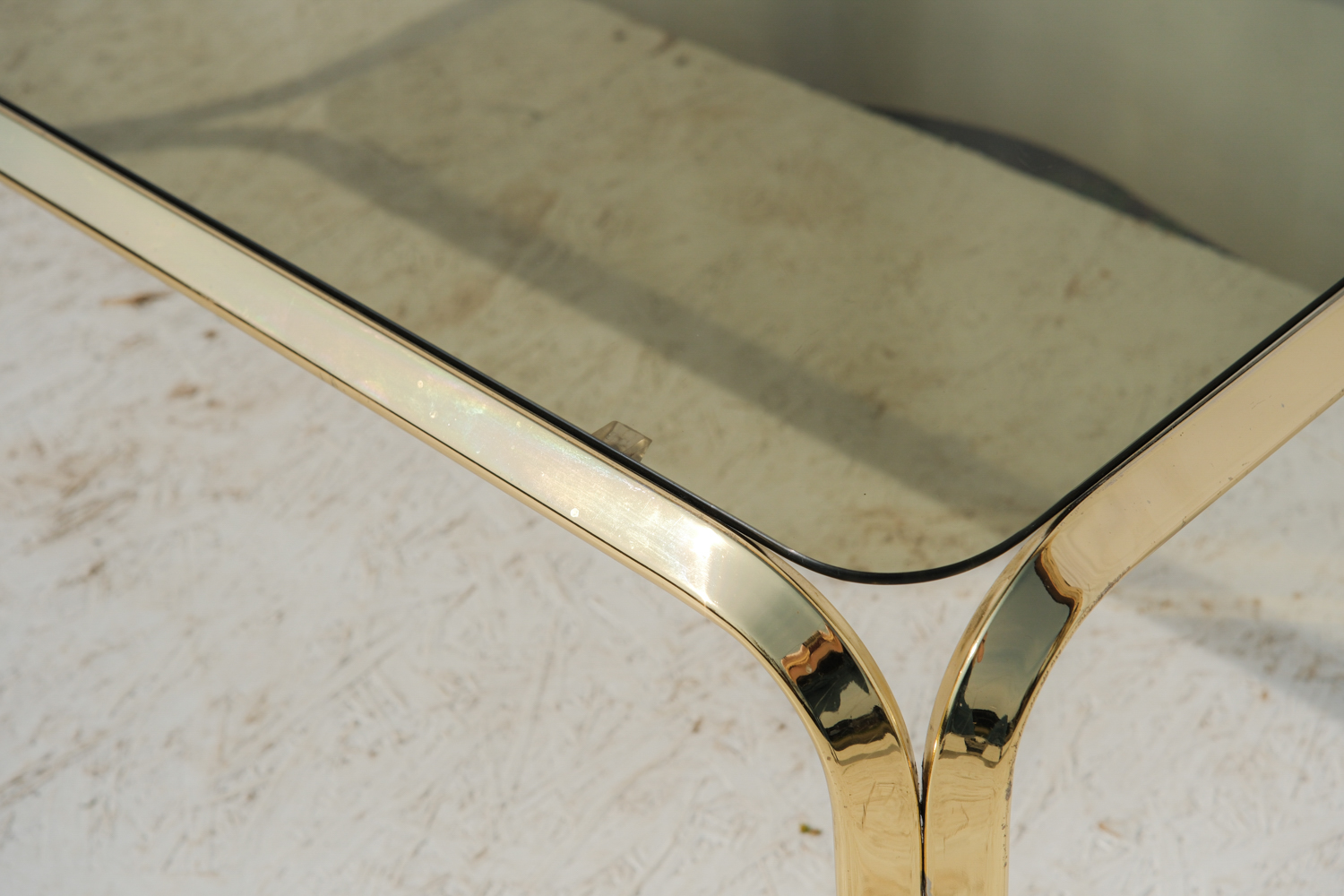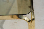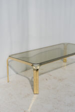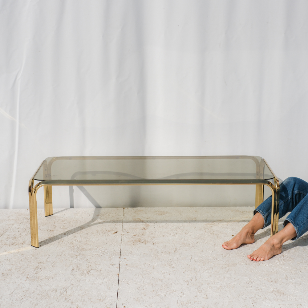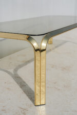 Elegantní konferenční stolek s konstrukcí z leštěné mosazi a kouřovou skleněnou deskou, jehož tvar vychází z italského glamour designu 70. let. Měkce zaoblené linie a plynulé napojení nohou na rám odkazují na estetiku, kterou ve své tvorbě rozvíjel například Romeo Rega – kombinaci technické preciznosti a dekorativní elegance.