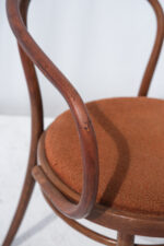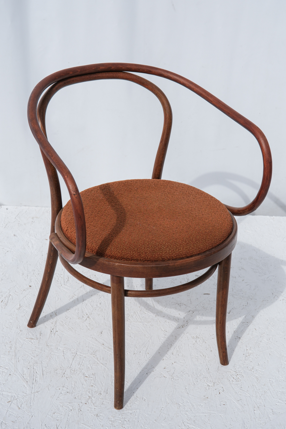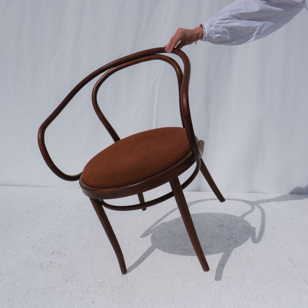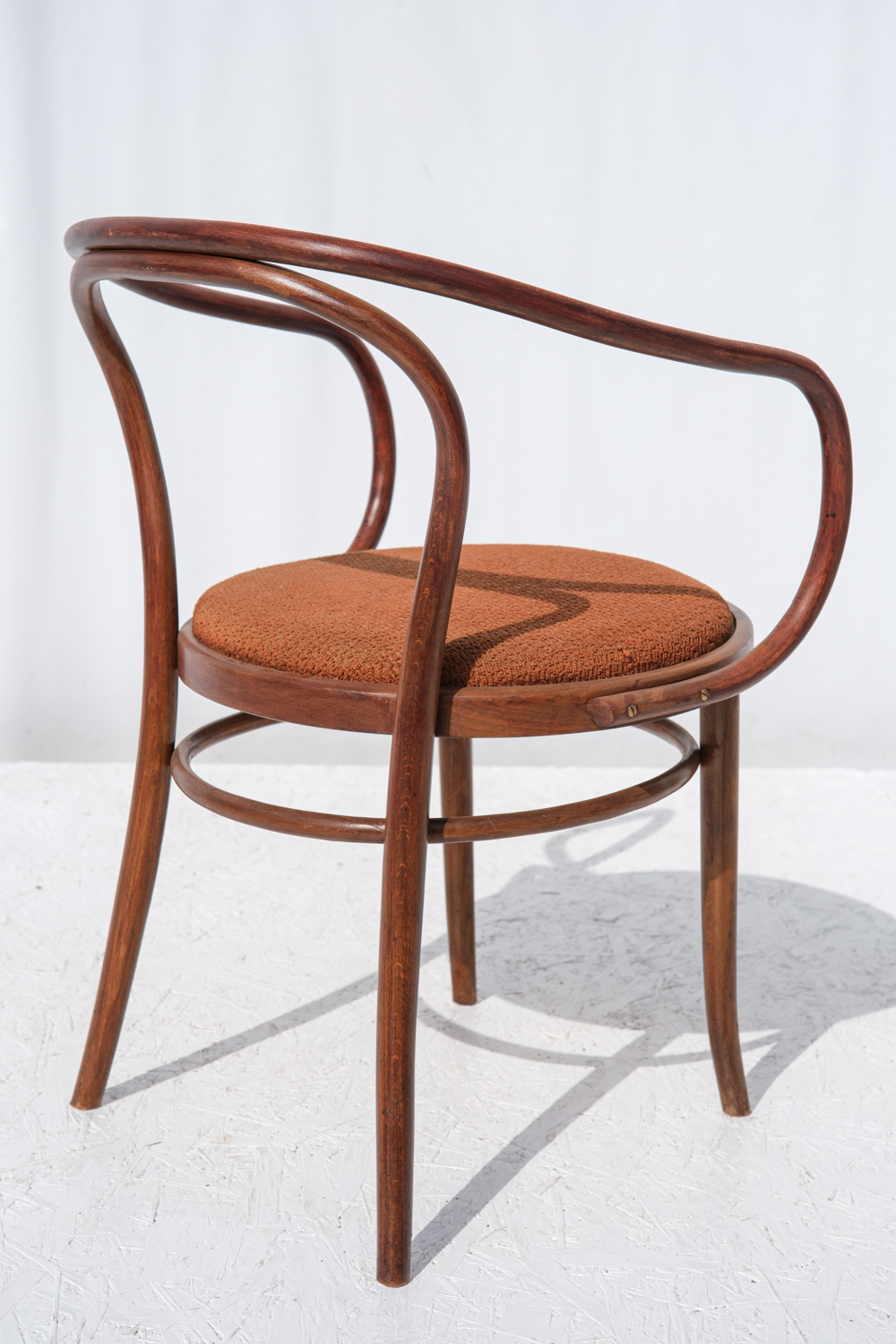 Čalouněné křeslo z ohýbaného dřeva, typologicky vycházející z ikonických modelů Thonet B-9, známých také jako „Corbusier chair“.