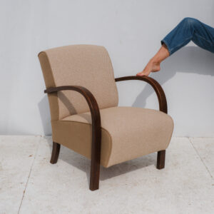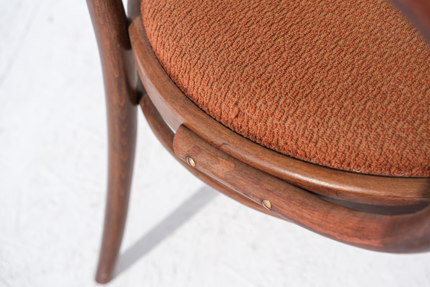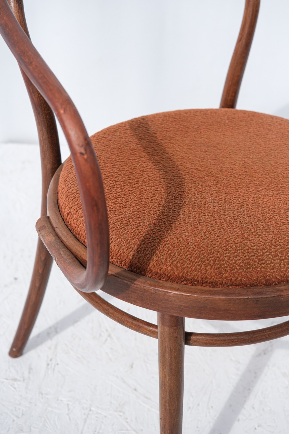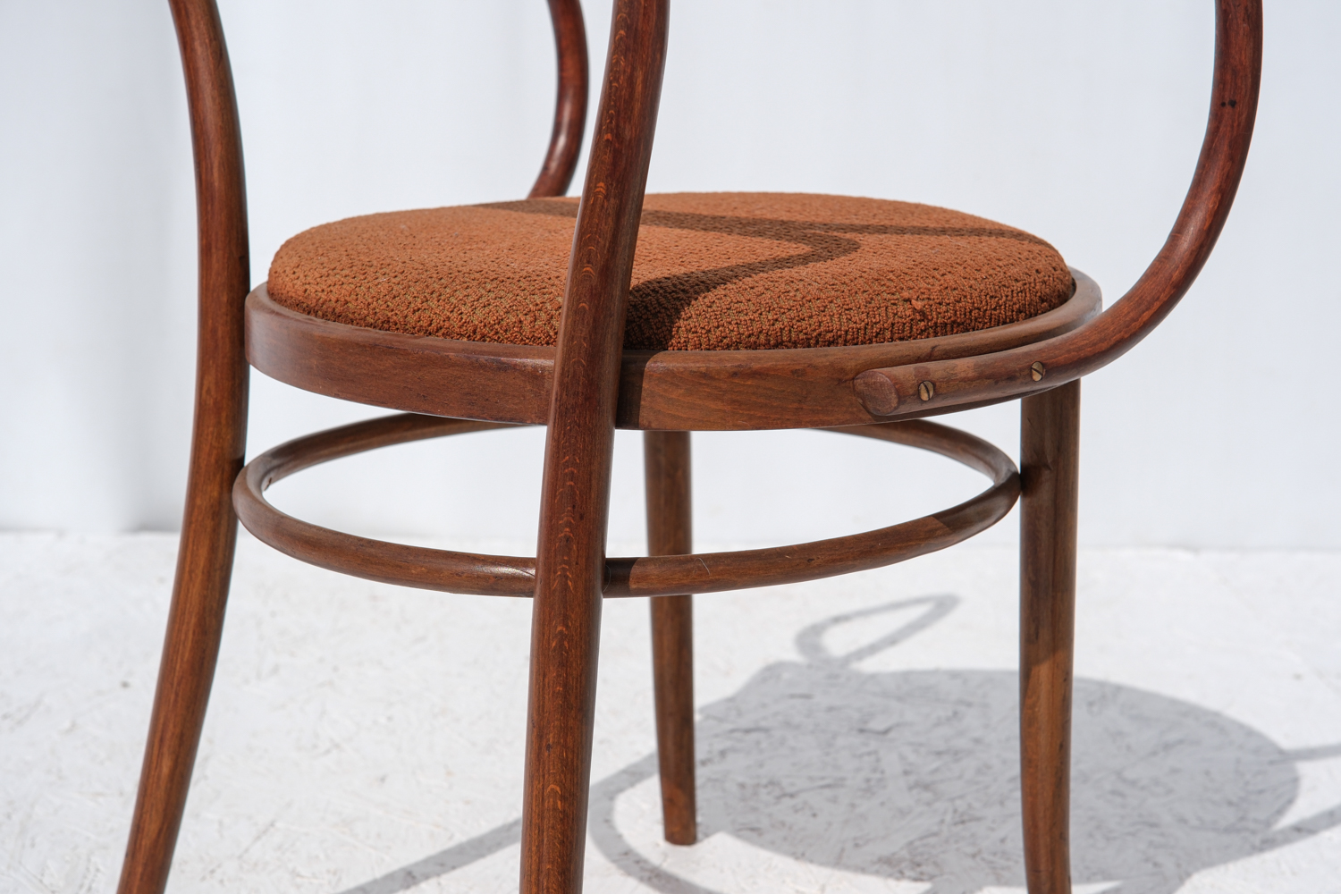Čalouněné křeslo z ohýbaného dřeva, typologicky vycházející z ikonických modelů Thonet B-9, známých také jako „Corbusier chair“.