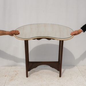 Charakteristický je plynulý oblouk, který spojuje opěradlo a područky do jednoho tvaru – jeden z nejvýraznějších principů technologie ohýbaného dřeva.