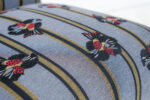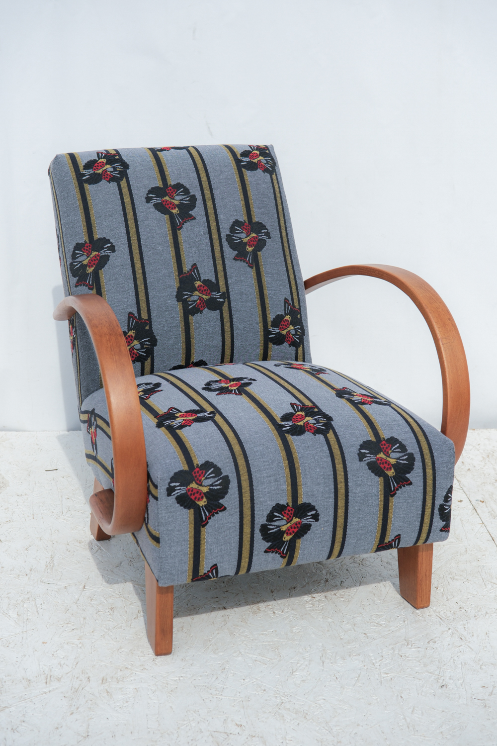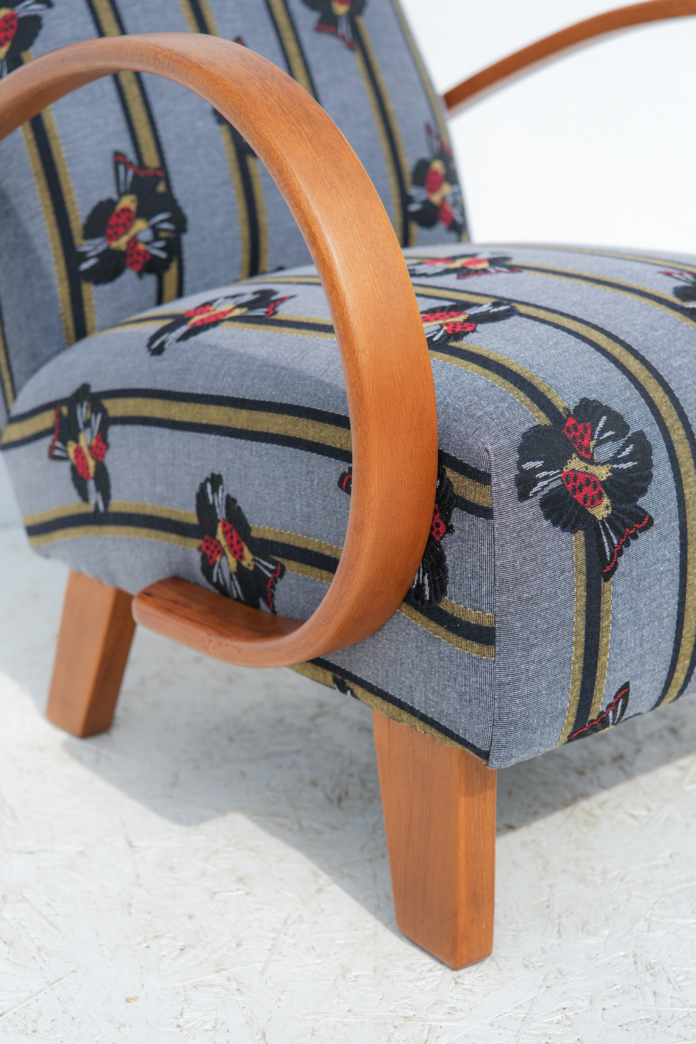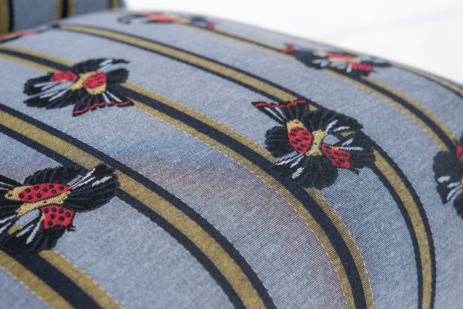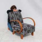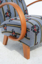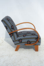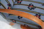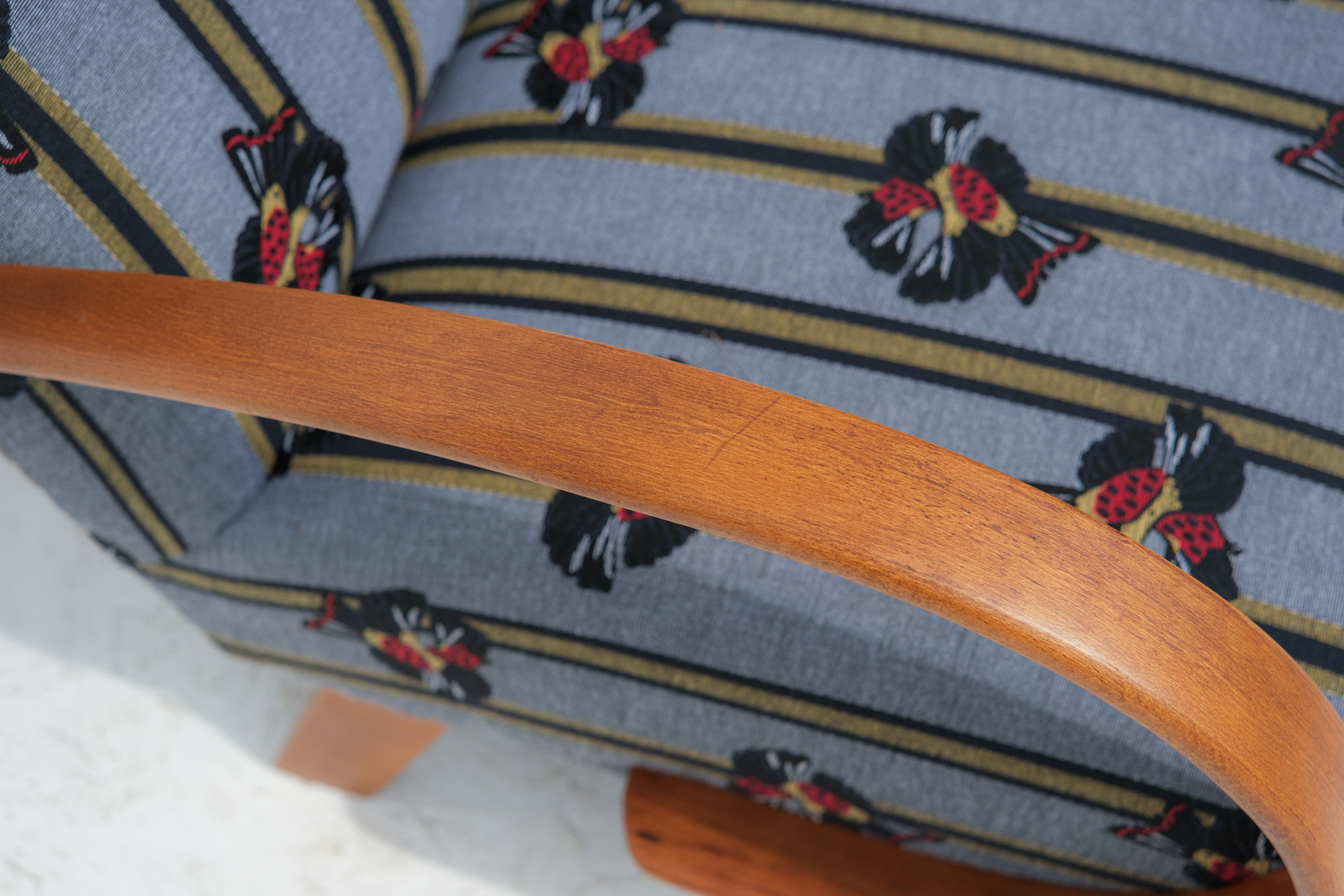 Křeslo prošlo kompletní renovací. Dřevěná konstrukce byla ošetřena do světlého, teplejšího tónu, který přirozeně navazuje na výrazný pruh v čalounění. Nová látka s grafickým vzorem přináší do klasického tvaru hravost a lehkou nadsázku, aniž by narušila jeho původní eleganci.