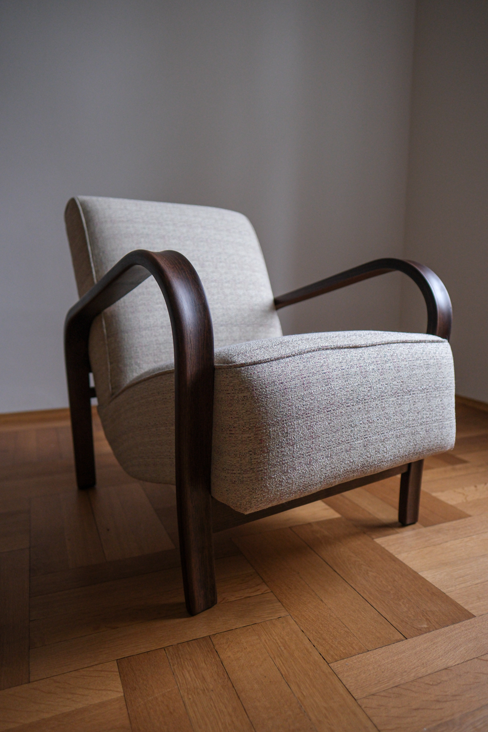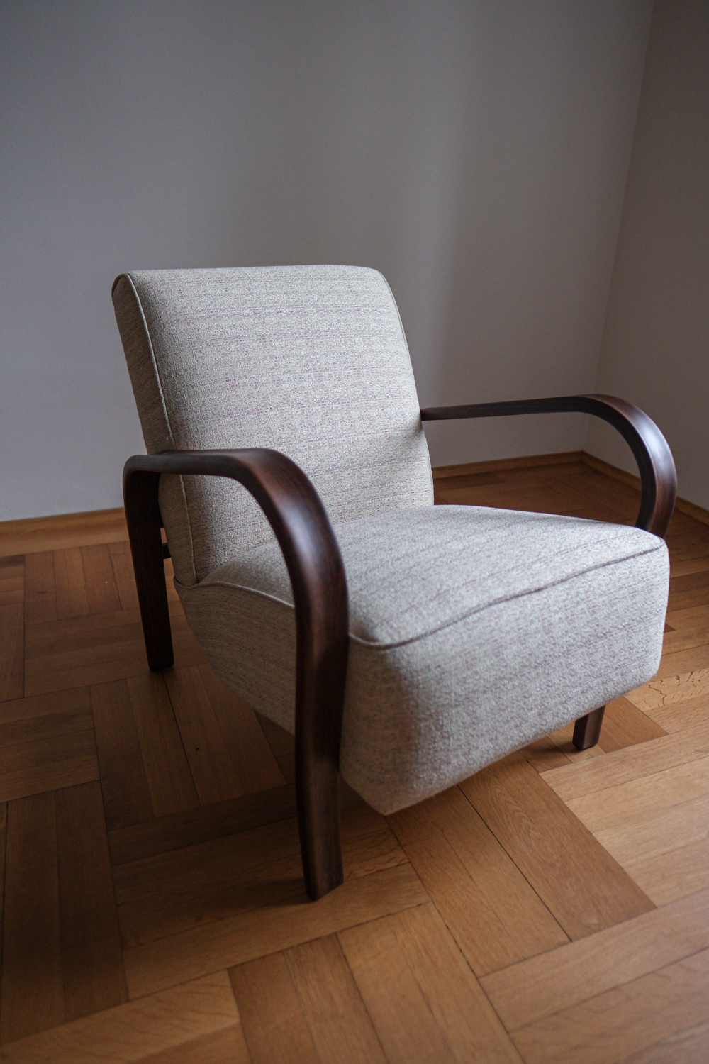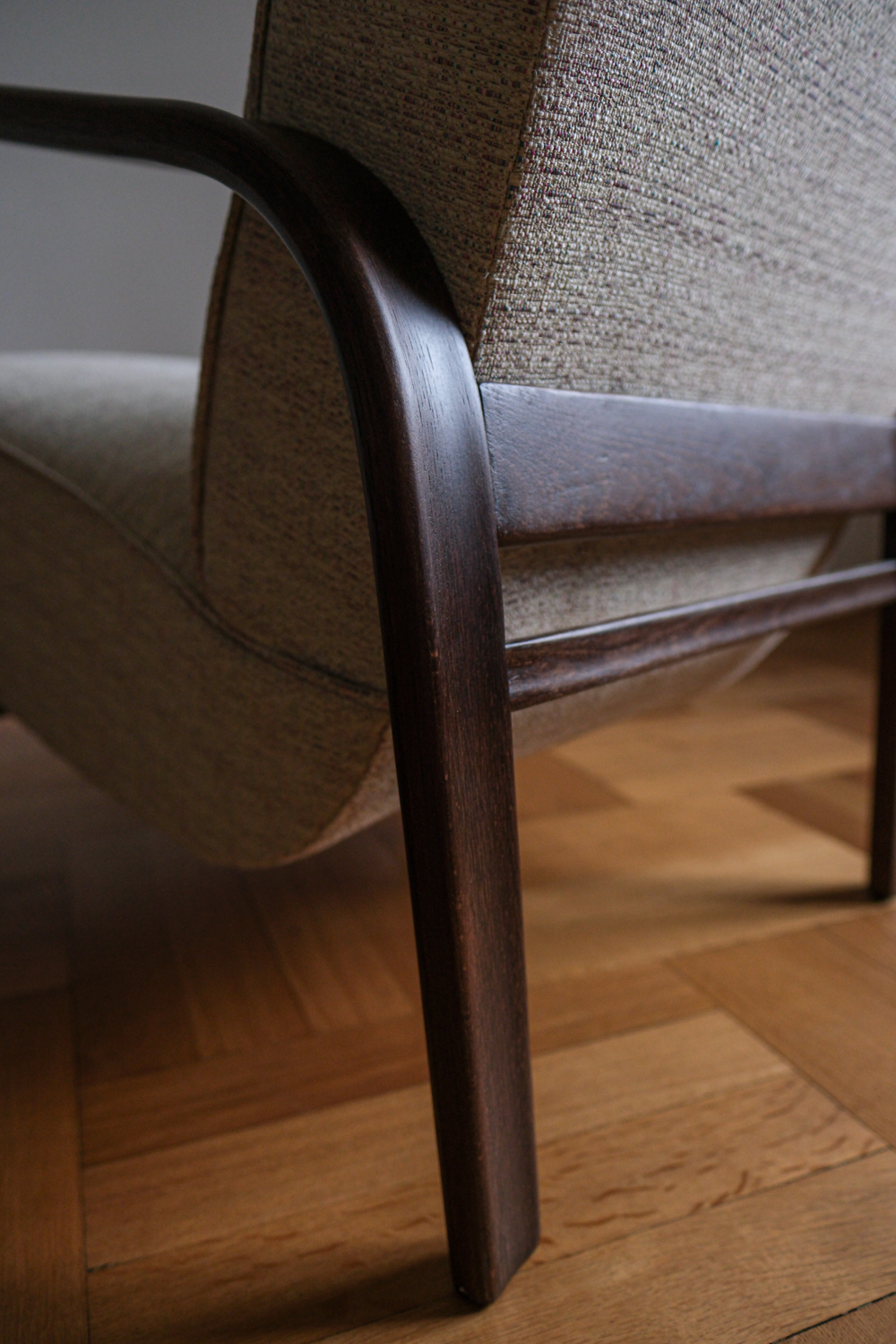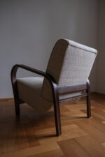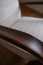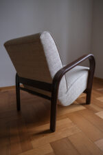 Křeslo prošlo kompletní renovací – od dřeva až po nové čalounění. Tmavě mořená konstrukce zvýrazňuje plynulost linií, zatímco světlá strukturovaná látka dodává celku lehkost a současný výraz. Výsledkem je křeslo, které působí klidně, útulně a s přirozenou elegancí. Nadčasový solitér, který krásně zapadne do moderního i tradičního interiéru.