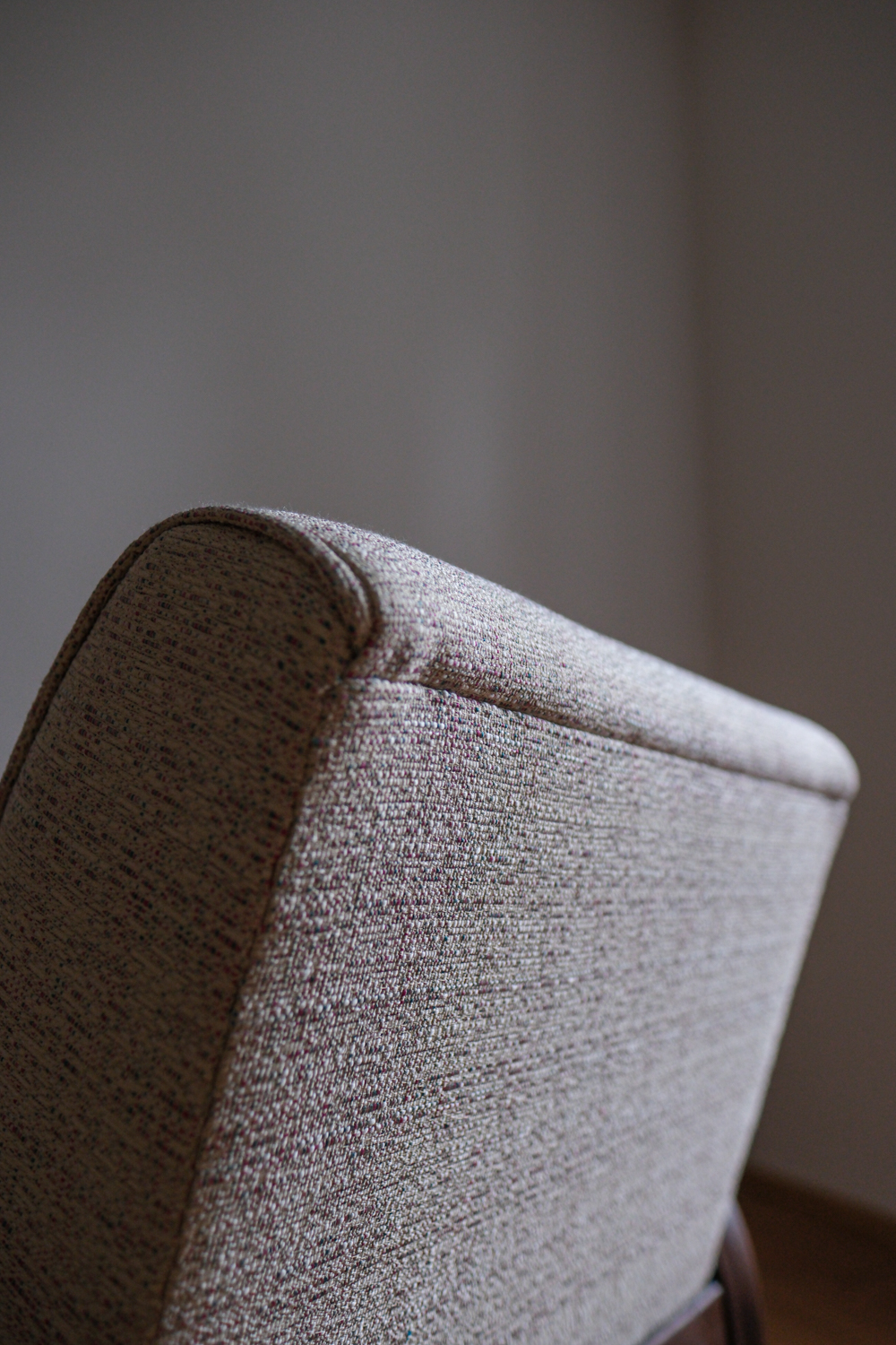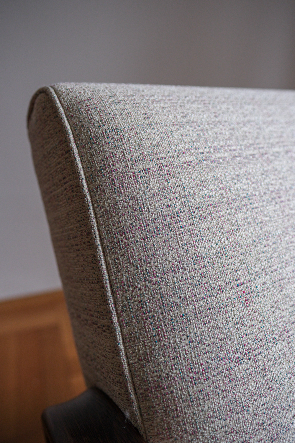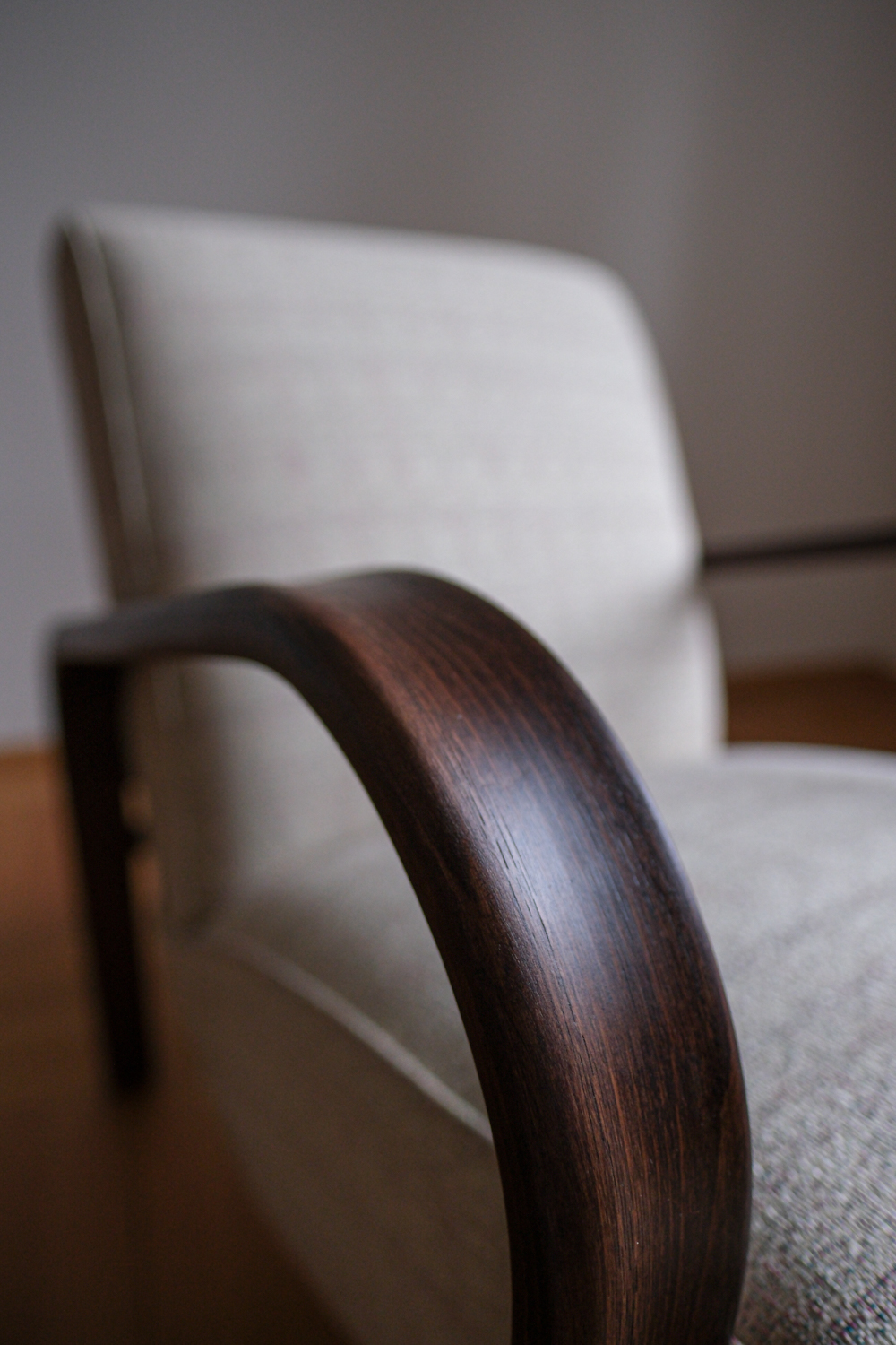 Křeslo prošlo kompletní renovací – od dřeva až po nové čalounění. Tmavě mořená konstrukce zvýrazňuje plynulost linií, zatímco světlá strukturovaná látka dodává celku lehkost a současný výraz. Výsledkem je křeslo, které působí klidně, útulně a s přirozenou elegancí. Nadčasový solitér, který krásně zapadne do moderního i tradičního interiéru.