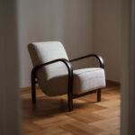 Křeslo s typickými elegantně ohýbanými područkami, které okamžitě prozradí rukopis dvojice Koželka a Kropáček. Jeho silueta je čistá, měkká a nadčasová, přesně taková, jakou známe z jejich poválečné tvorby.