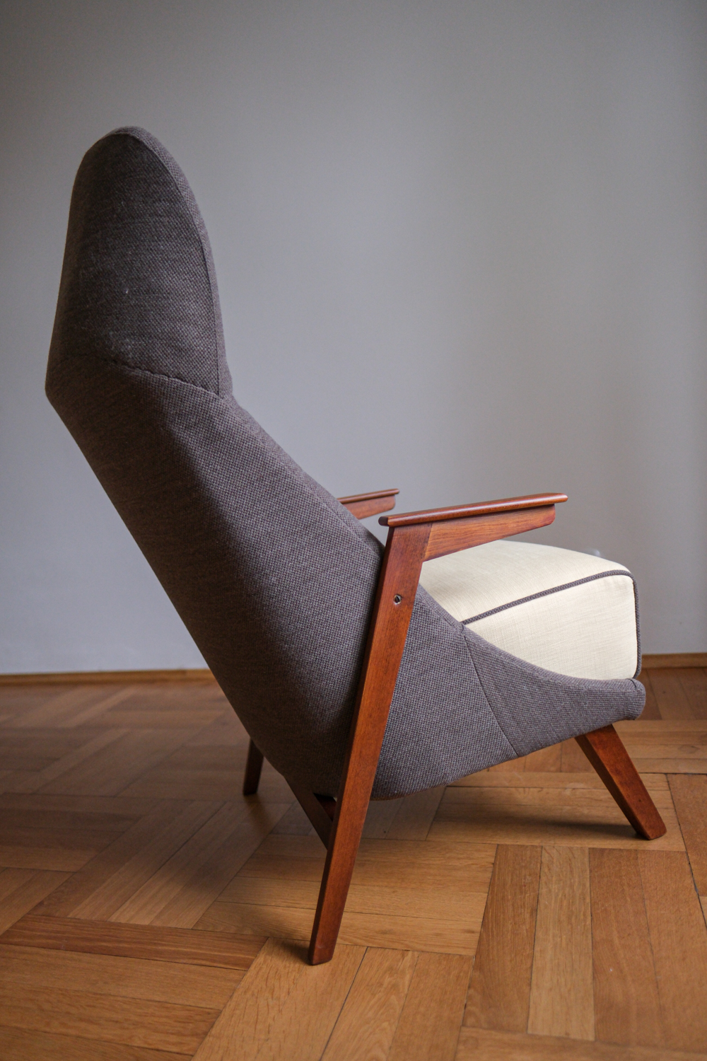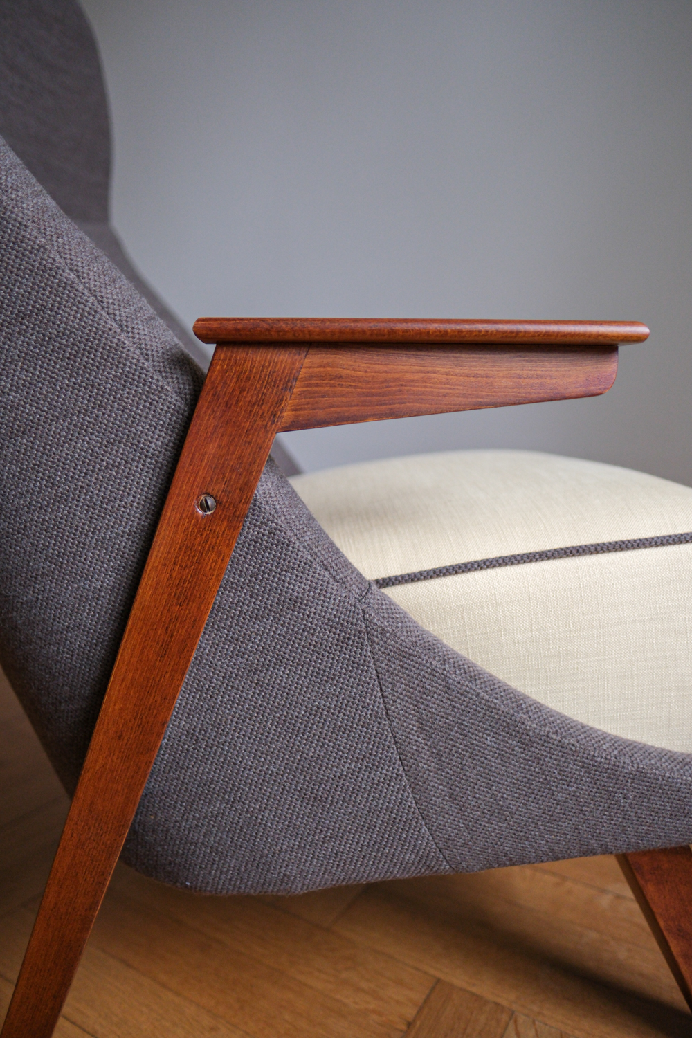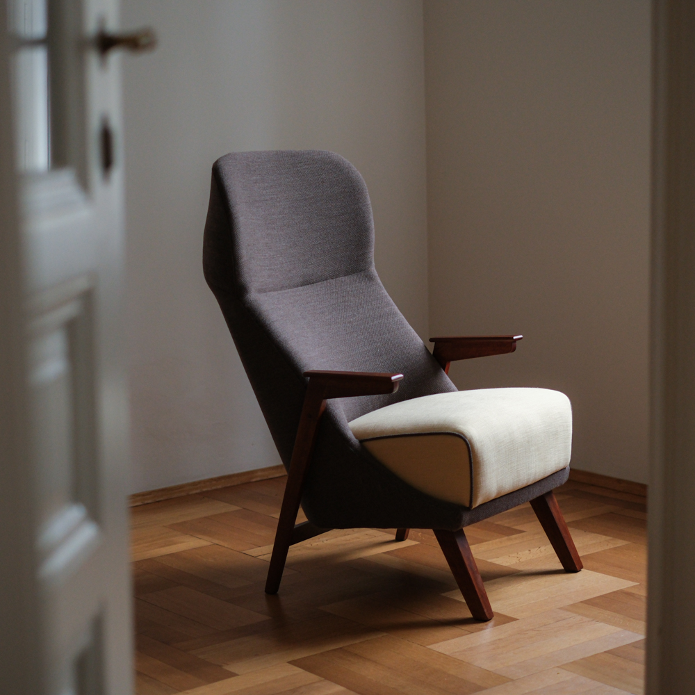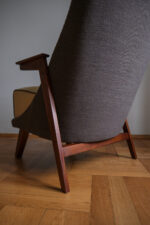 Křeslo prošlo kompletní renovací – obnovou dřeva i přečalouněním. Kombinace dvou látek podtrhuje jeho dynamický tvar: Čokoládově hnědá látka zvýrazňuje tvar křesla, zatímco sedák ve vanikově žluté přidává jemnost a kontrastní detail. Dřevěná konstrukce byla přebroušena a ošetřena tak, aby vynikla její teplá kresba.