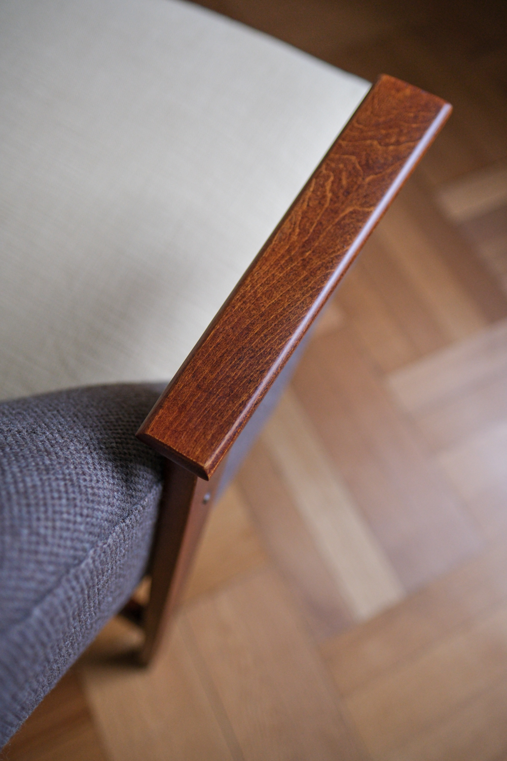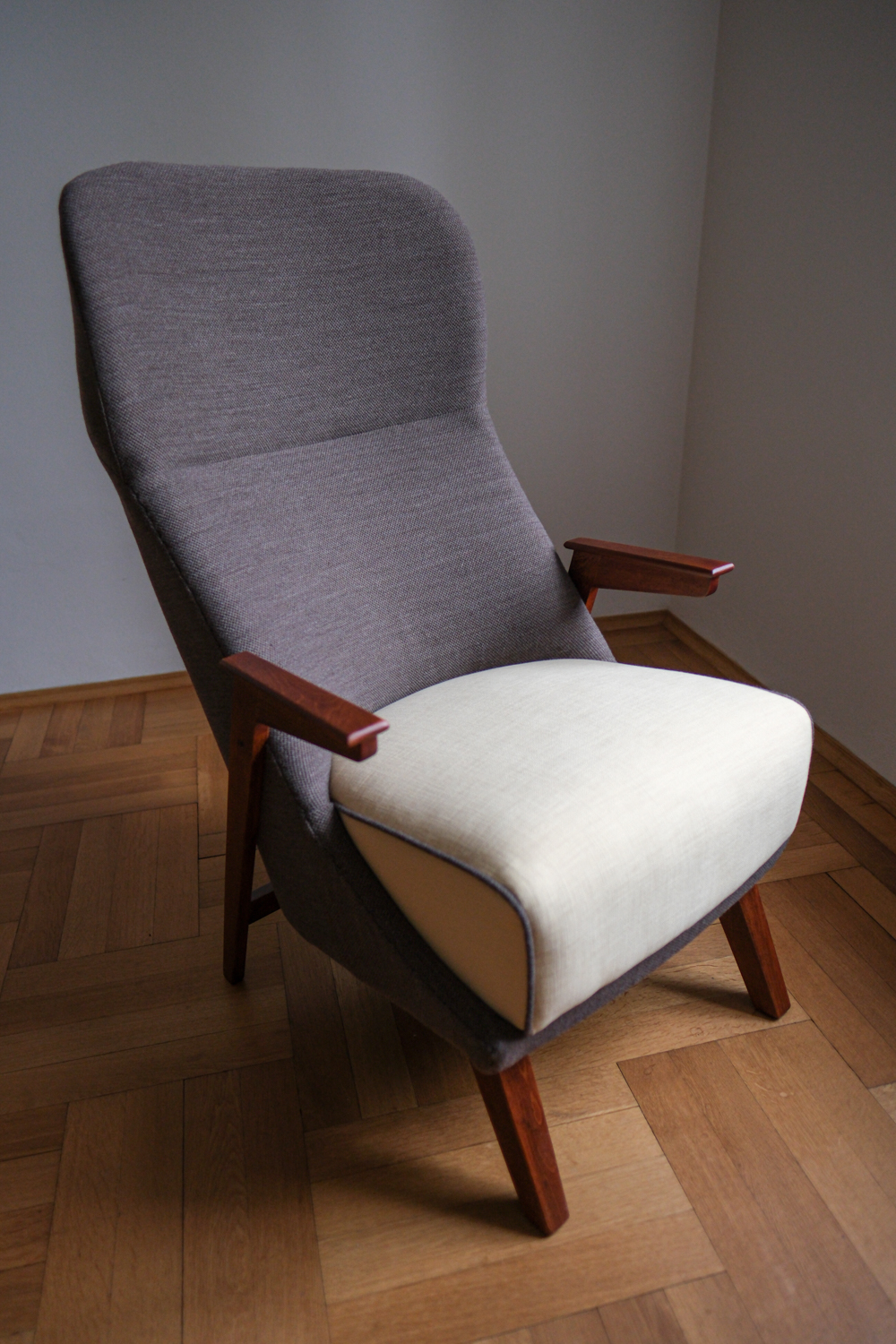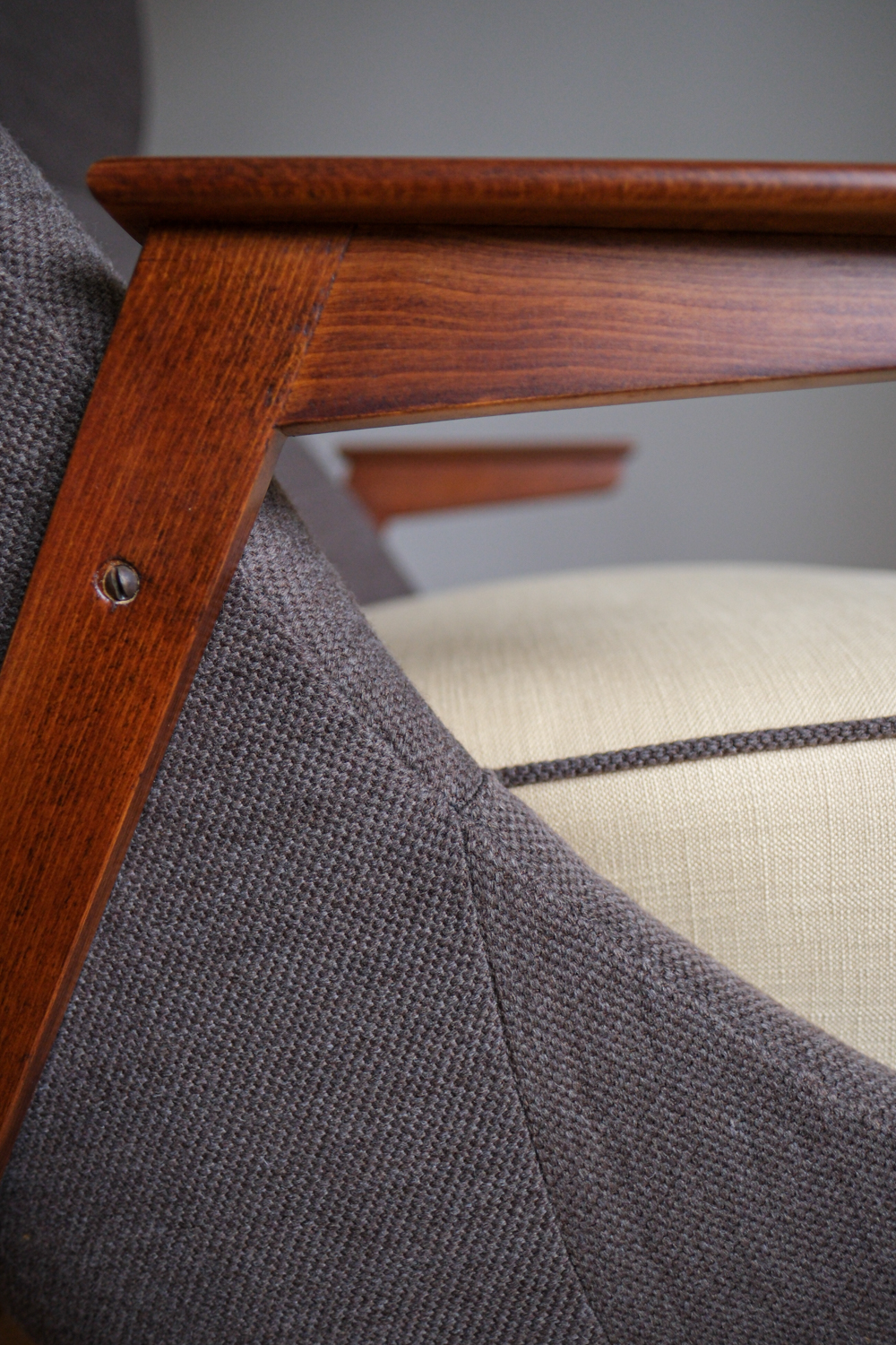Křeslo prošlo kompletní renovací – obnovou dřeva i přečalouněním. Kombinace dvou látek podtrhuje jeho dynamický tvar: Čokoládově hnědá látka zvýrazňuje tvar křesla, zatímco sedák ve vanikově žluté přidává jemnost a kontrastní detail. Dřevěná konstrukce byla přebroušena a ošetřena tak, aby vynikla její teplá kresba.