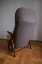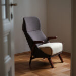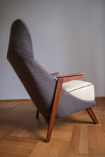 Křeslo s výraznou, až sošnou siluetou, která působí lehce a sebejistě zároveň. Štíhlá vysoká opěrka plynule přechází do sedáku, zatímco úzké dřevěné područky dodávají celku elegantní, téměř modernistický rytmus. Autor není znám, ale tvarosloví jasně odkazuje k českému designu 60. let – k době, kdy se hledala kombinace pohodlí, čistých linií a výrazného profilu.