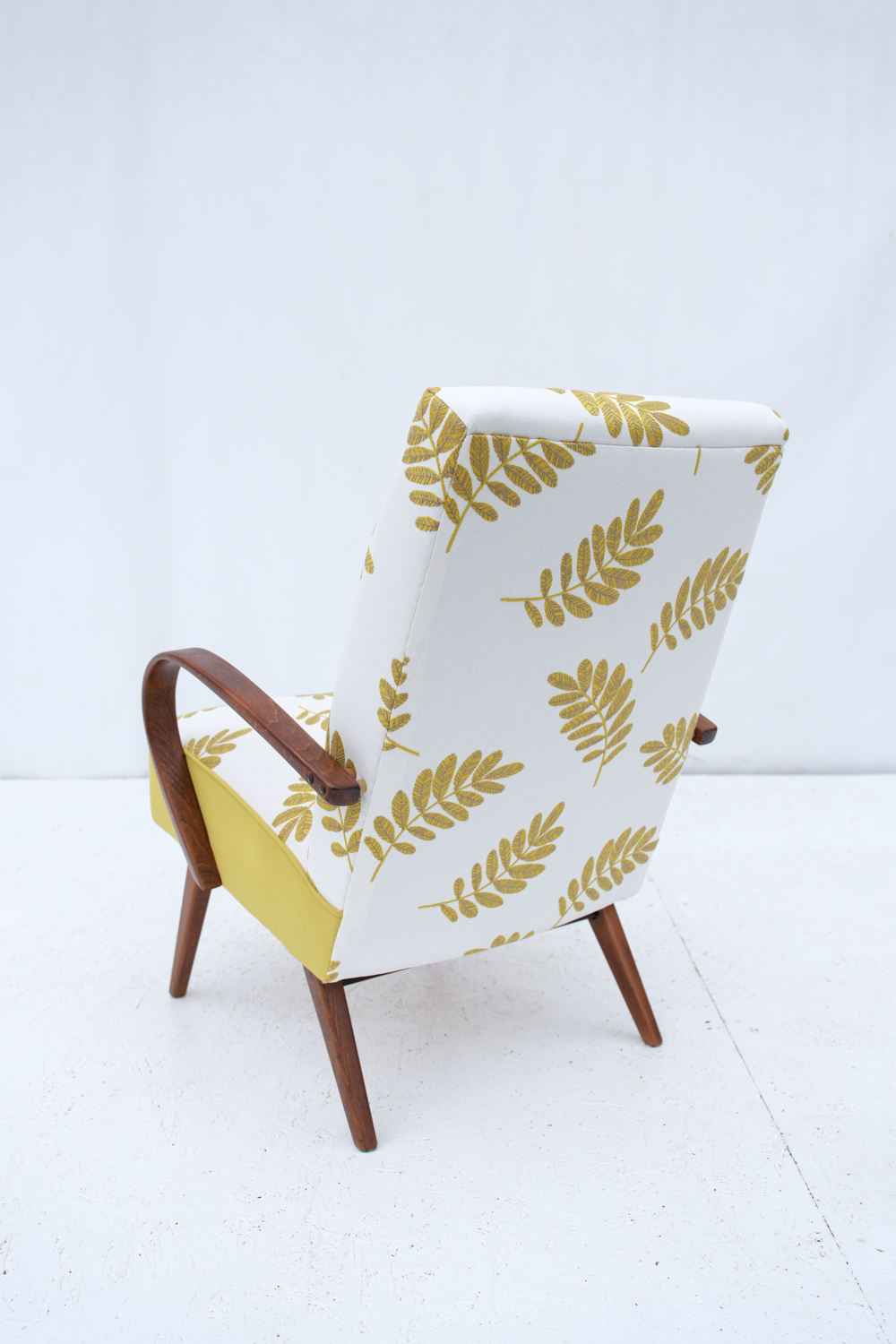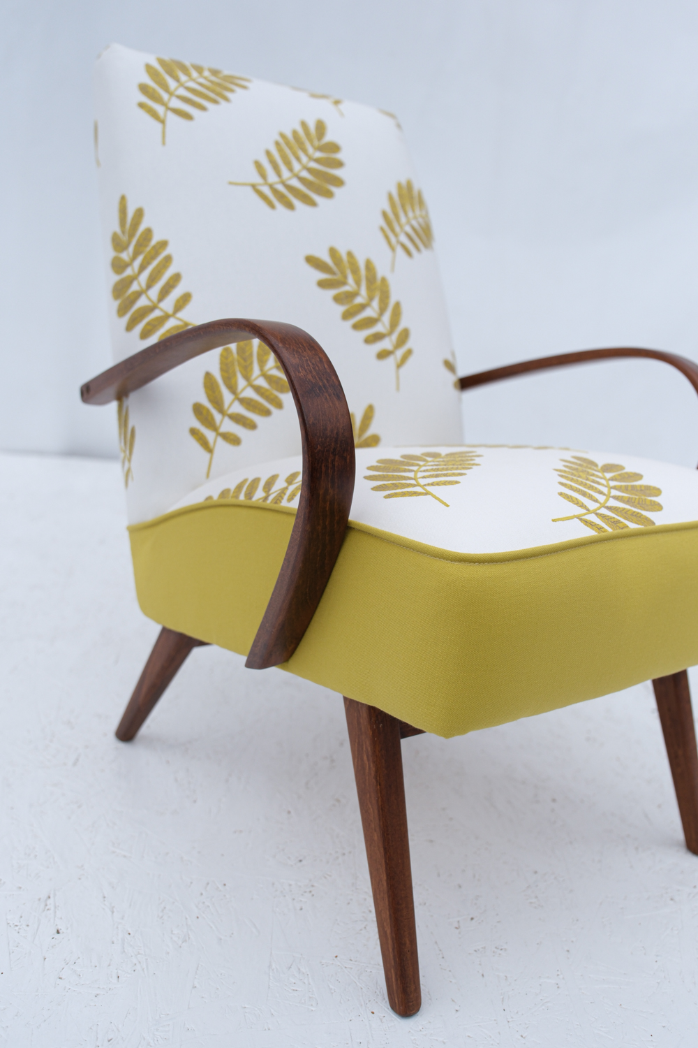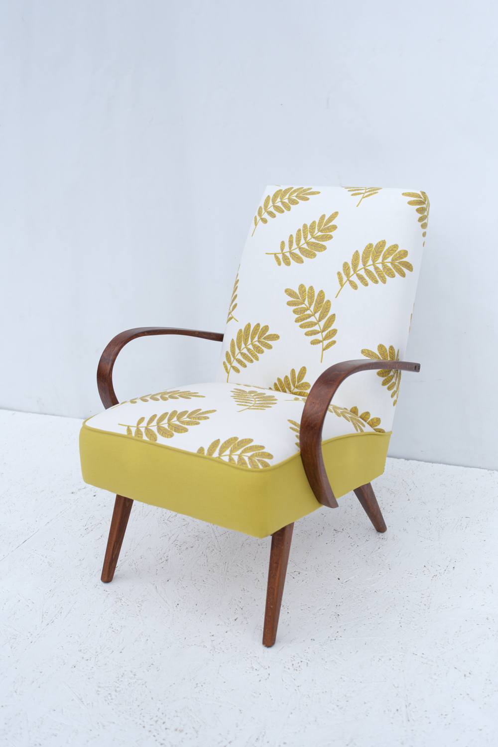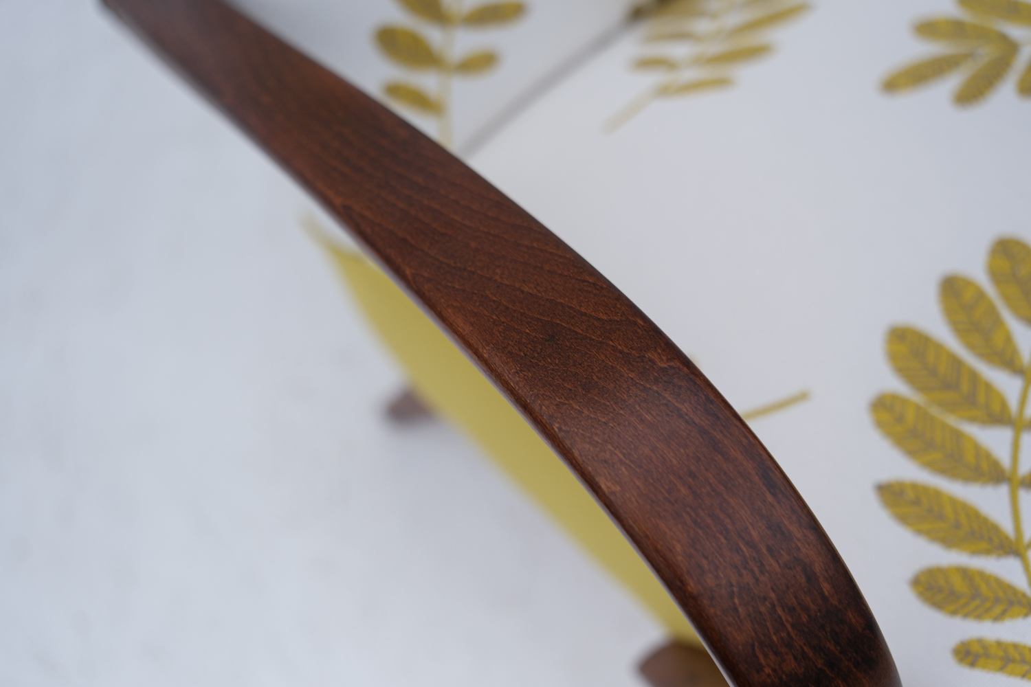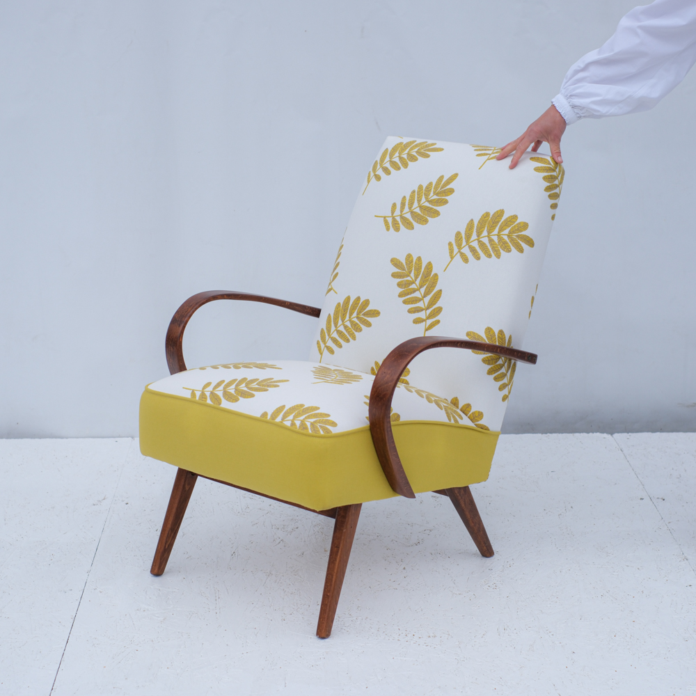 Čalouněné křeslo ze 60. let minulého století dle návrhu Jaroslava Šmídka pro společnost Ton, kde je pro výrobu dále upravoval Antonín Šuman. Křeslo – model 6951 – prošlo celkovou renovací. Nové čalounění kombinuje látku s rostlinným motivem a jednobarevnou látku spodního lemu v odstínu odpovídajícím barvě listů. Dřevo konstrukce je provedeno v tmavém tónu. Celek působí výrazněji než naše obvyklé realizace, ale stále si zachovává klidný, svěží charakter.
