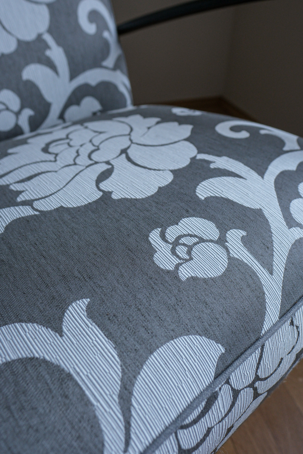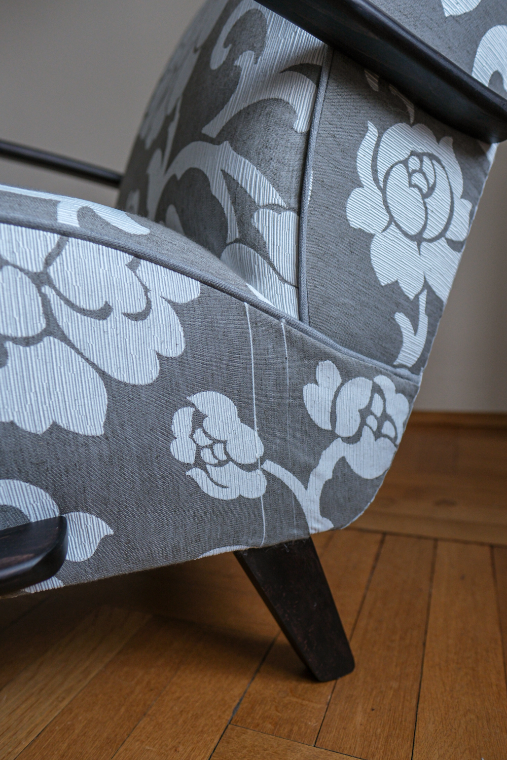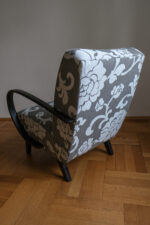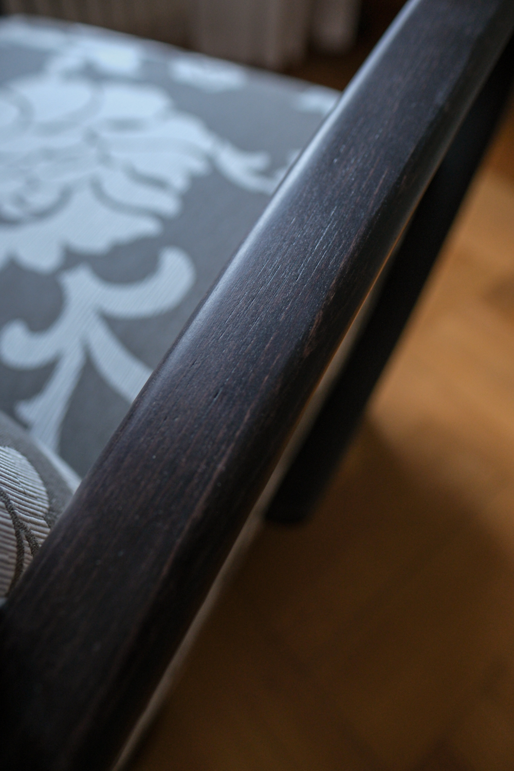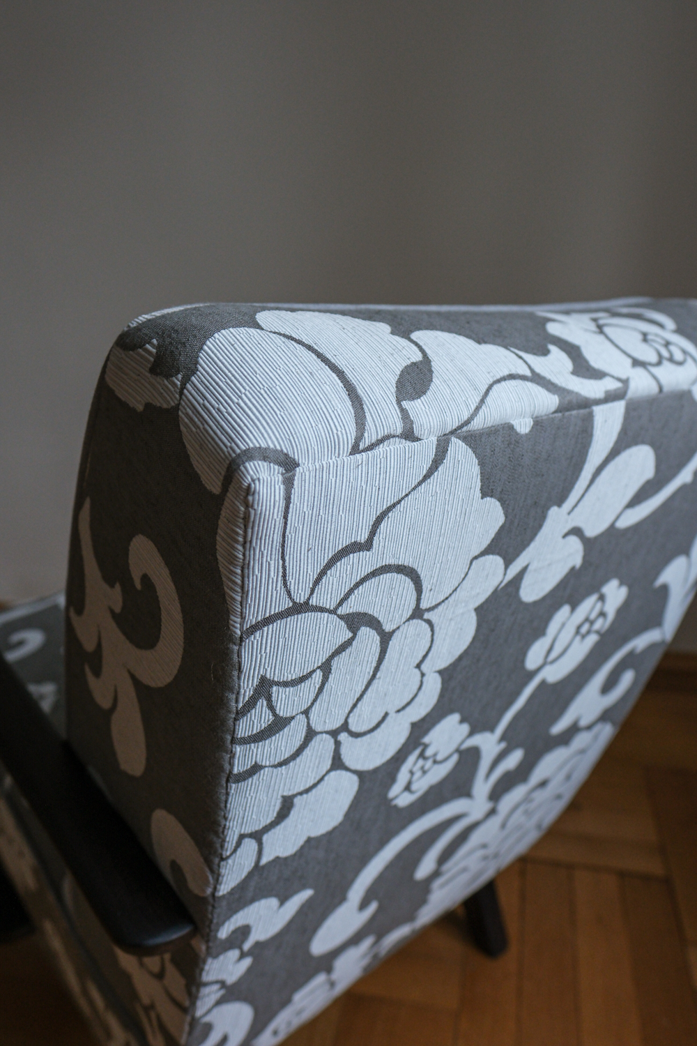 Křeslo prošlo kompletní renovací. Dřevěné části byly znovu ošetřeny do hlubokého tmavého tónu, který krásně kontrastuje s novým čalouněním. Vybraný látkový vzor – velkorysé květy v jemném šedobílém provedení – dodává modelu C svěží, výrazný a zároveň harmonický charakter. Působí současně, ale respektuje proporce a styl originálu.