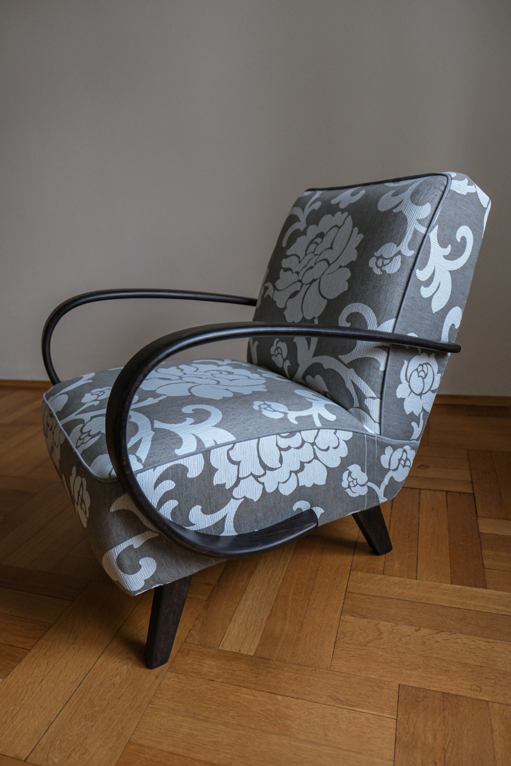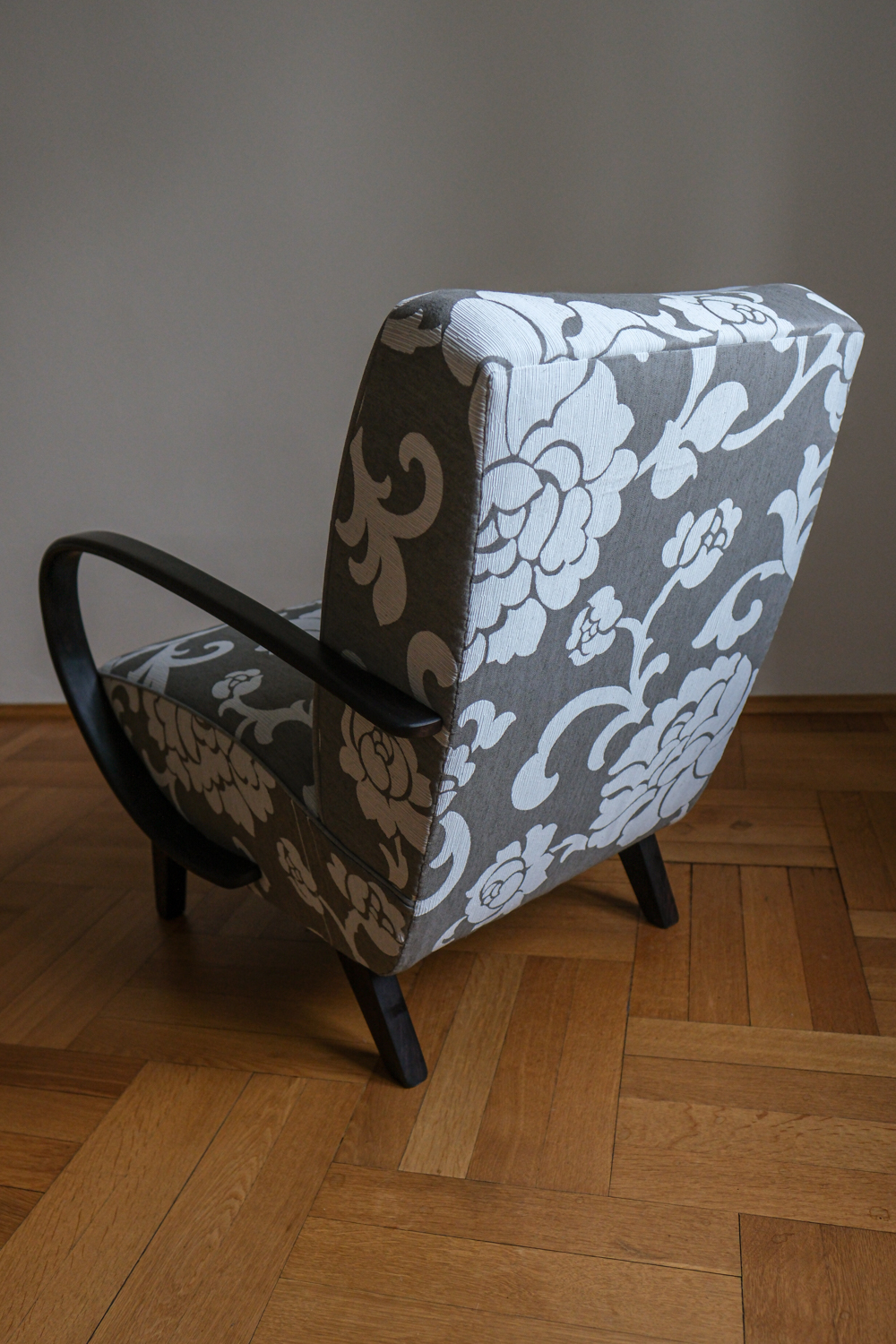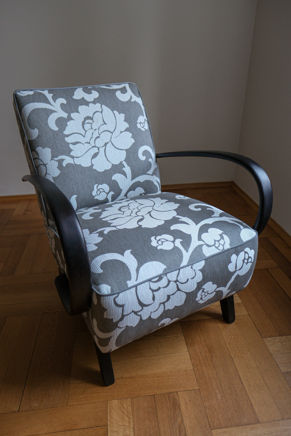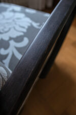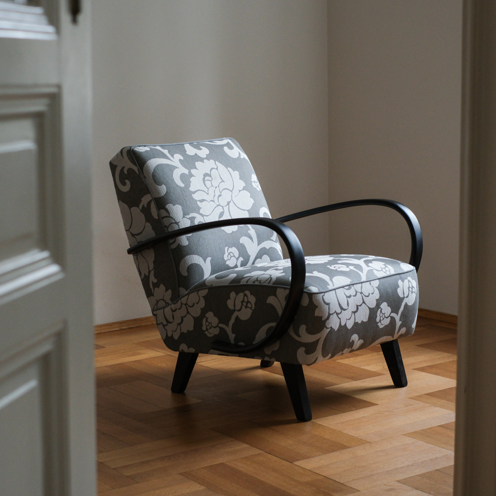Křeslo prošlo kompletní renovací. Dřevěné části byly znovu ošetřeny do hlubokého tmavého tónu, který krásně kontrastuje s novým čalouněním. Vybraný látkový vzor – velkorysé květy v jemném šedobílém provedení – dodává modelu C svěží, výrazný a zároveň harmonický charakter. Působí současně, ale respektuje proporce a styl originálu.