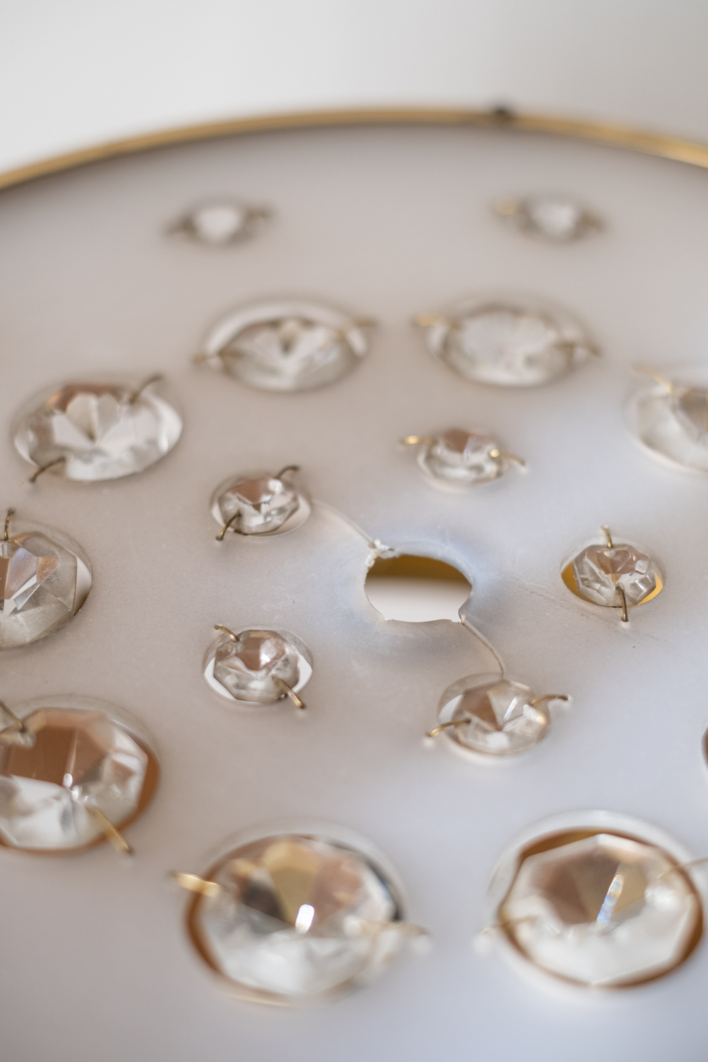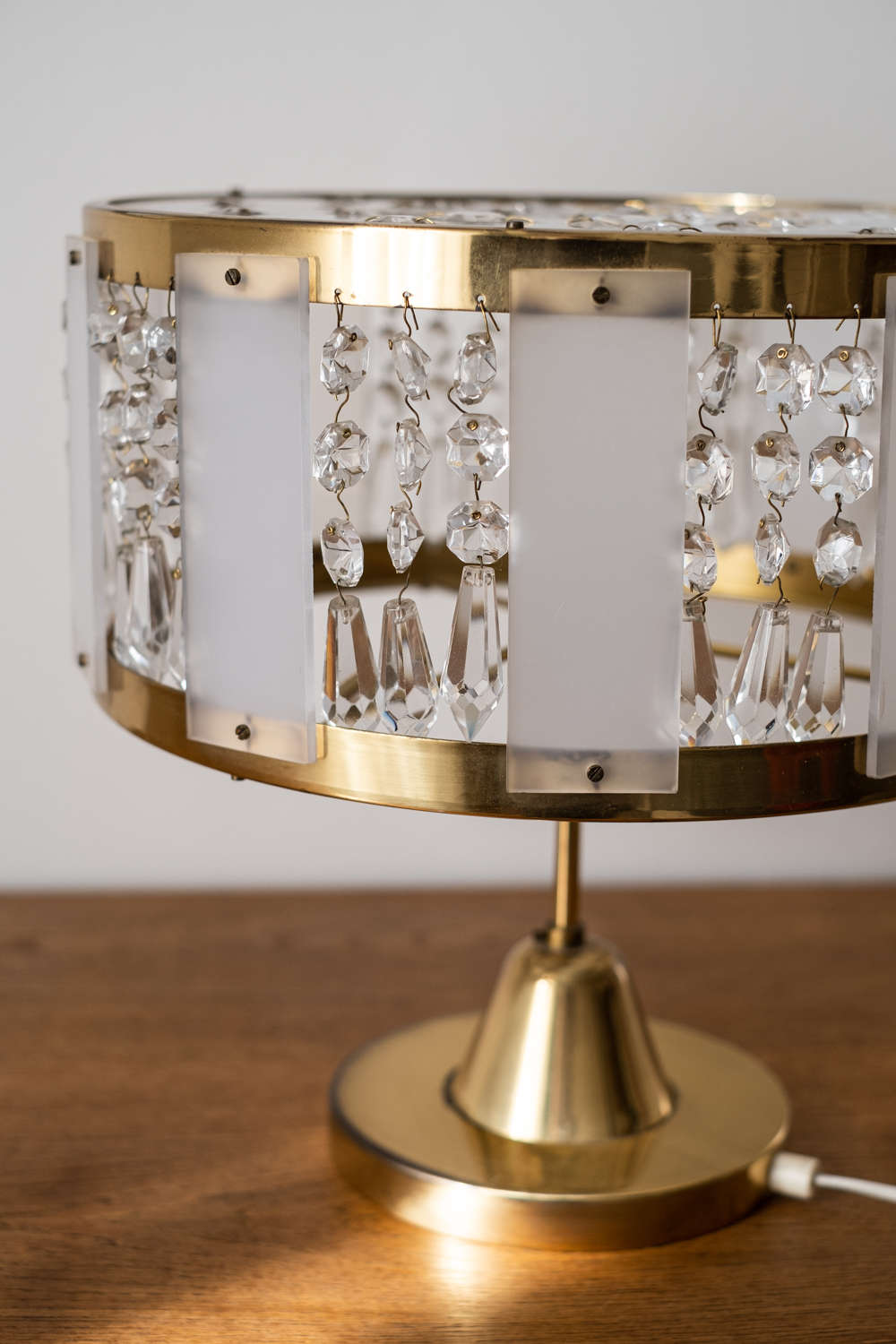 Velmi neobvyklá lampa především kombinací materiálů pochází ze 70. let minulého století. Návrhář zde propojil křšťál, s plastem a mosazí. Vyrobena byla v Jablonecké sklárně v Novém Bydžově. Jde o typ 5021/2. 250 V
