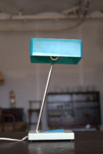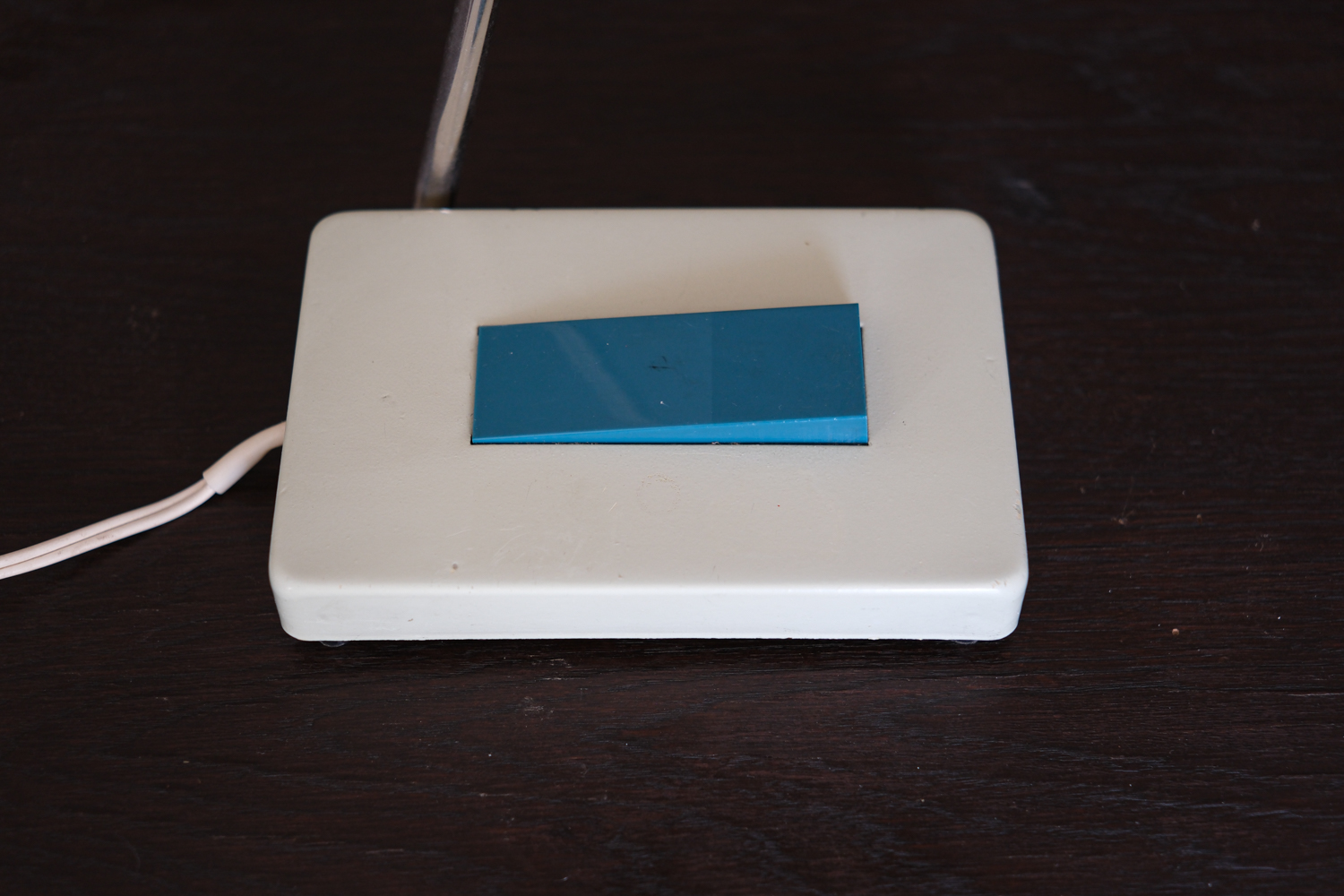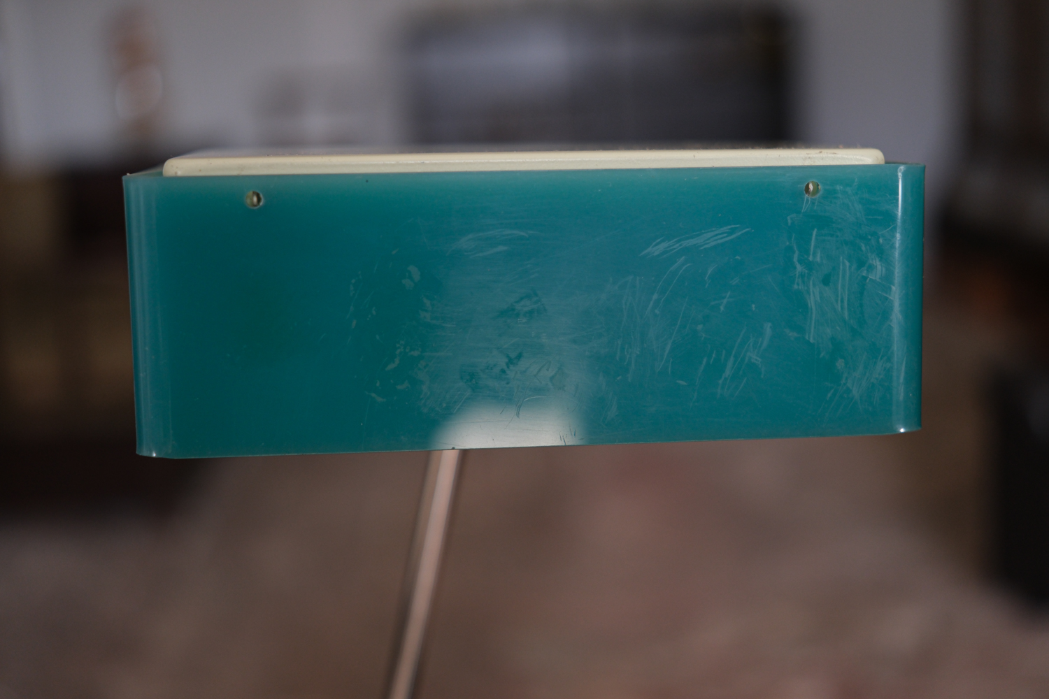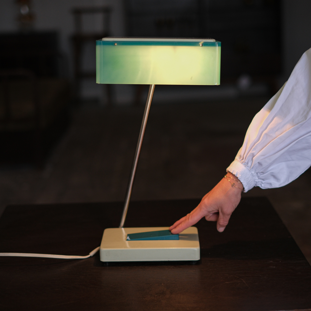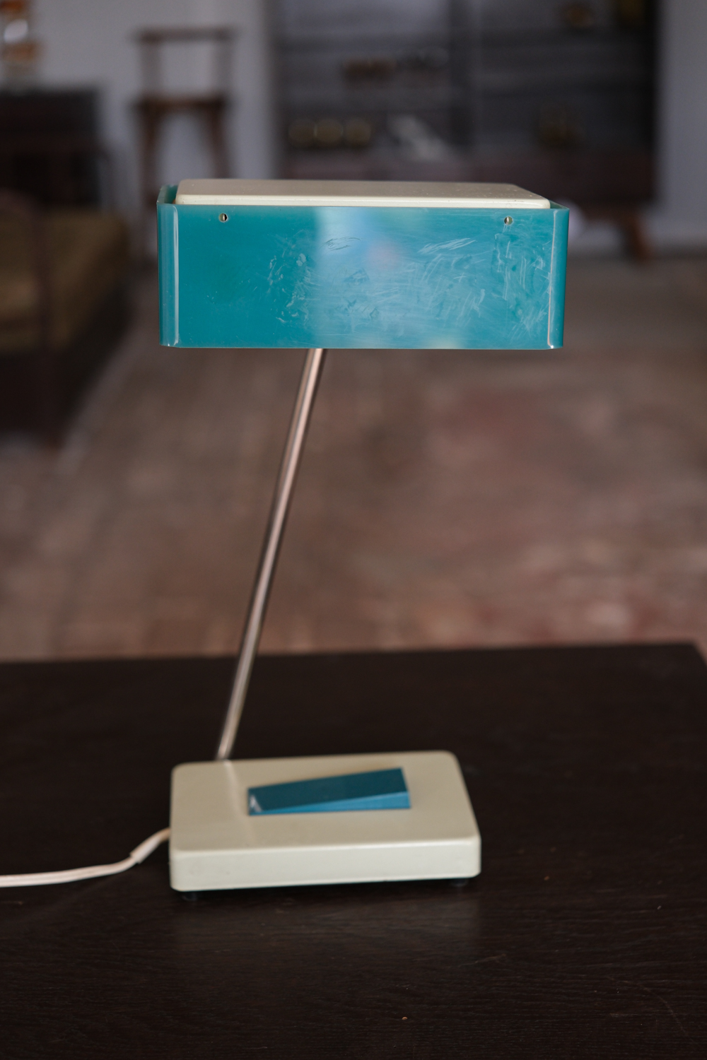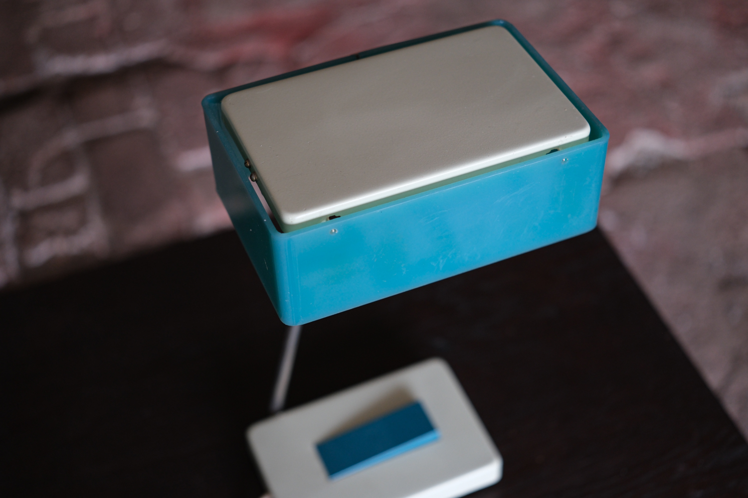 Stolní lampa s výrazně geometrickým, až lehce „grafickým“ pojetím, typickým pro 70. léta. Kombinace mléčného plastového stínidla s tyrkysovým akcentem a jednoduché kovové nohy působí hravě, ale zároveň čistě a přehledně.