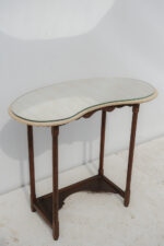Elegantní konzolový stolek s typickou „ledvinovou“ deskou, která mu dodává jemně organický, přirozeně plynulý tvar. Celek vychází z klasicizujících principů a nese odkaz stylu Ludvíka XVI., patrný zejména v proporcích a tvarování nohou.