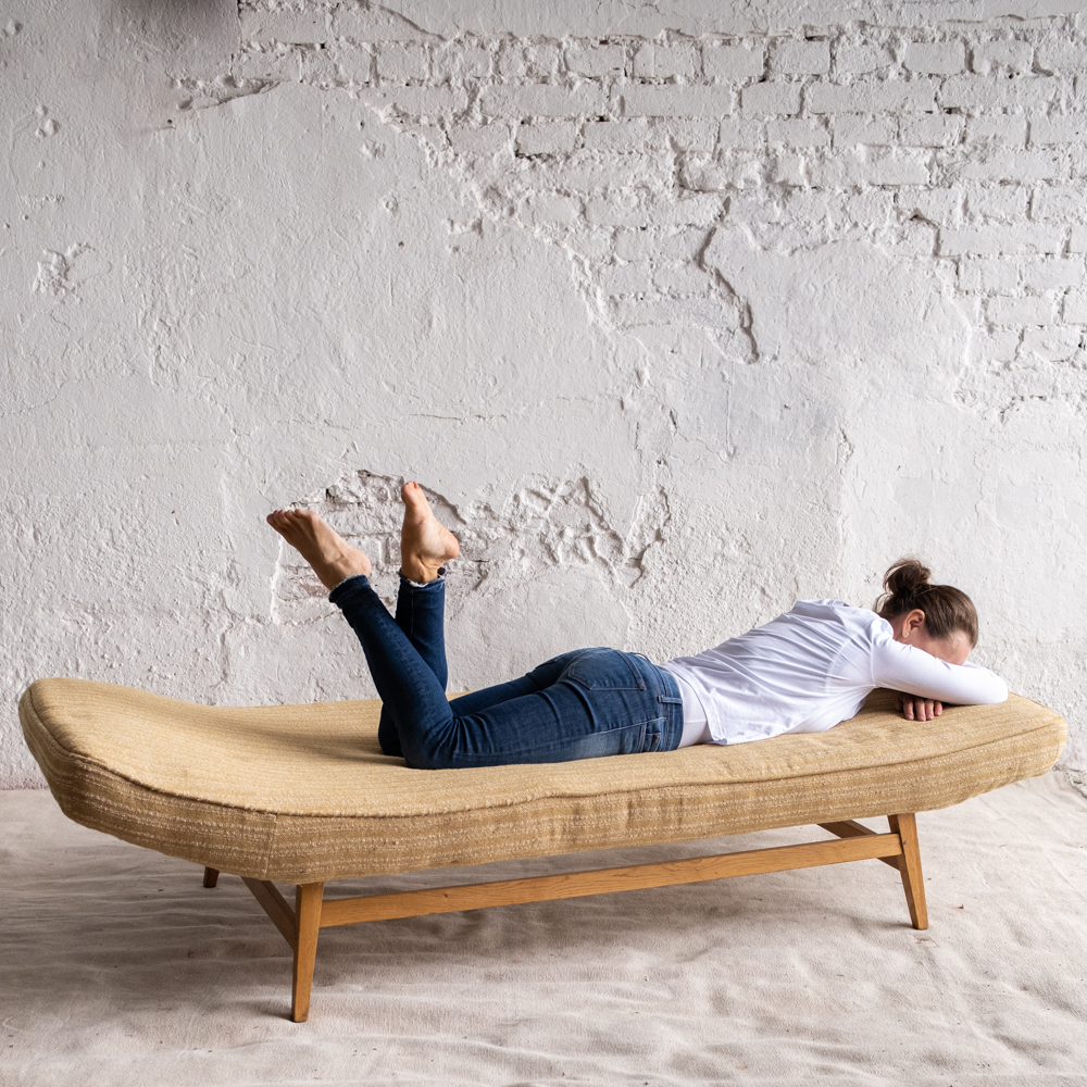 Nadčasová minimalistická lenoška ÚLUV, která zaujme svým tvarem. Není naprosto rovná, ale je mírně zvednutá v úrovni hlavy.