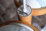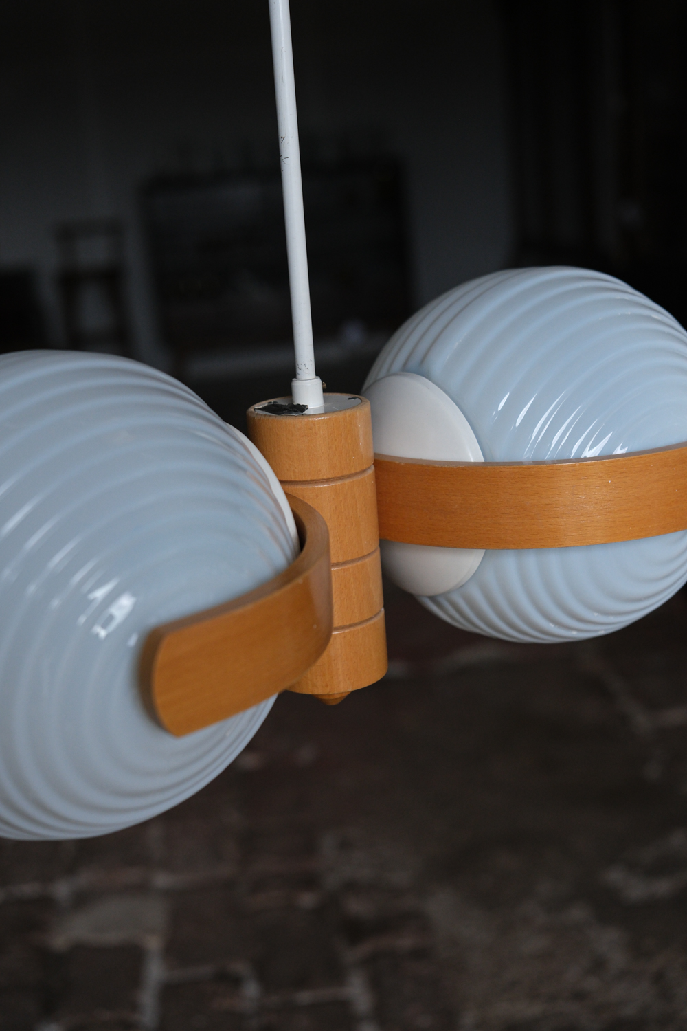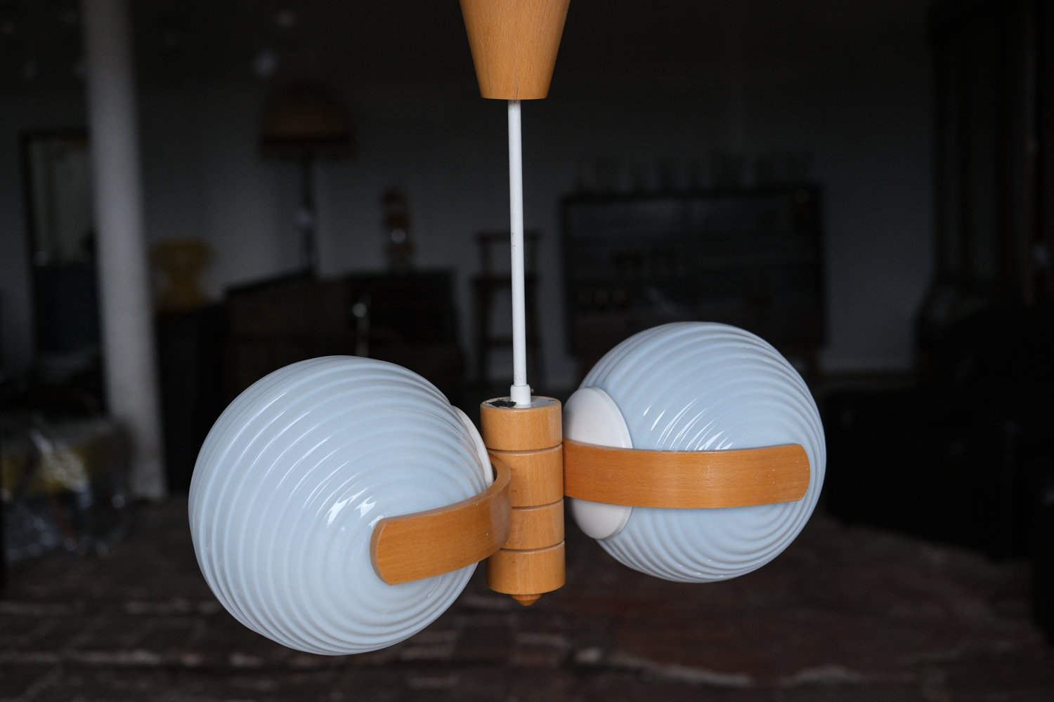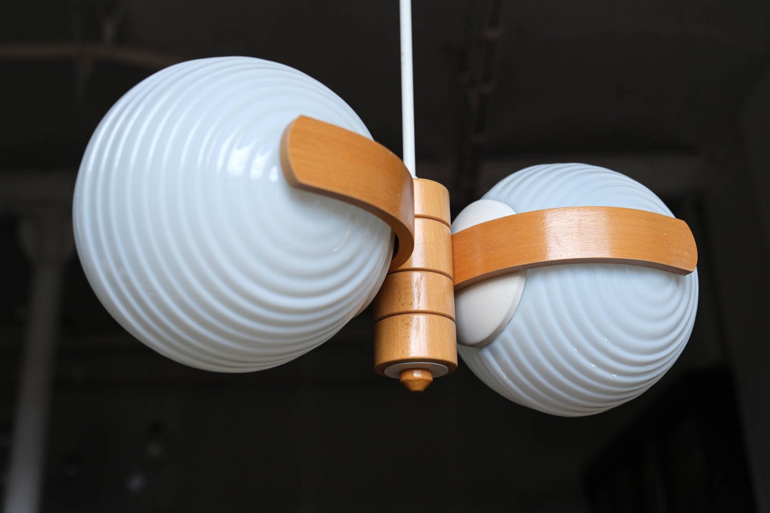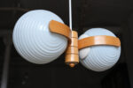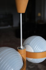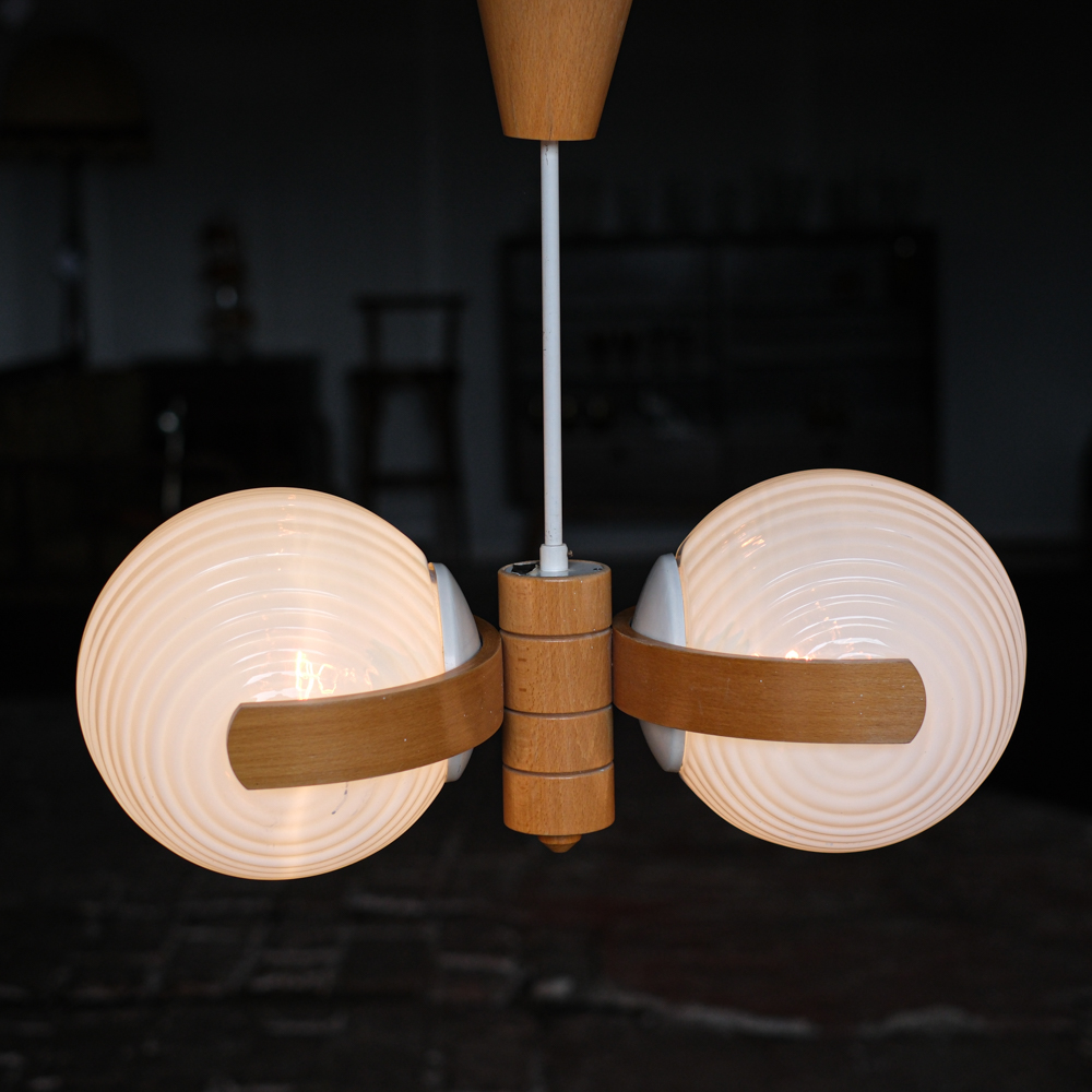 Lustr s dvojicí lisovaných opálových stínidel, doplněný konstrukcí z ohýbaného dřeva. Kombinace skla a dřeva je typická pro československý design 60. a 70. let, kdy se technické materiály přirozeně doplňovaly s teplejším, přírodním prvkem.