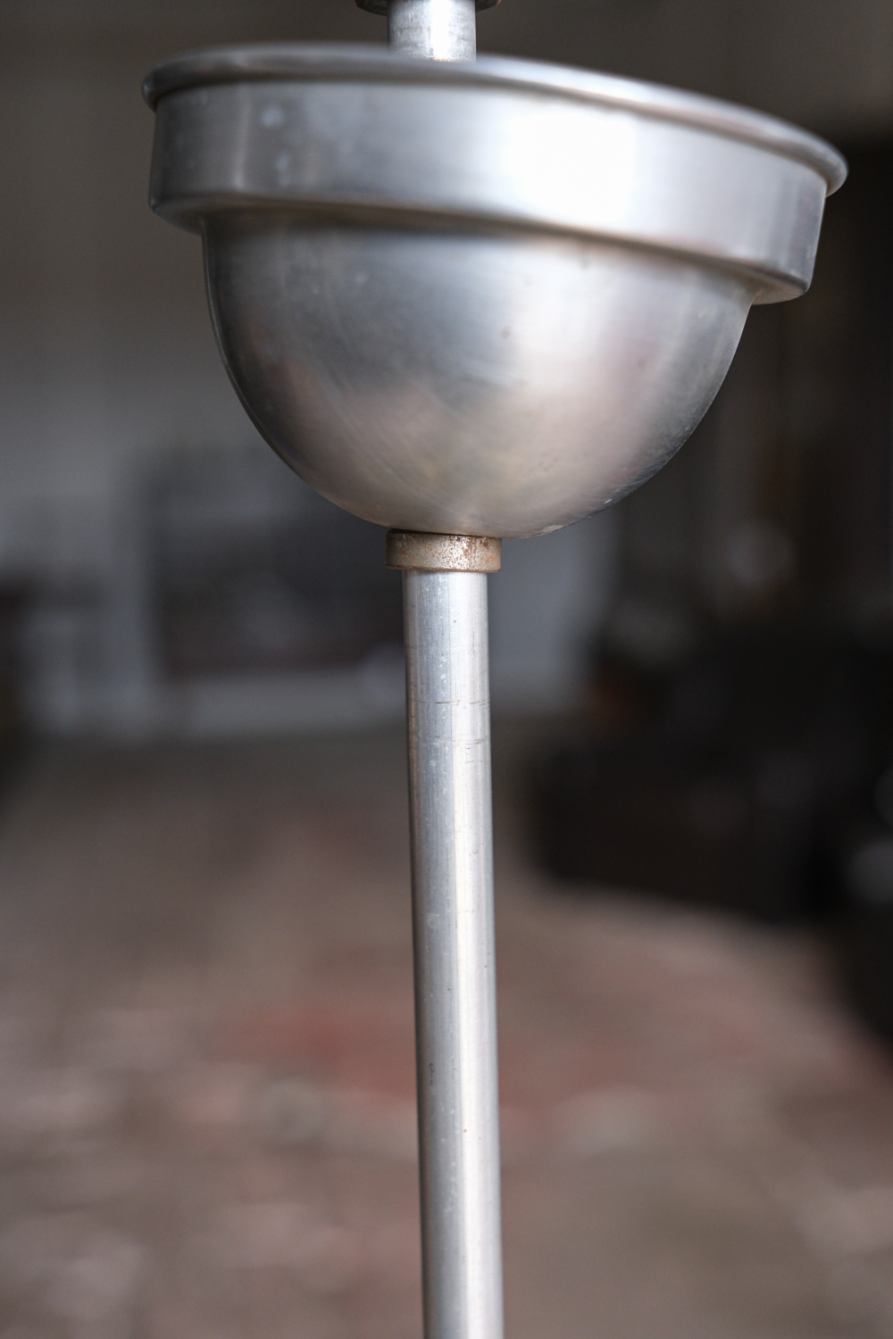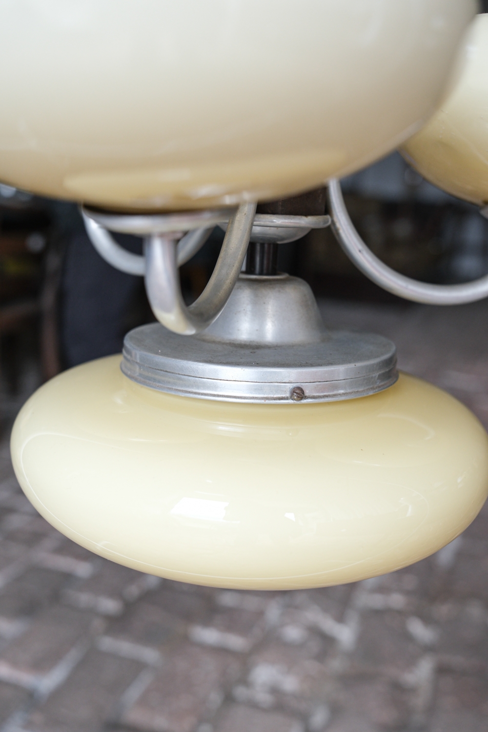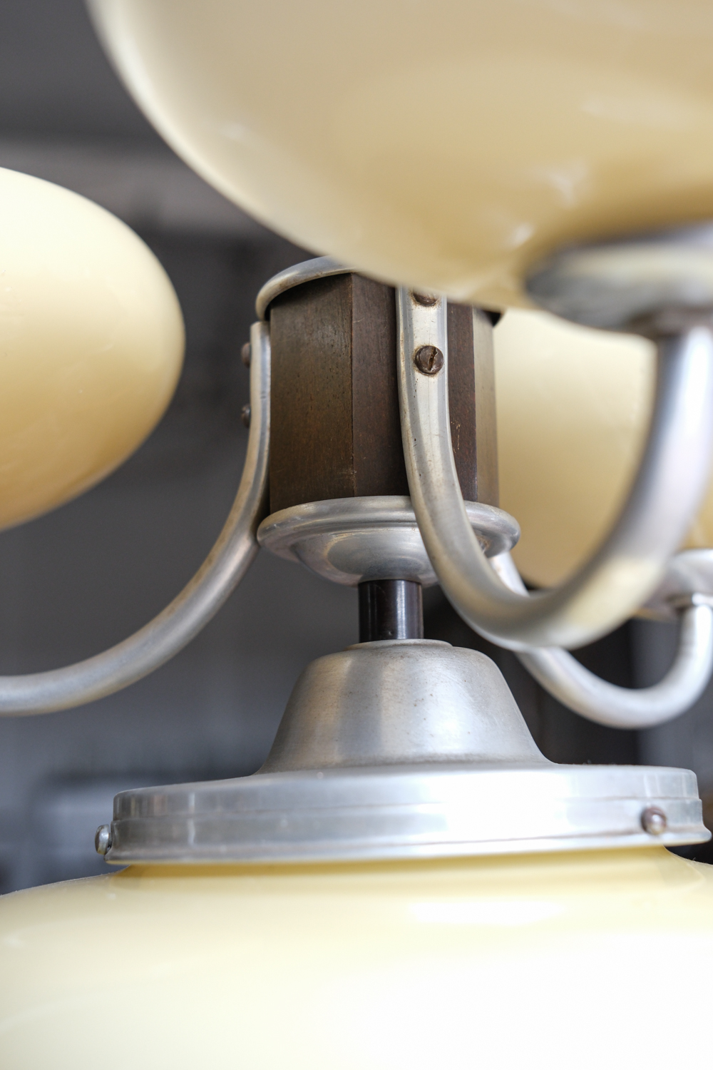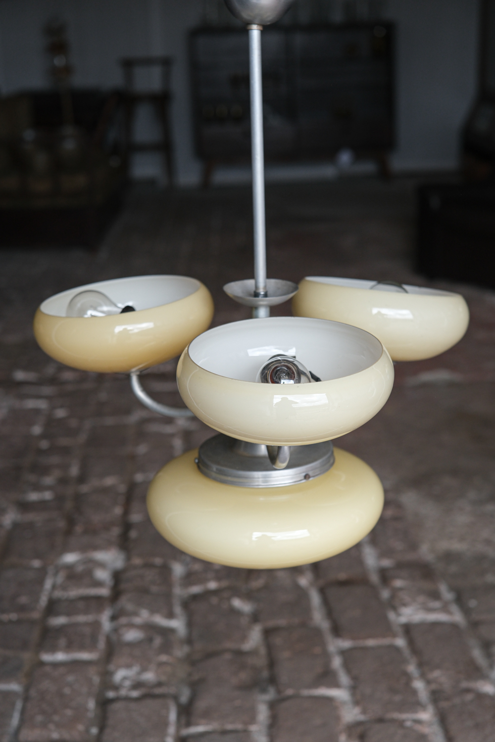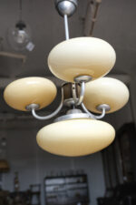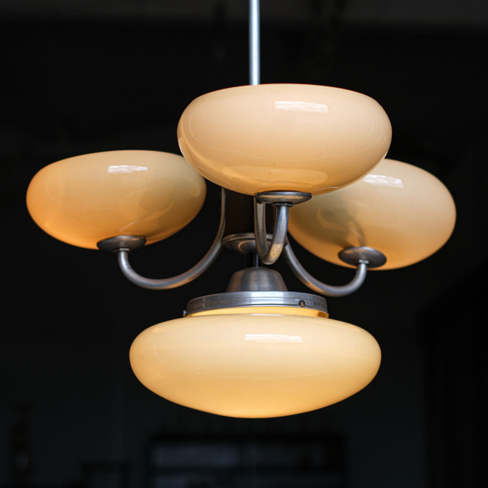 Lustr z 50. let, postavený na jednoduché a velmi příjemné kombinaci kovu a opálového skla. Dominantním prvkem jsou skleněné misky s měkce zaobleným tvarem, které se pravidelně rozvírají kolem centrální osy.