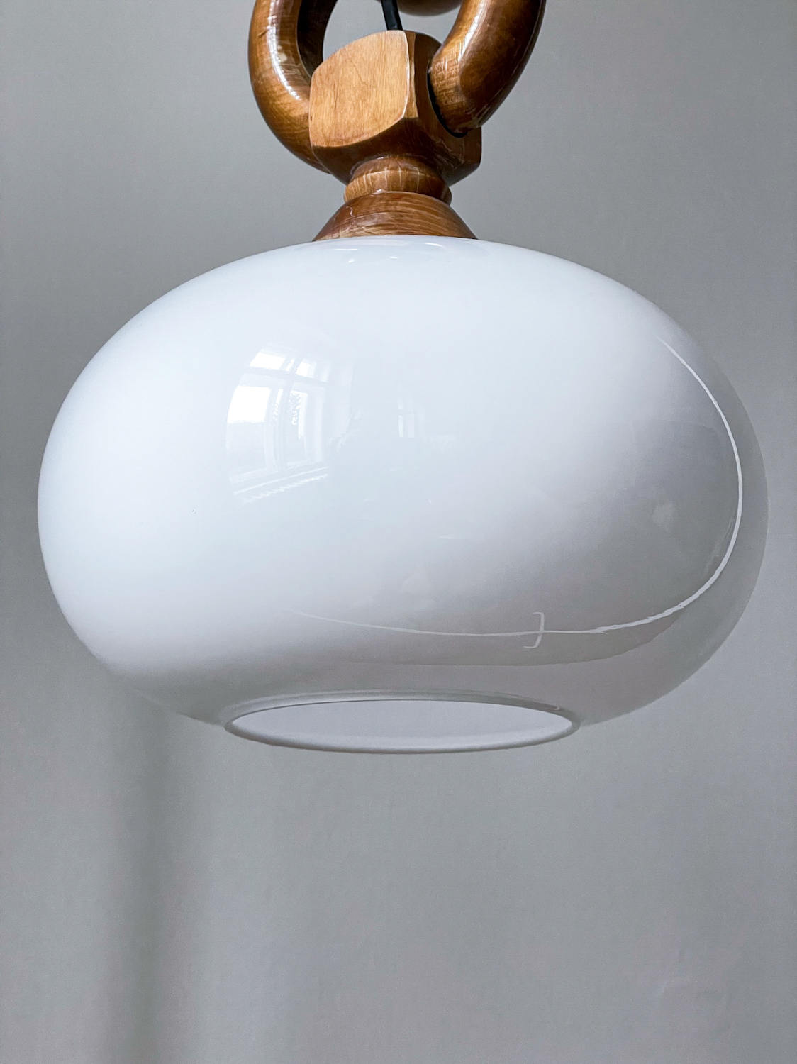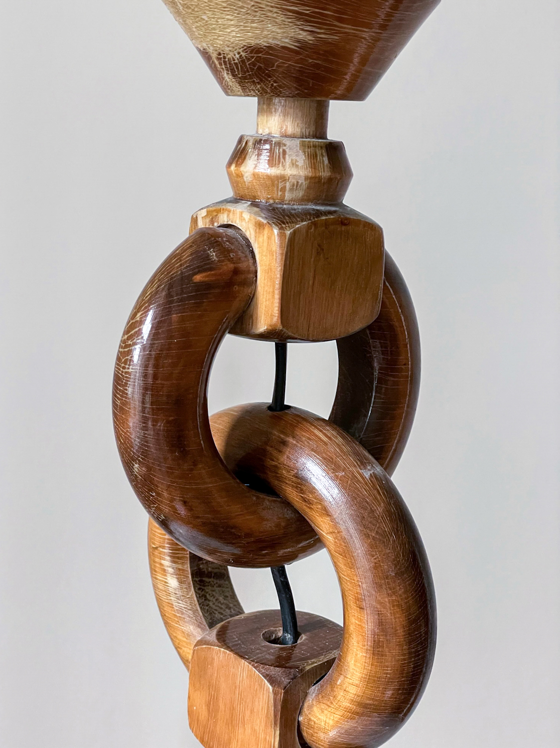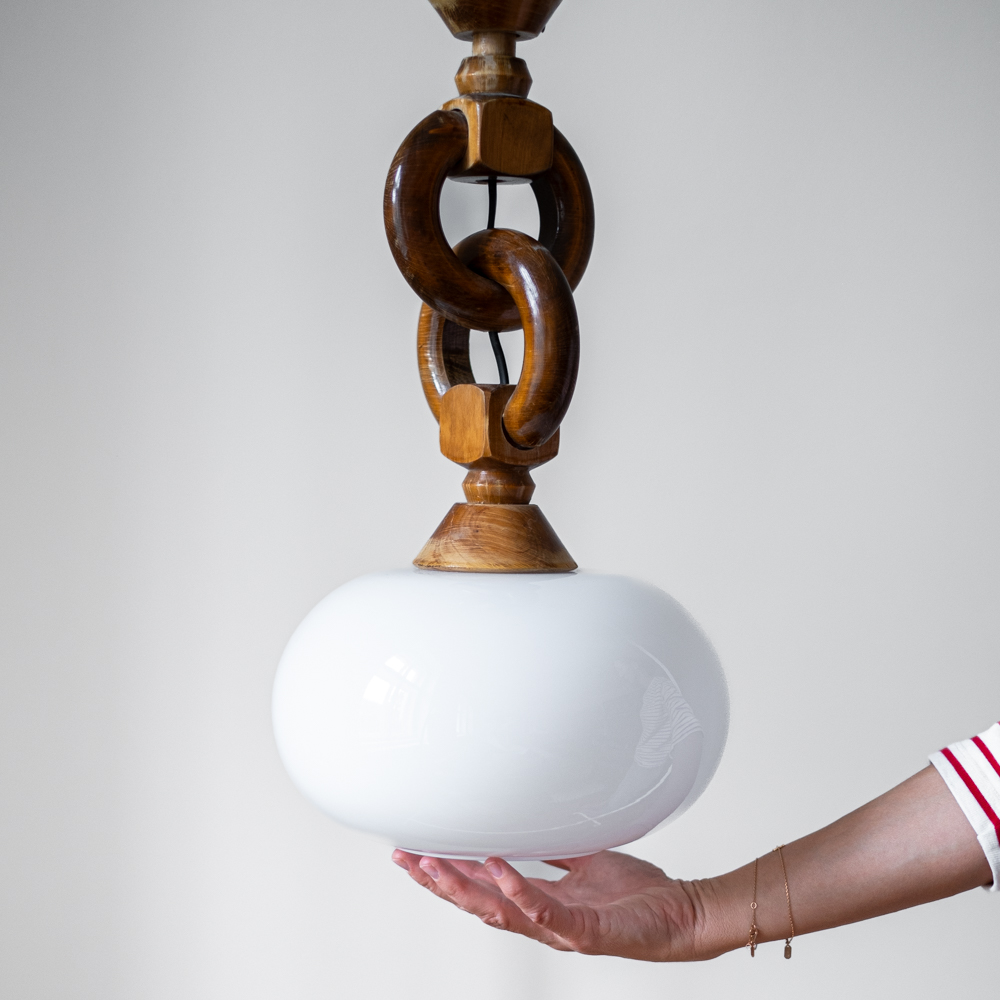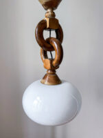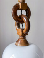 Zajímavá kombinace dřeva ve tvaru řetězu a skleněného stínidla.