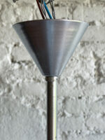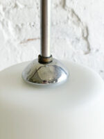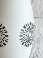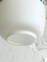 Lustr oválného tvaru v bruselském stylu z opálového skla je zdoben decentním černým vzorem, který připomína slunce nebo květinu.