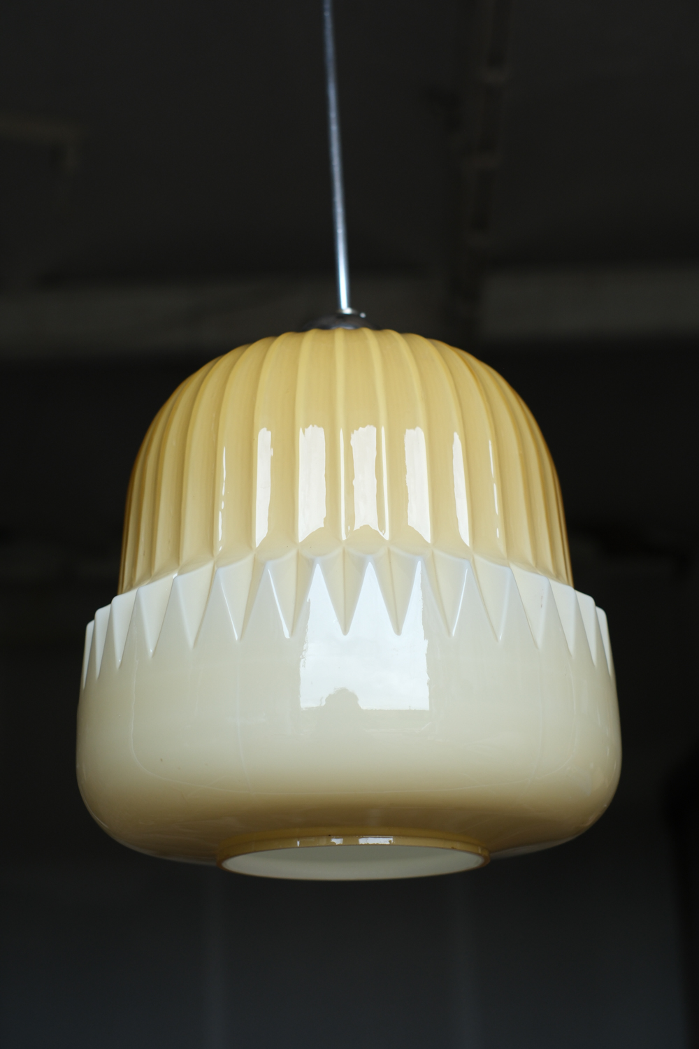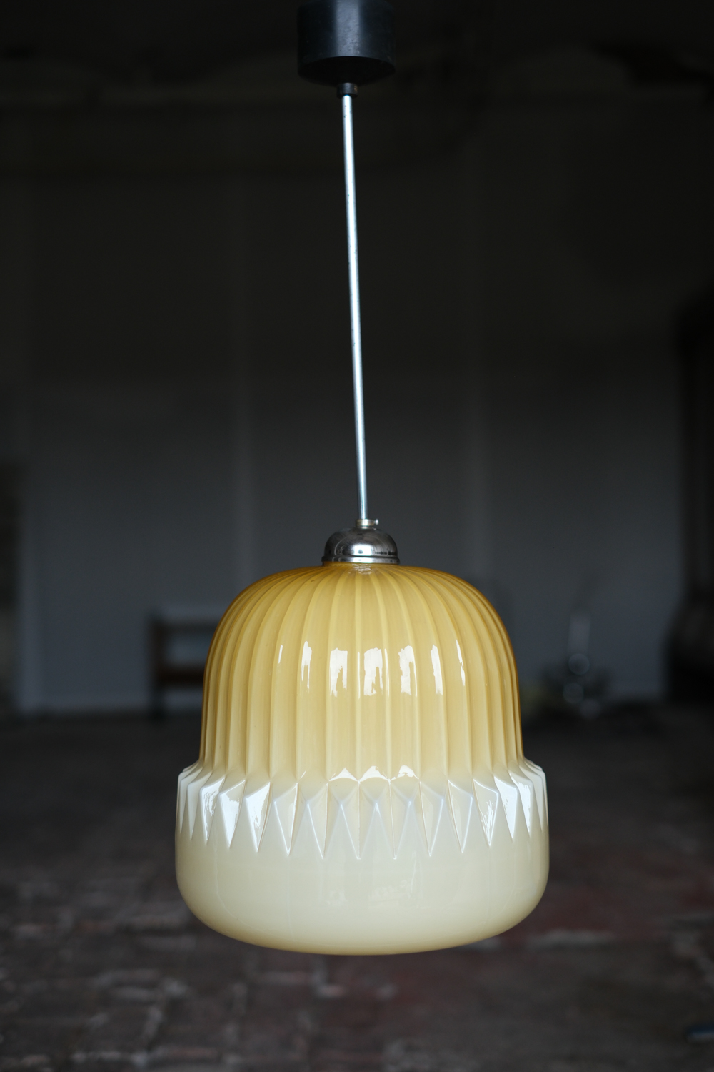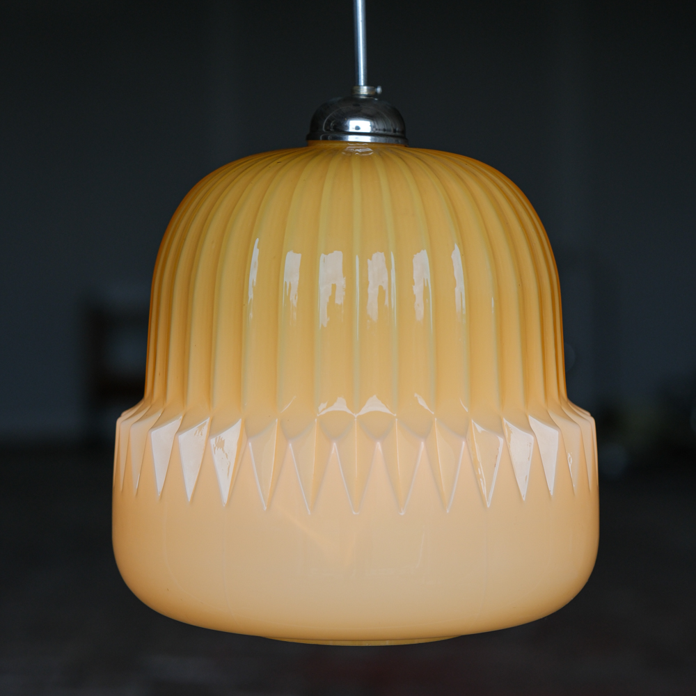 Stínidlo je vyrobeno z opálového skla v lesklé výrazné žluté barvě. Lustr pochází od návrháře Štěpána Tabery, který pracoval pro podnik OPP Jihlava. Čistým tvarem i výraznou barvou se bude krásně hodit jak do moderního interiéru tak do retro stylu. Rozhodně s ebude jednat o výrazný prvek, který upoutá pozornost.