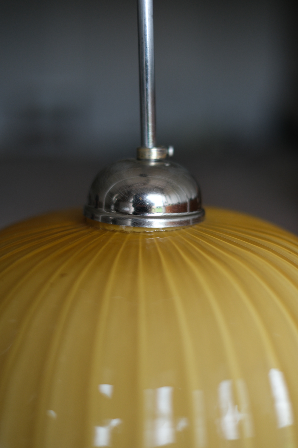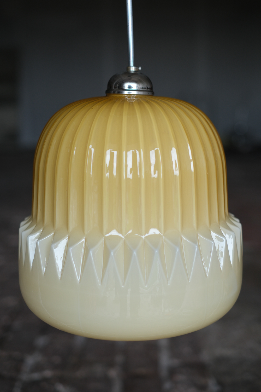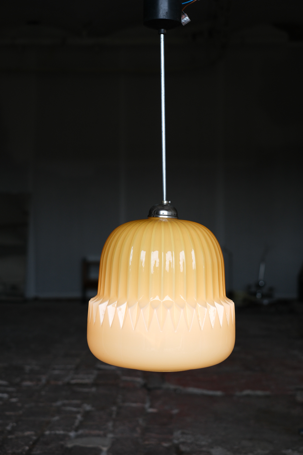 Stínidlo je vyrobeno z opálového skla v lesklé výrazné žluté barvě. Lustr pochází od návrháře Štěpána Tabery, který pracoval pro podnik OPP Jihlava. Čistým tvarem i výraznou barvou se bude krásně hodit jak do moderního interiéru tak do retro stylu. Rozhodně s ebude jednat o výrazný prvek, který upoutá pozornost.