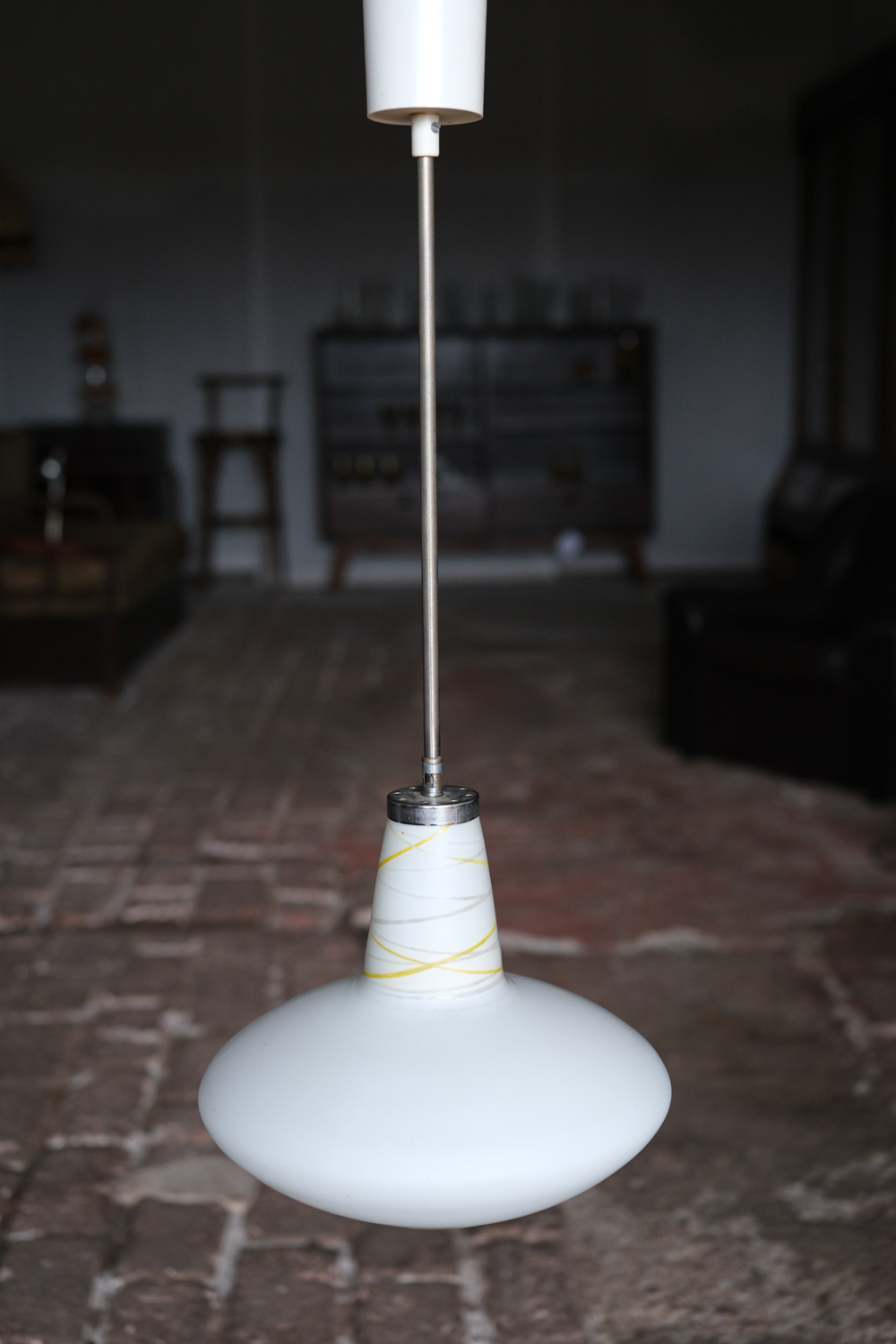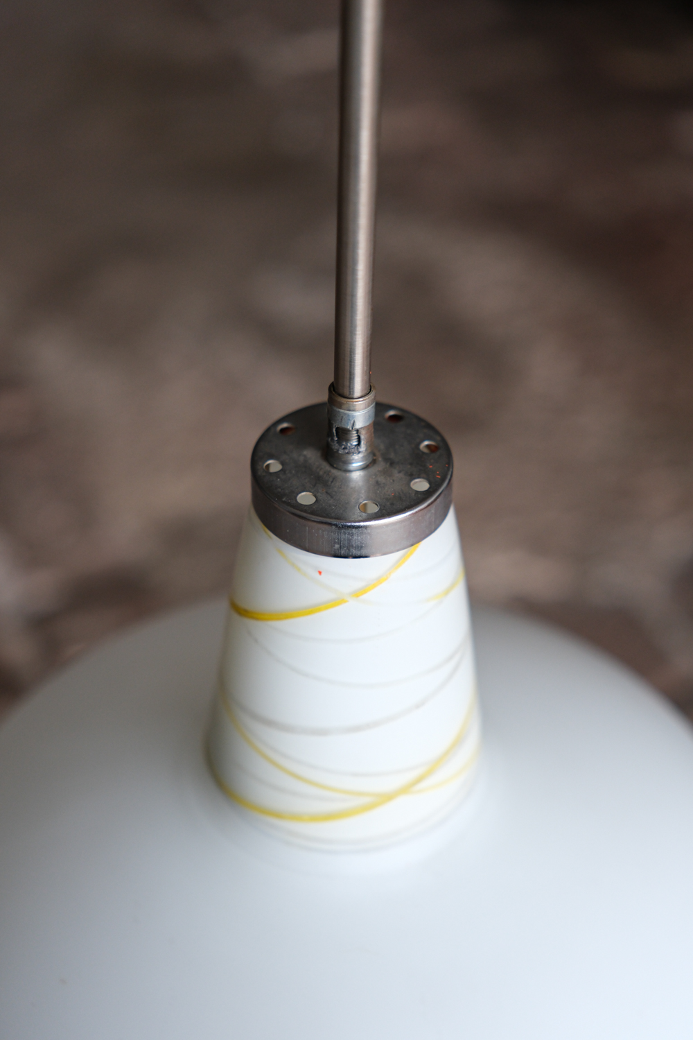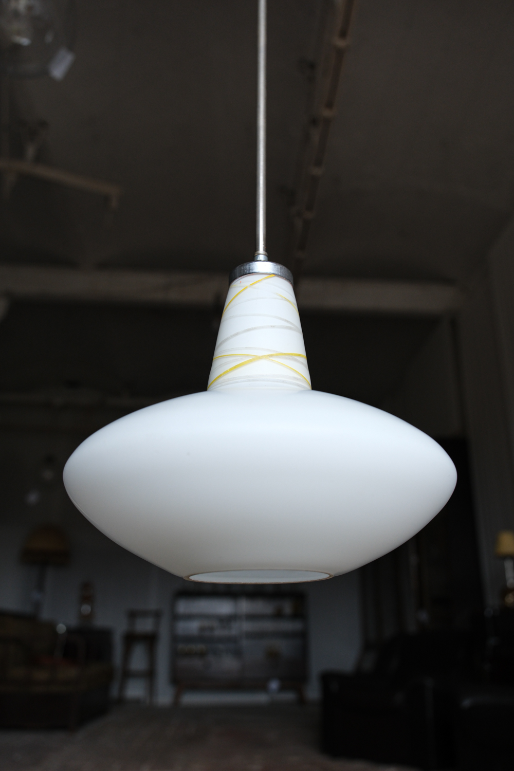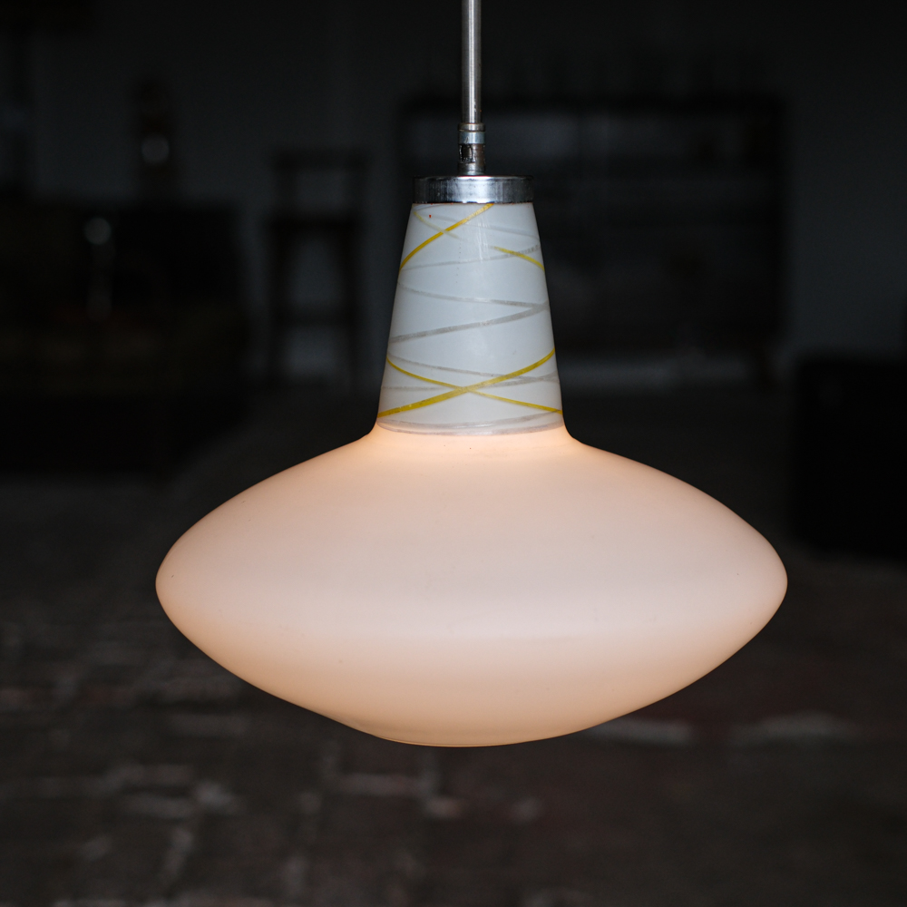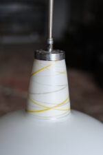 Lustr z opálového skla svým zaobleným tvarem připomíná dětskou káču. Nepůsobí však dětinsky, naopak velmi elegantně. Horní část se spirálovitými linkami přidává jemný dekorativní detail a dává celku charakter.