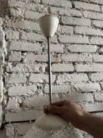 Závěsná lampa z 60. let je vyrobena z lisovaného skla s nápadnou strukturou. Lustr je jednoduchý, ale právě struktura skla mu dodává na zajímavosti. Výborně bude vypadat třeba ve vstupní hale.