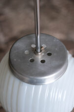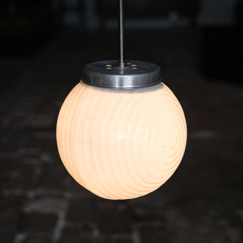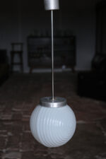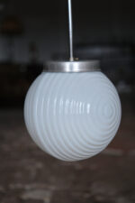 Jednoduché závěsné svítidlo s kulatým stínidlem z opálového skla. Jemná plastická struktura dodává jinak čistému tvaru lehký detail. Ideální volba tam, kde je potřeba funkční a nenápadné osvětlení – do chodby, menší místnosti nebo jako doplňkové světlo.