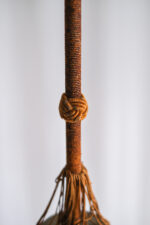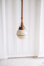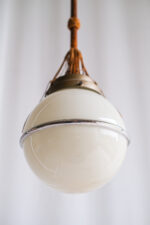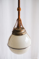 Sklěněný lustr z období Art Deca. Stínidlo ve smetanové barvě je uprostřed zdobeno plastickým pruhem a je zavěšeno na tyči ozdobené textilní šňůrou.