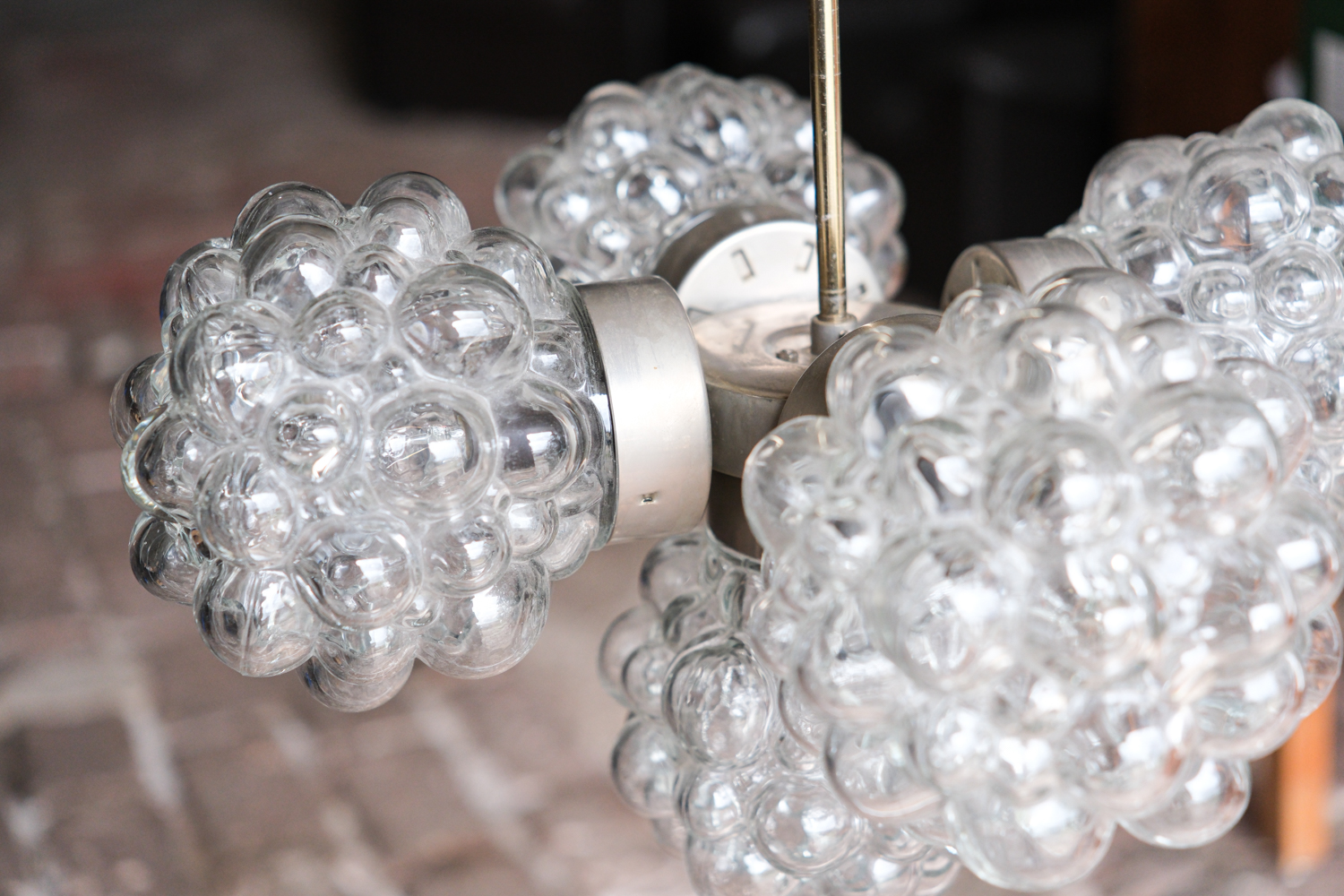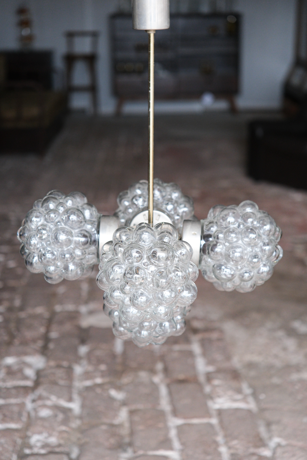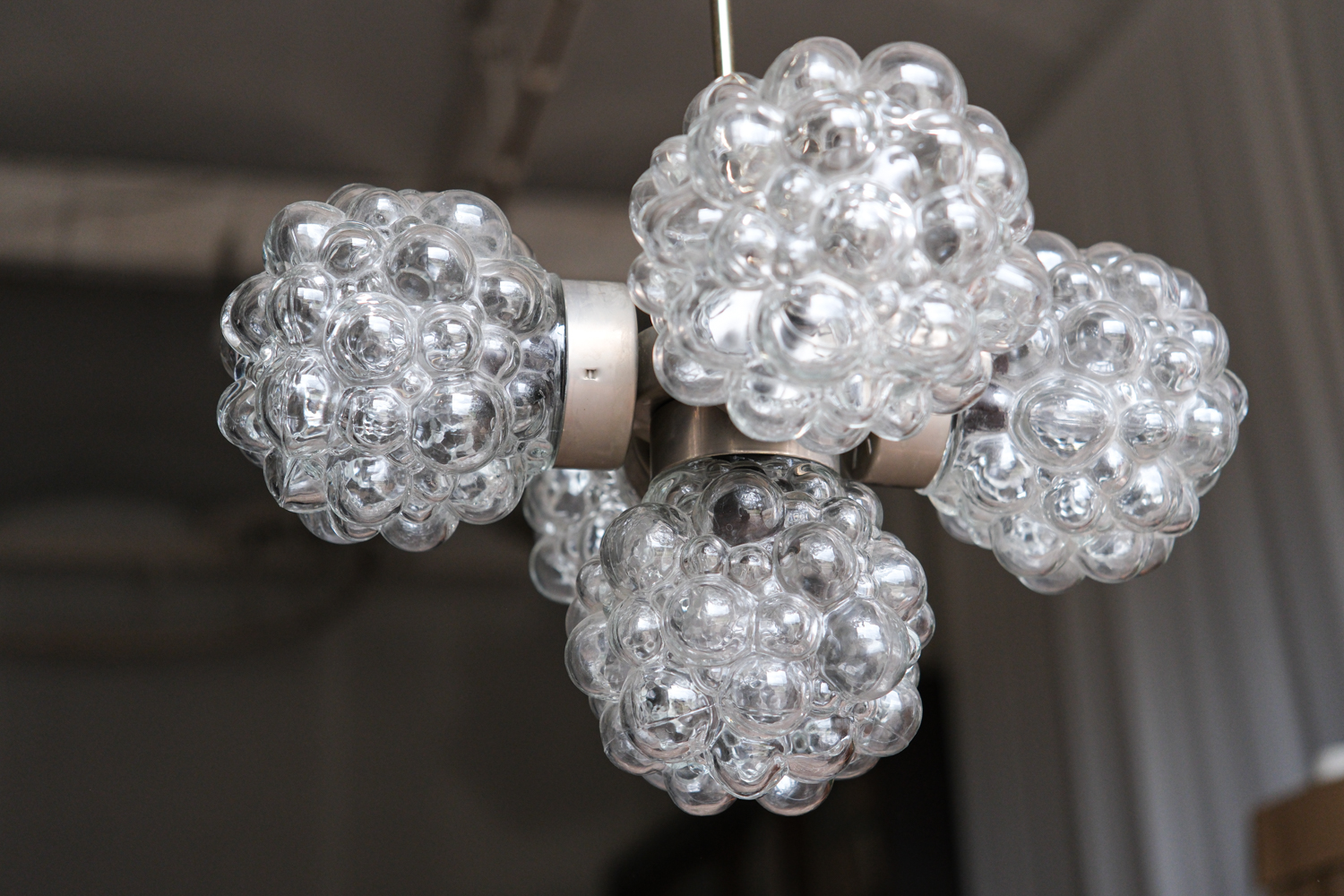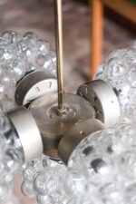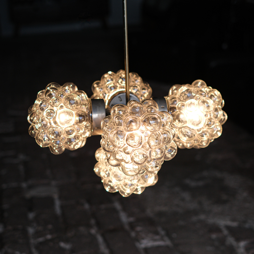 Lustr tvořený typickými skleněnými stínidly ve tvaru tzv. „malin“, které patří k ikonickým prvkům designu 60. a 70. let min. století. Plasticky tvarované sklo vytváří bohatou, téměř šperkovou strukturu, která působí dekorativně i bez rozsvícení.
