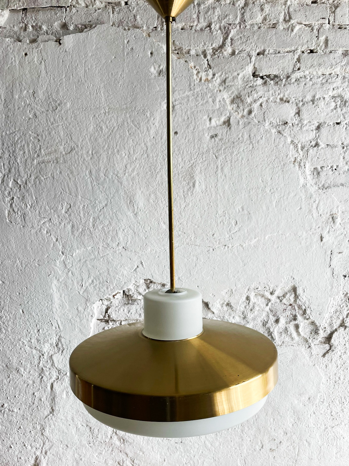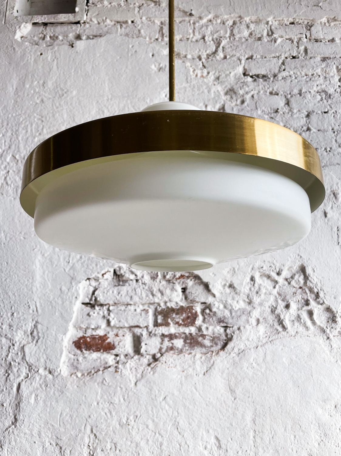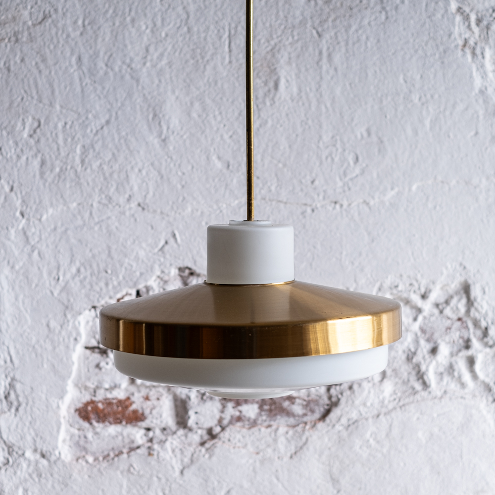 Zajímavý lustr v kombinaci opálového skla a mosazi od Napaka pochází z 50. let minulého století. Vydává hezké rozptýlené světlo. Hezký efekt vytvoří zavěšení váce lustrů vedle sebe např. nad kuchyňský stůl nebo nad ostrůvek.
