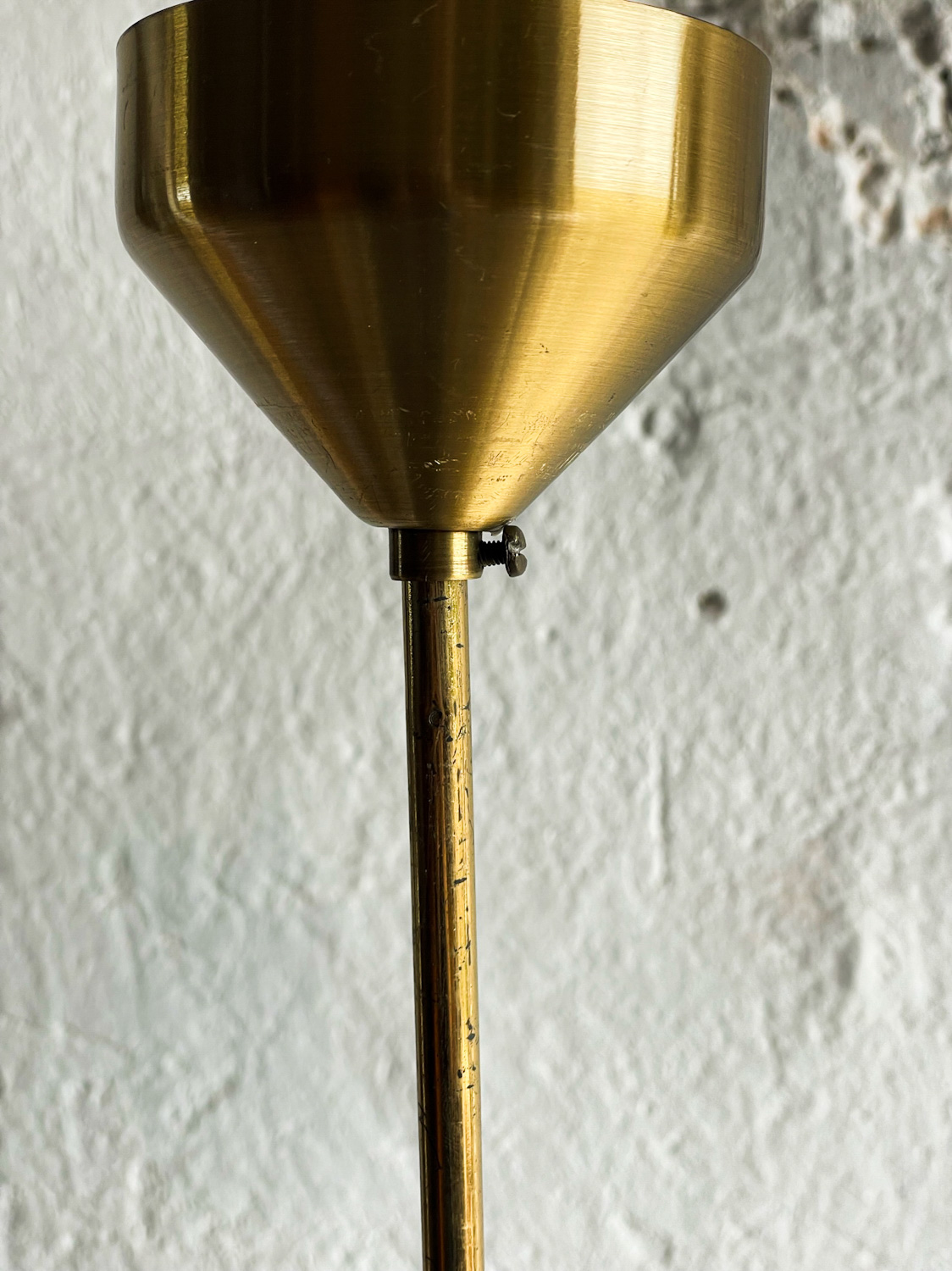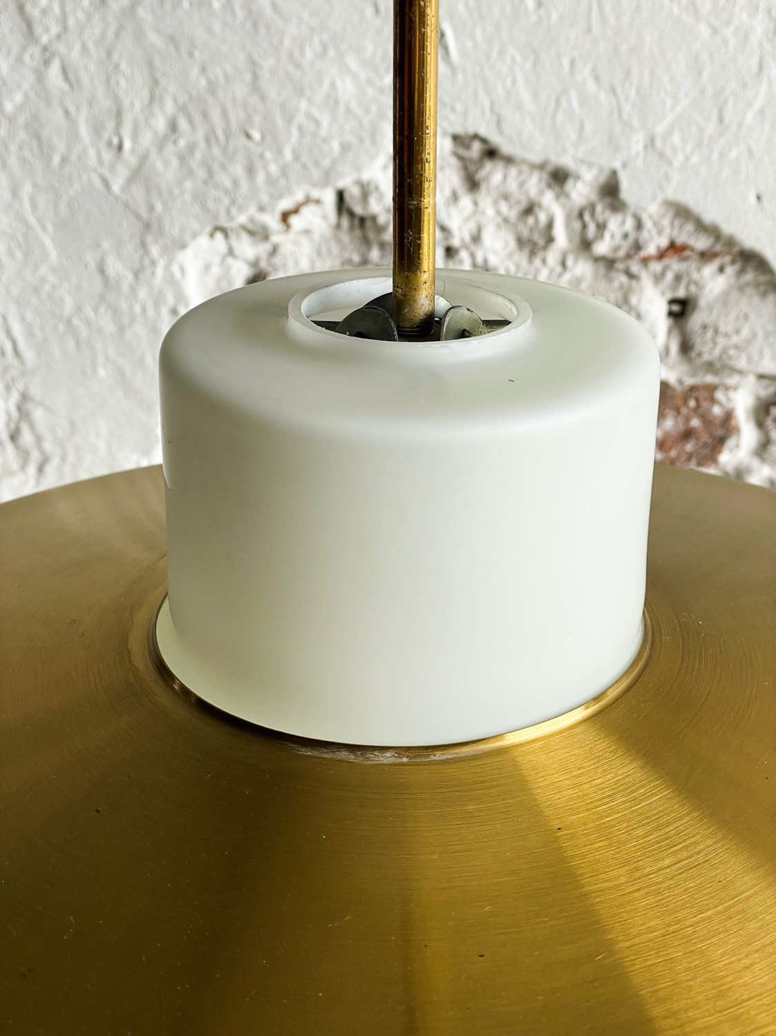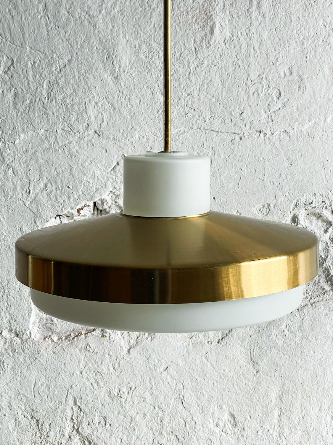 Zajímavý lustr v kombinaci opálového skla a mosazi od Napaka pochází z 50. let minulého století. Vydává hezké rozptýlené světlo. Hezký efekt vytvoří zavěšení váce lustrů vedle sebe např. nad kuchyňský stůl nebo nad ostrůvek.