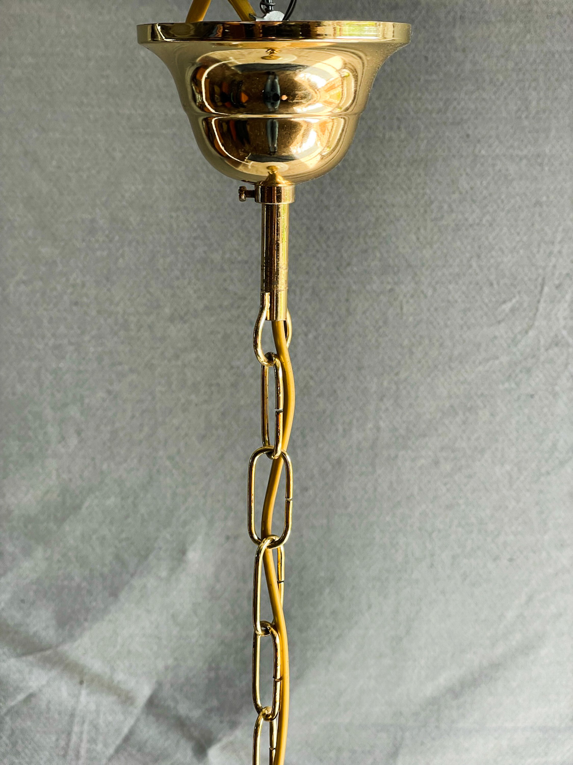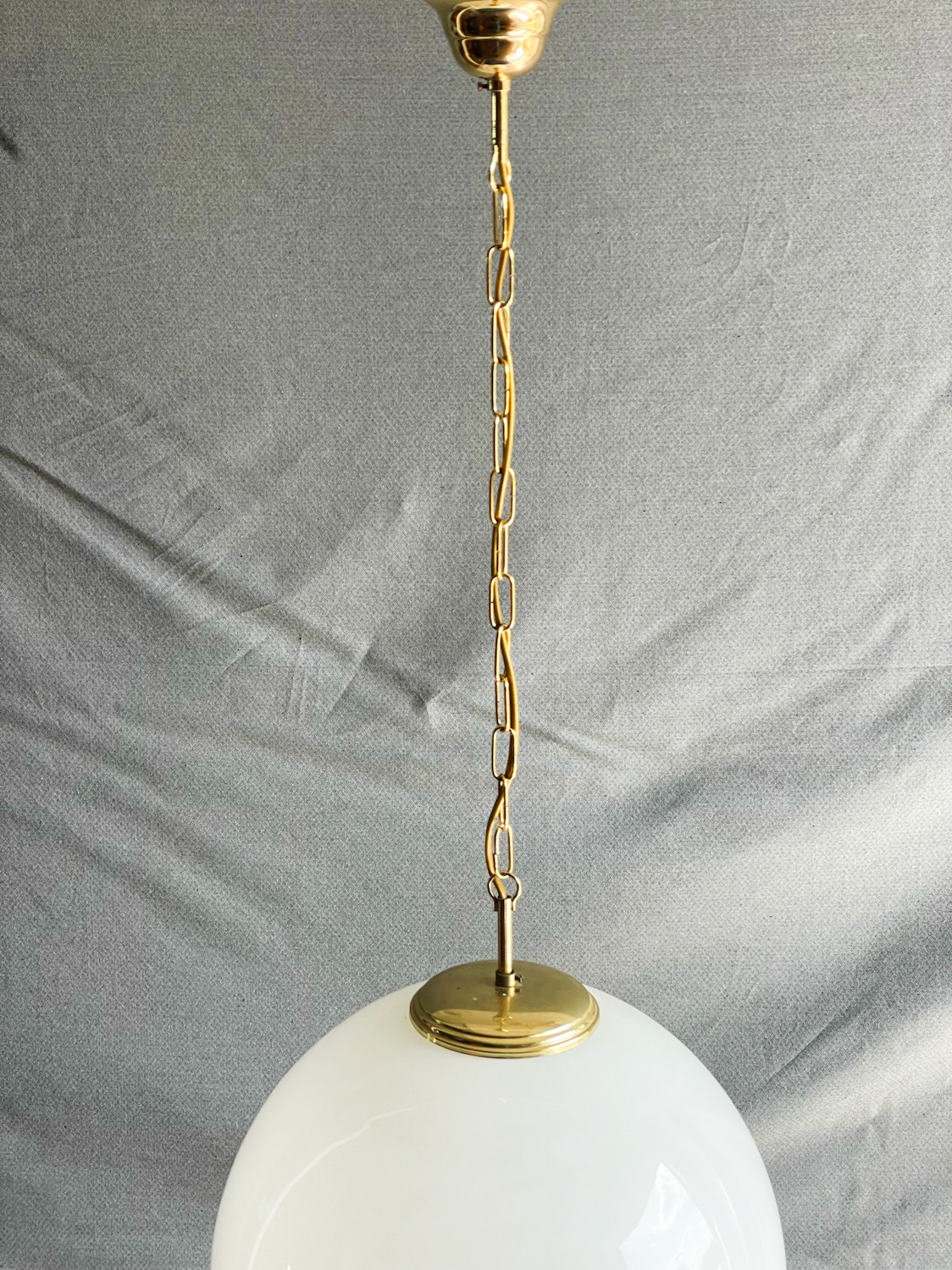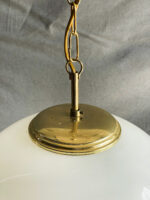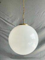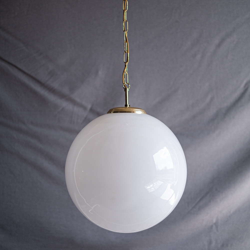 Obří skleněná koule z opálového skla na zlatém řetězu. Elegantní, jednoduchý přesto díky své velikosti velmi efektní lustr, který se hodí zejména do haly.