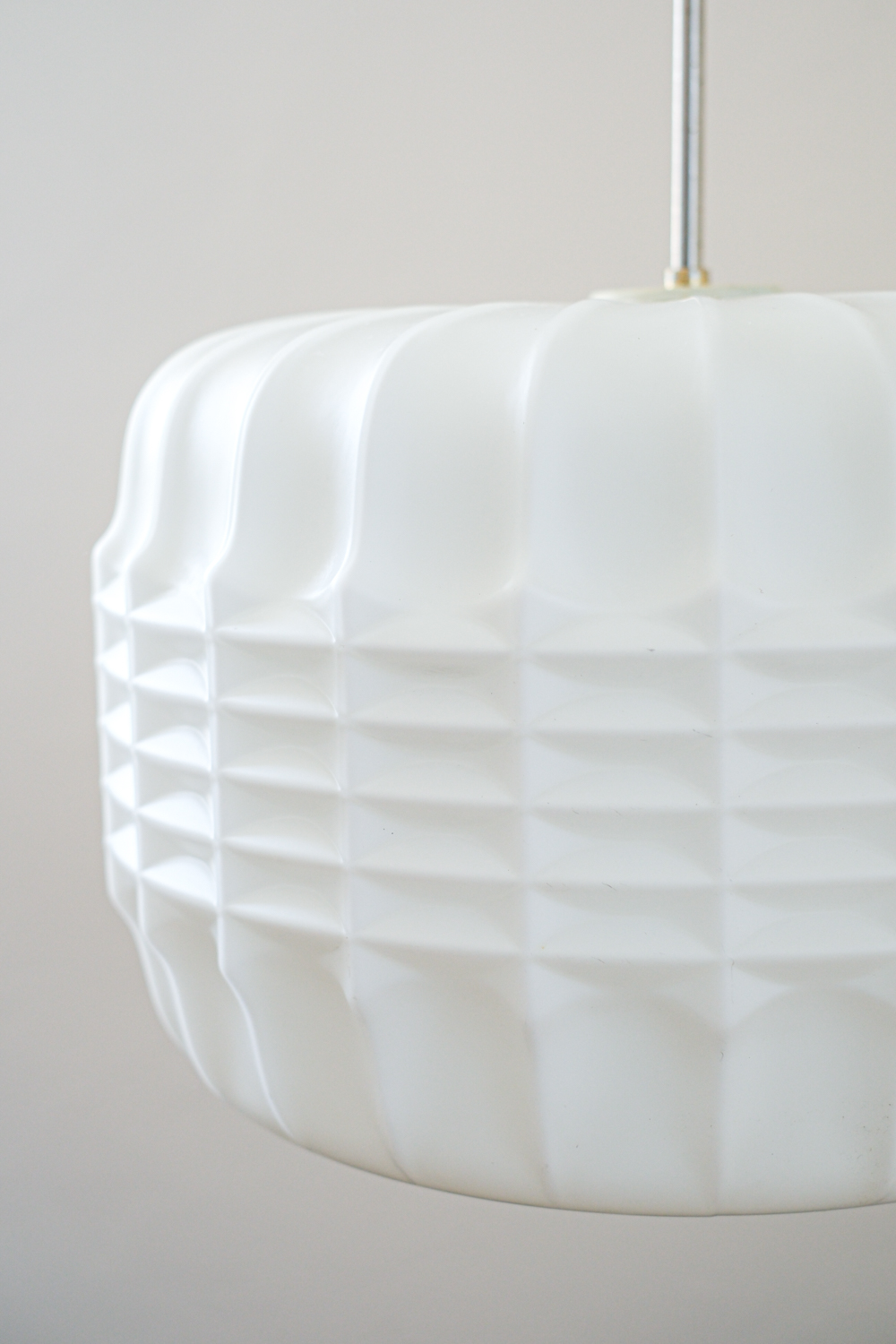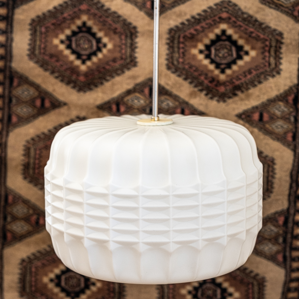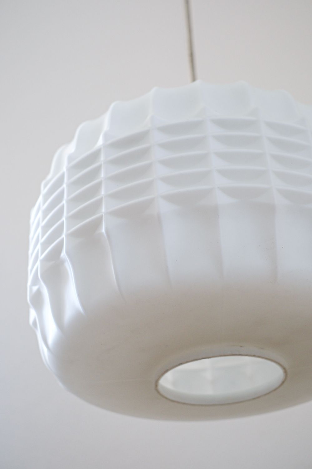 Lustr s opálovým stínidlem z litého skla, jehož reliéfní povrch hraje s geometrií a světlem nečekanou hru. Plastické žebrování se ve střední části láme do vzoru připomínajícího optické čočky, každý úhel pohledu nabízí jiný dojem.