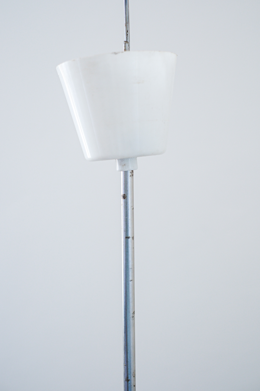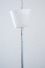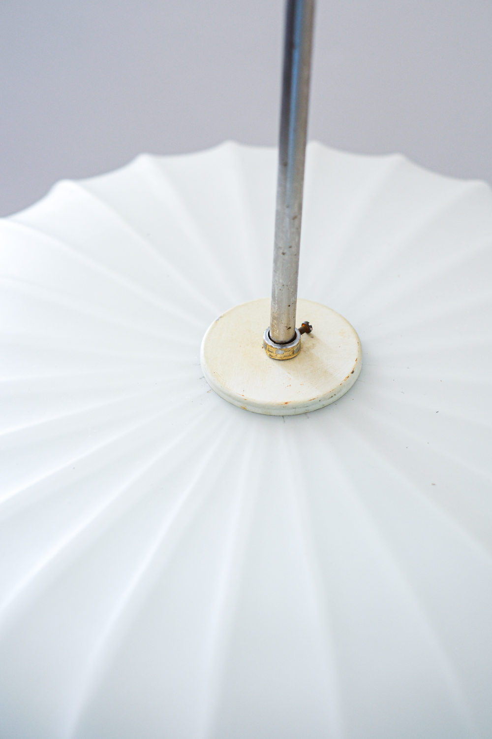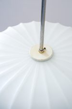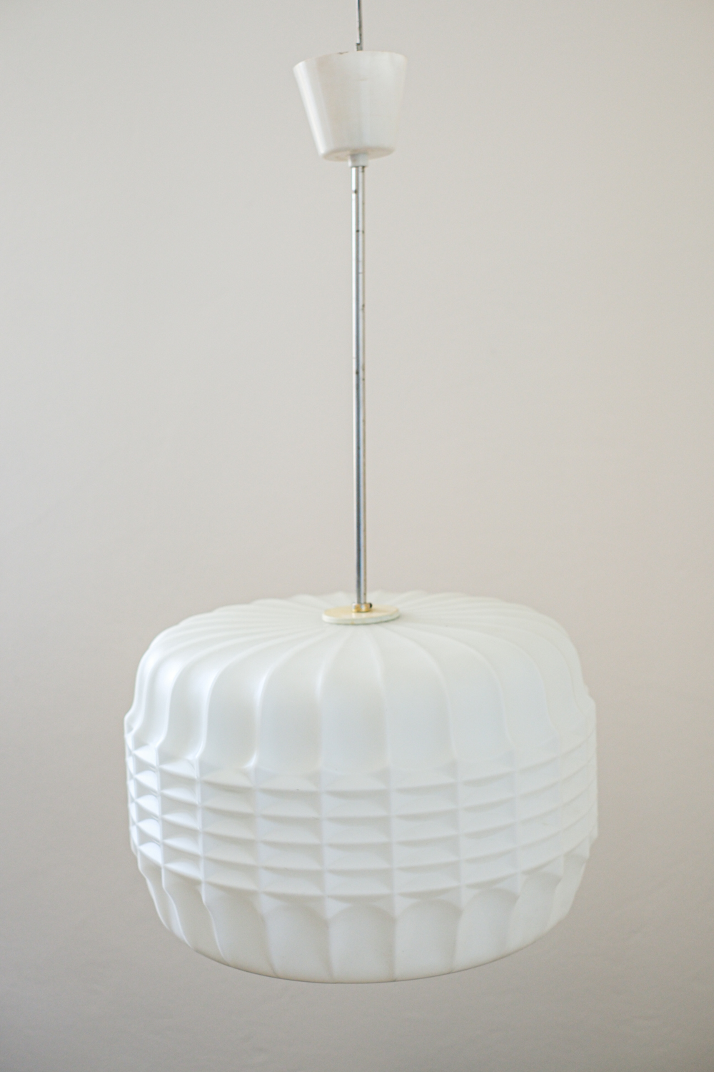 Lustr s opálovým stínidlem z litého skla, jehož reliéfní povrch hraje s geometrií a světlem nečekanou hru. Plastické žebrování se ve střední části láme do vzoru připomínajícího optické čočky, každý úhel pohledu nabízí jiný dojem.
