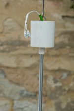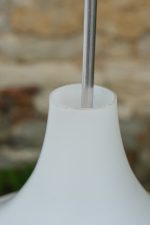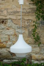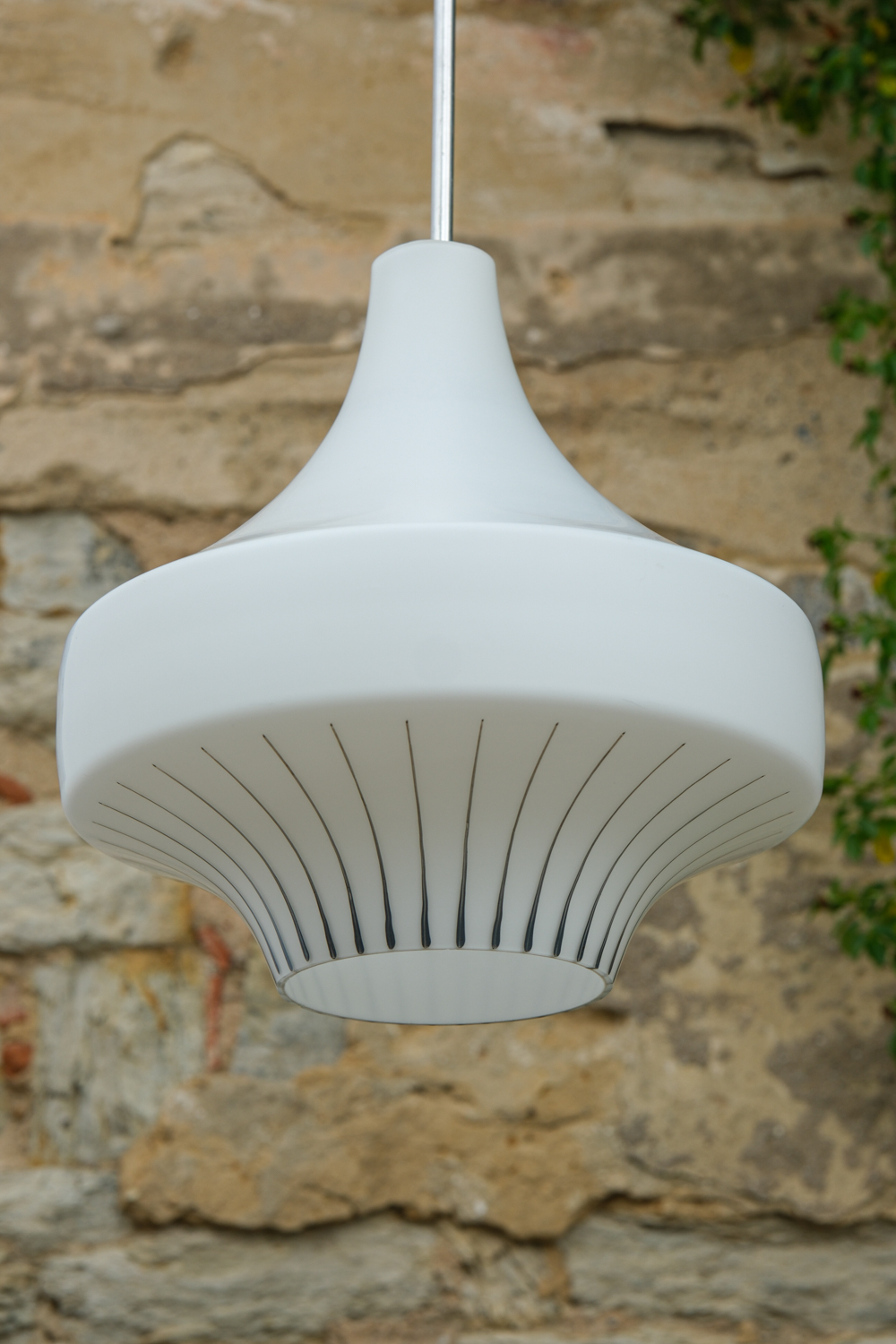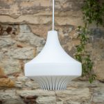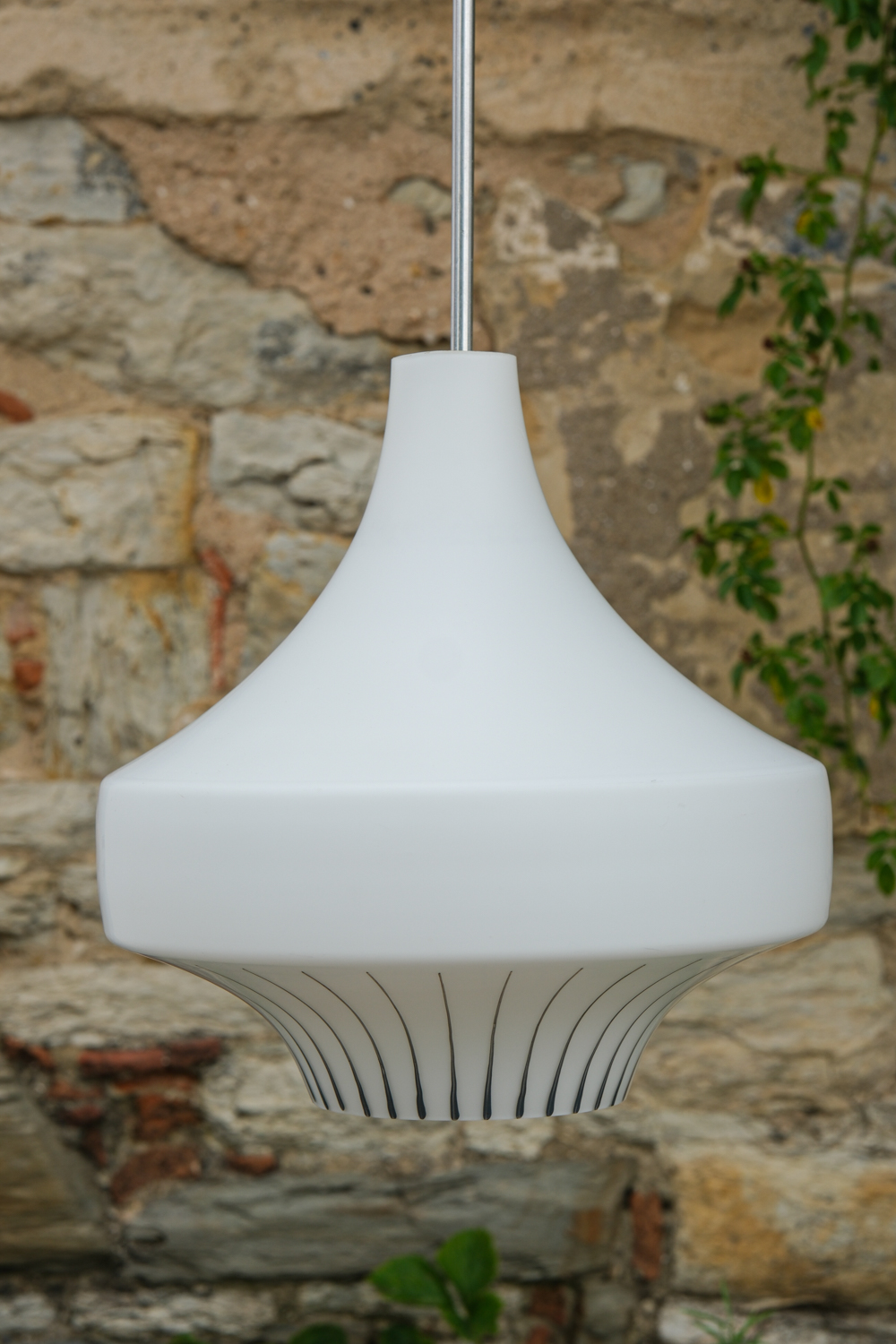 Zajímavě tvarovaný lustr z bílého opálového skla s ručně malovaným dekorem v černé kresbě. Jeho silueta připomíná kapku nebo stylizovanou věž. Vynikne nad jídelním stolem, v hale i ložnici.