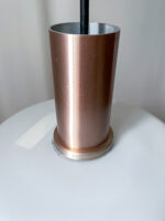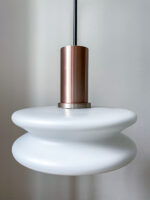 Minimalistický lustr z opálového skla svým tvarem připomínající ufo. K dispozici máme ještě jeden s lehce odlišnou barvou kovového válce – méně do růžova/měděna.