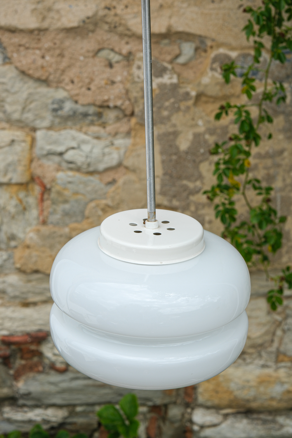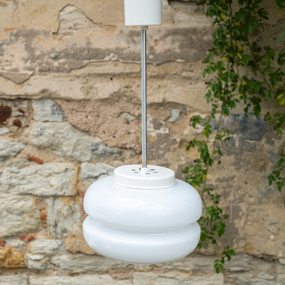 Jemně tvarovaný lustr z bílého opálového skla, jehož oblé linie připomínají francouzsý dezert makronku. Svítidlo vrhá měkké, rovnoměrné světlo a v interiéru působí lehce, čistě a klidně.