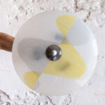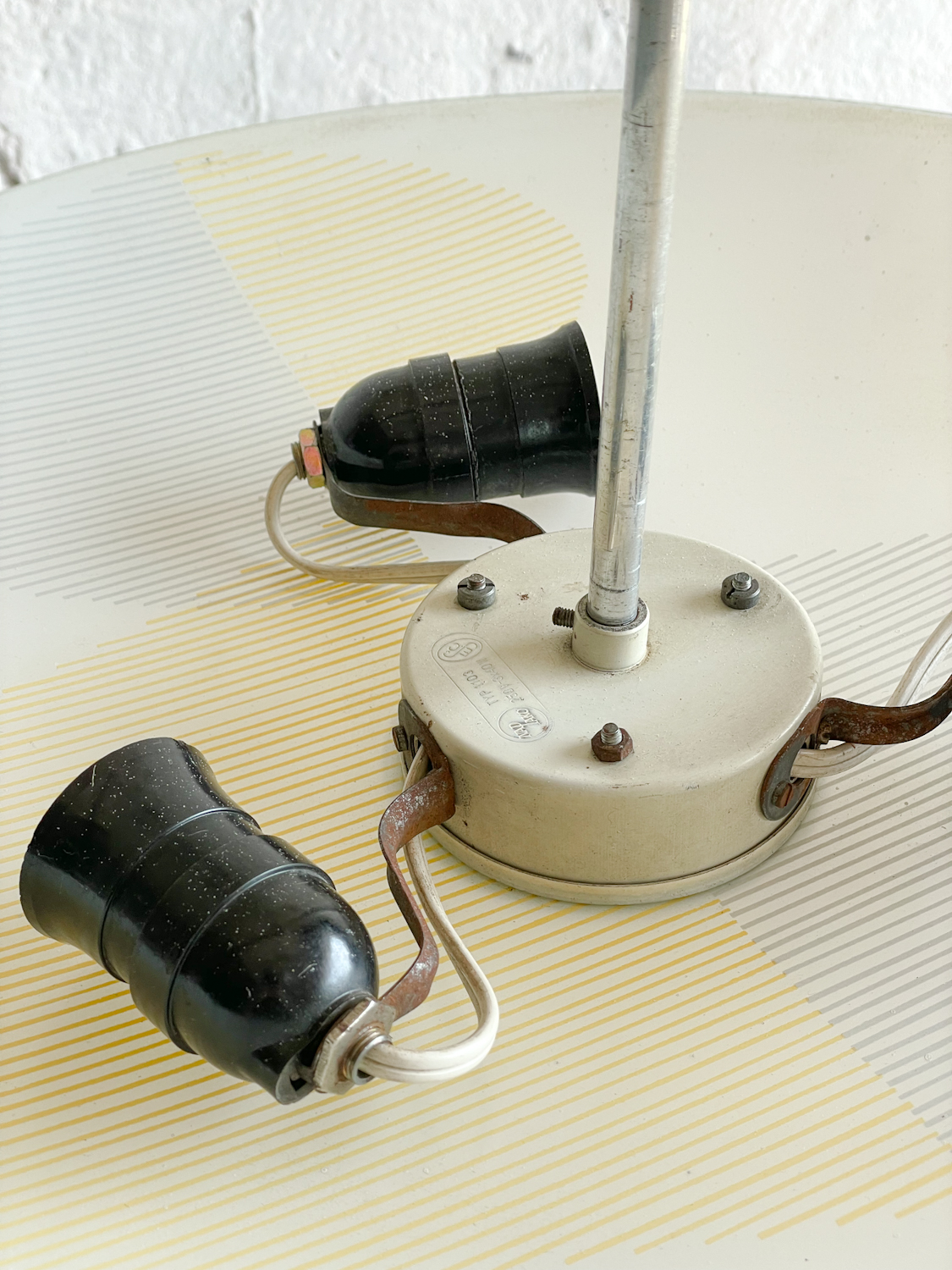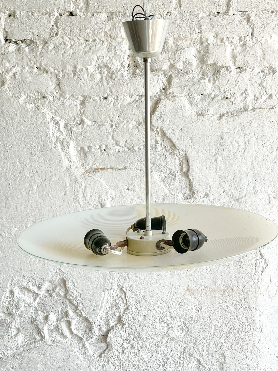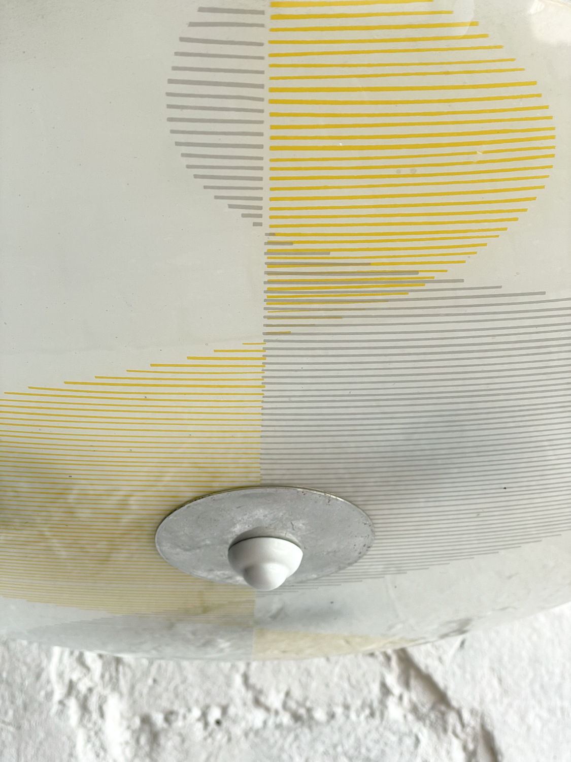 Retro lustr „talíř“ v bruselském stylu z 60 let. Skleněné stínidlo s pastelovým žluto-šedým šrafováním, které vytváří krásný vzor typický pro tuto dobu. 250 V, 3 x 40 W