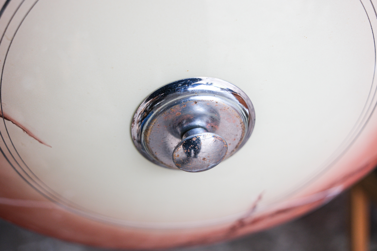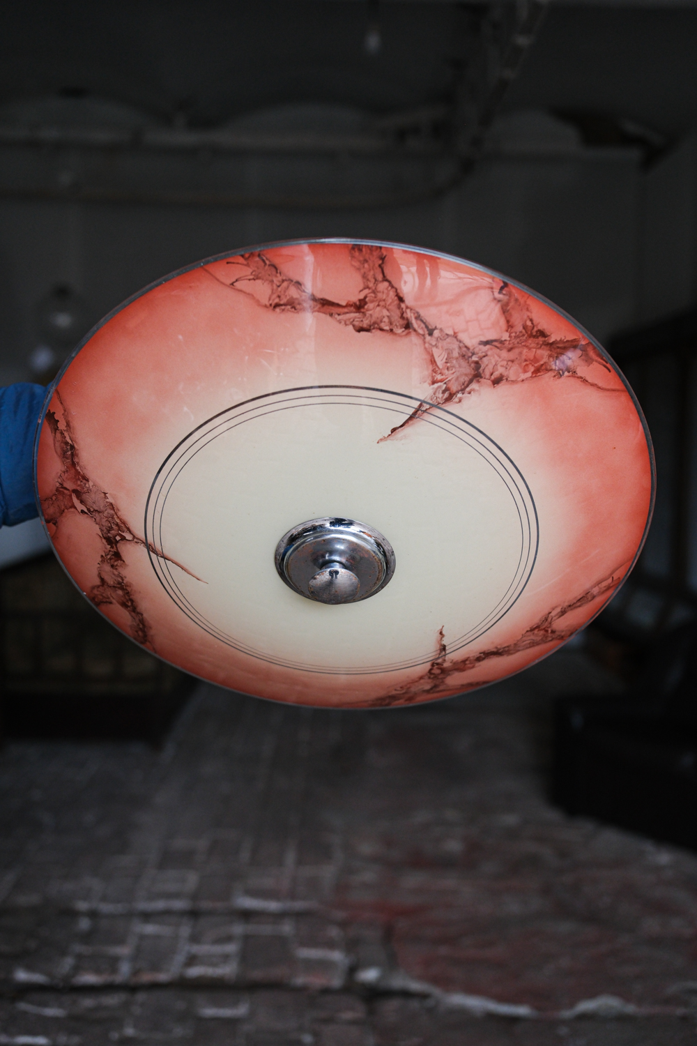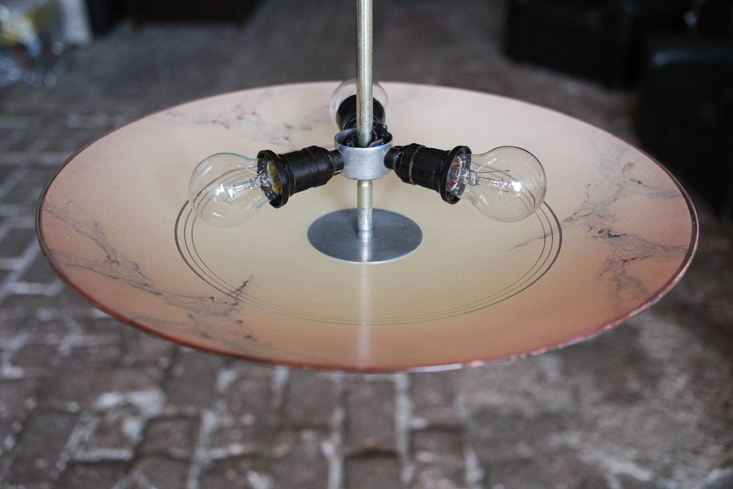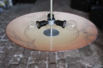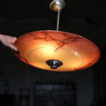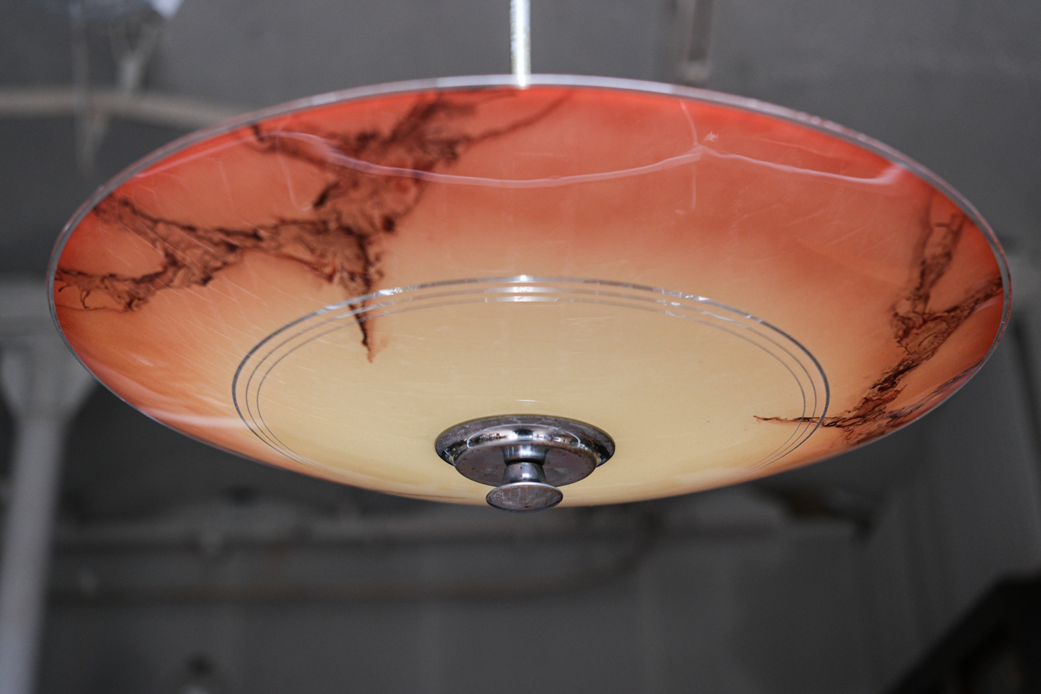 Retro lustr „talíř“ v bruselském stylu z 60 let s plochým skleněným stínidlem v teplém oranžovo-červeném tónu. Sklo je zdobené nepravidelnou kresbou, která připomíná mramorování a dává každému kusu výrazný, lehce dekorativní charakter.