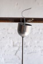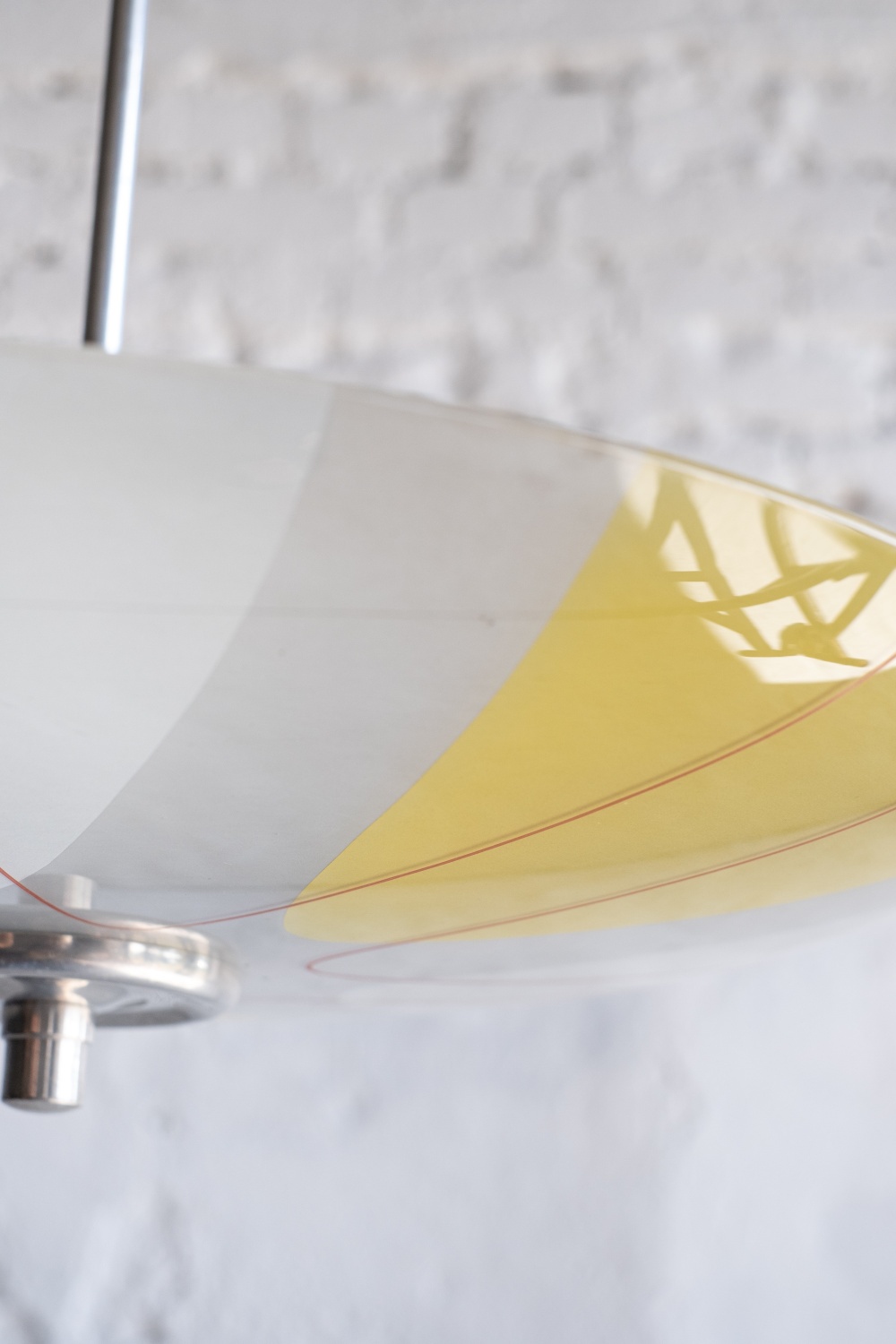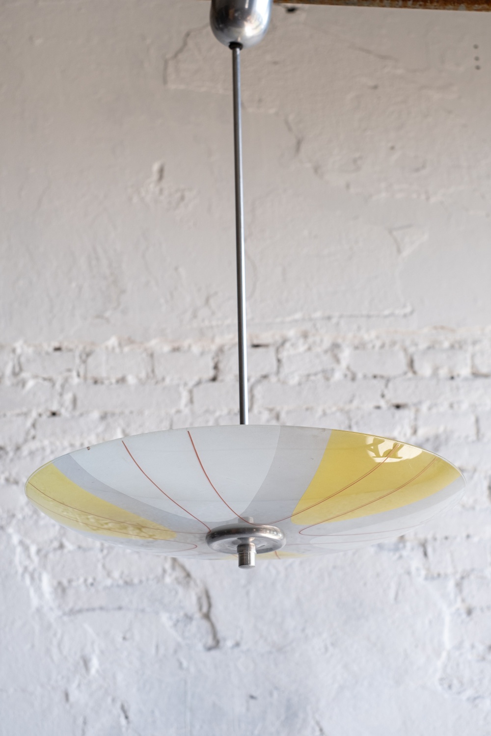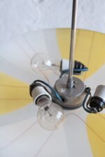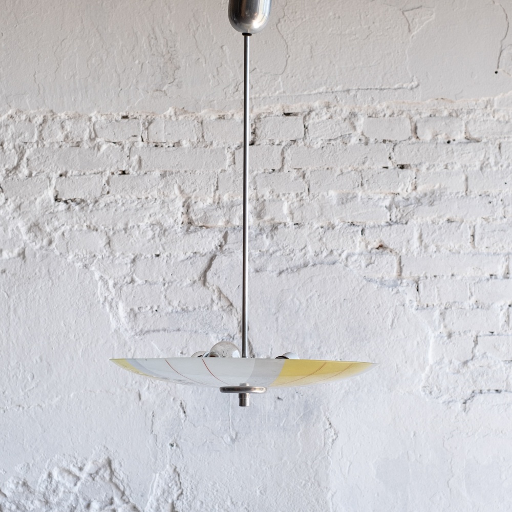 Retro lustr v bruselském stylu z 60. let v nězných pastelových barvách. Typický kulatý tvar připomínajicí talíř, odtud také lidové pojmenování tohoto světla.