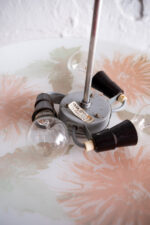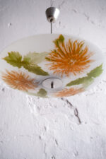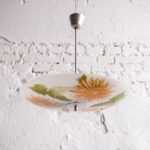 Retro lustr „talíř“ v bruselském stylu z 60 let. Skleněné stínidlo s motivem slunečnice v kombinaci s hliníkovou tyčí. 250 V, 3 x 40 W