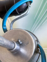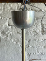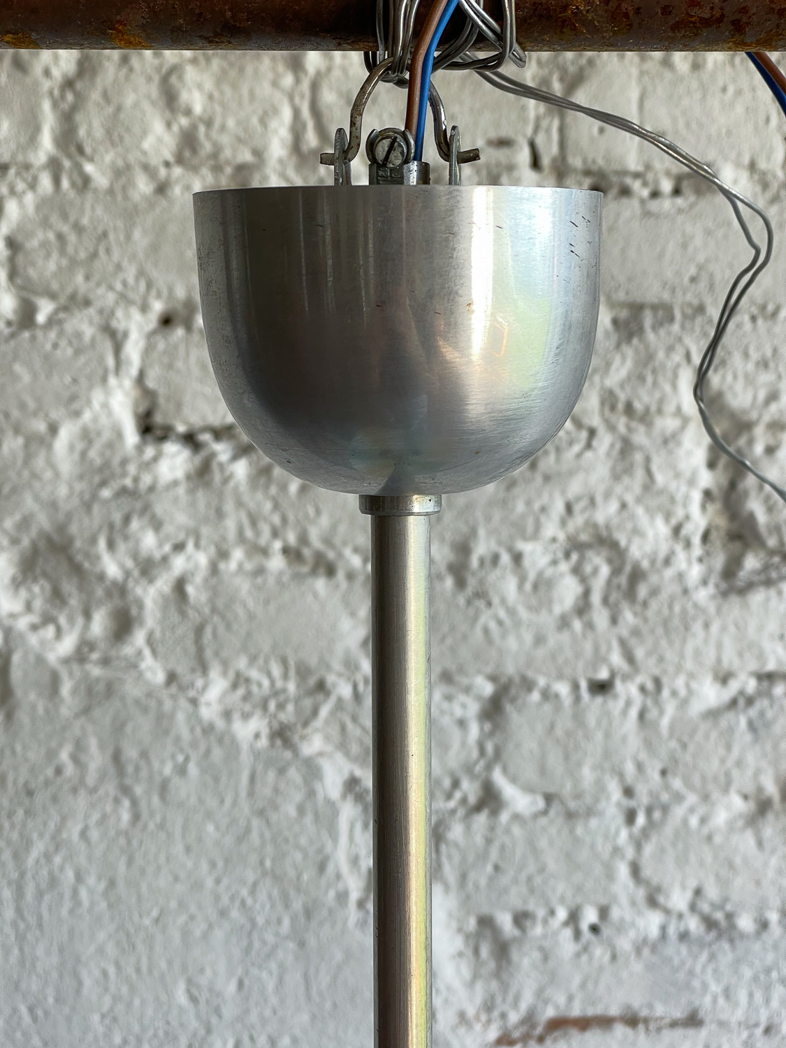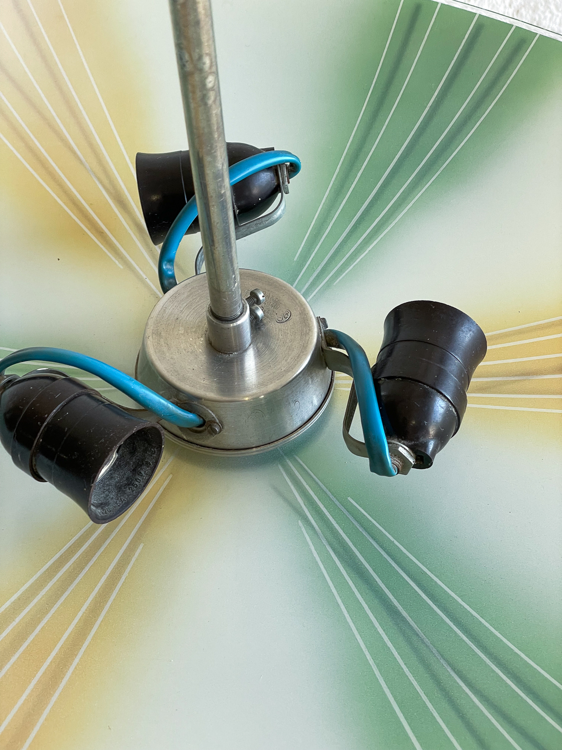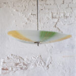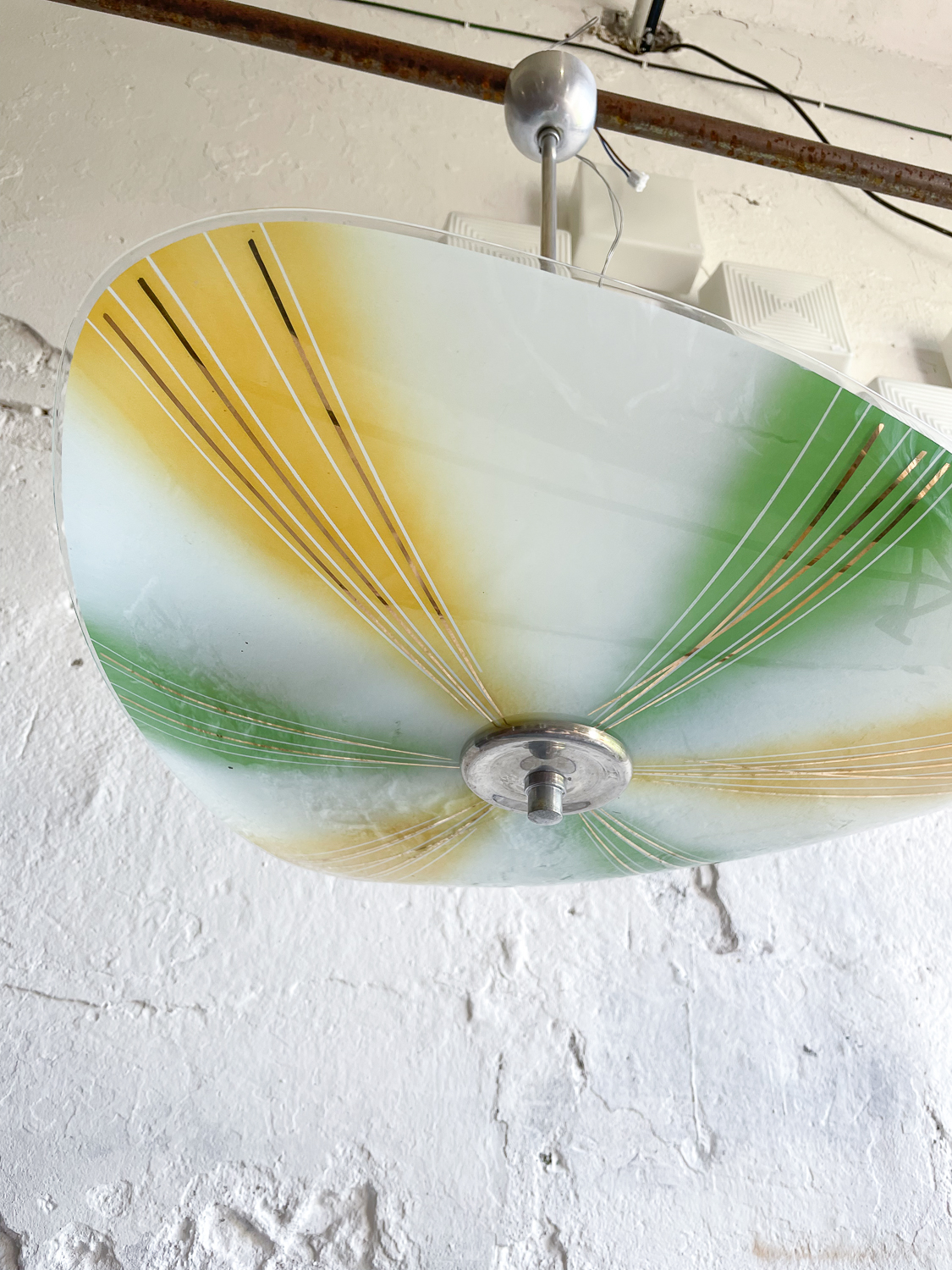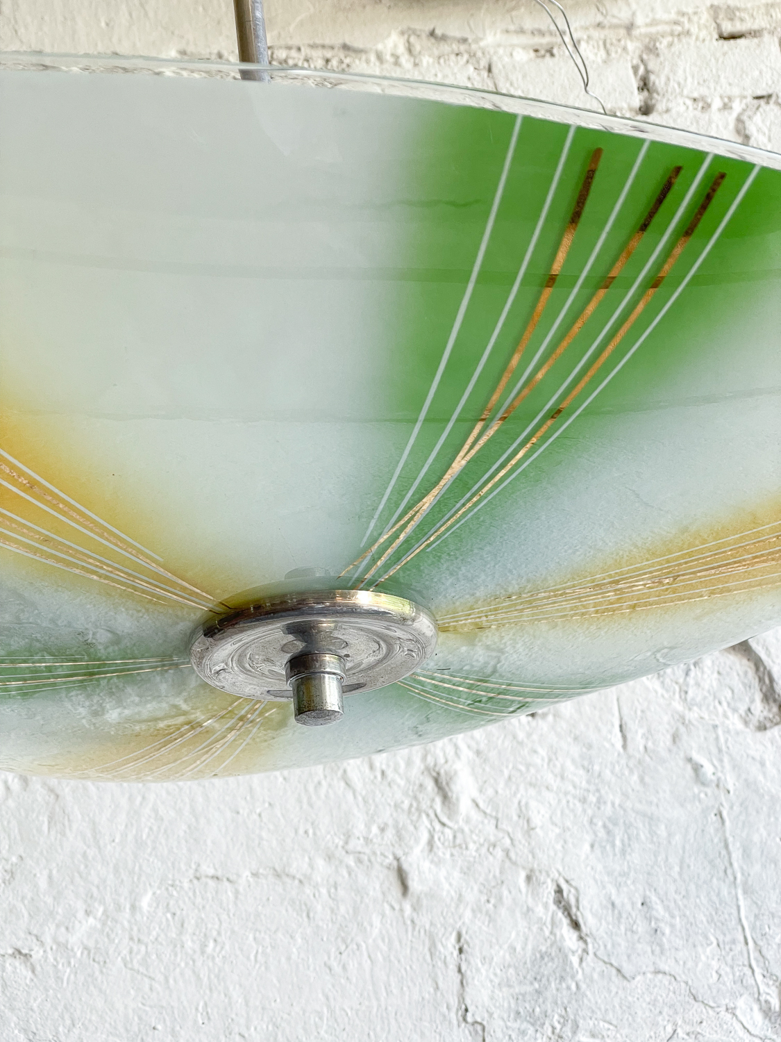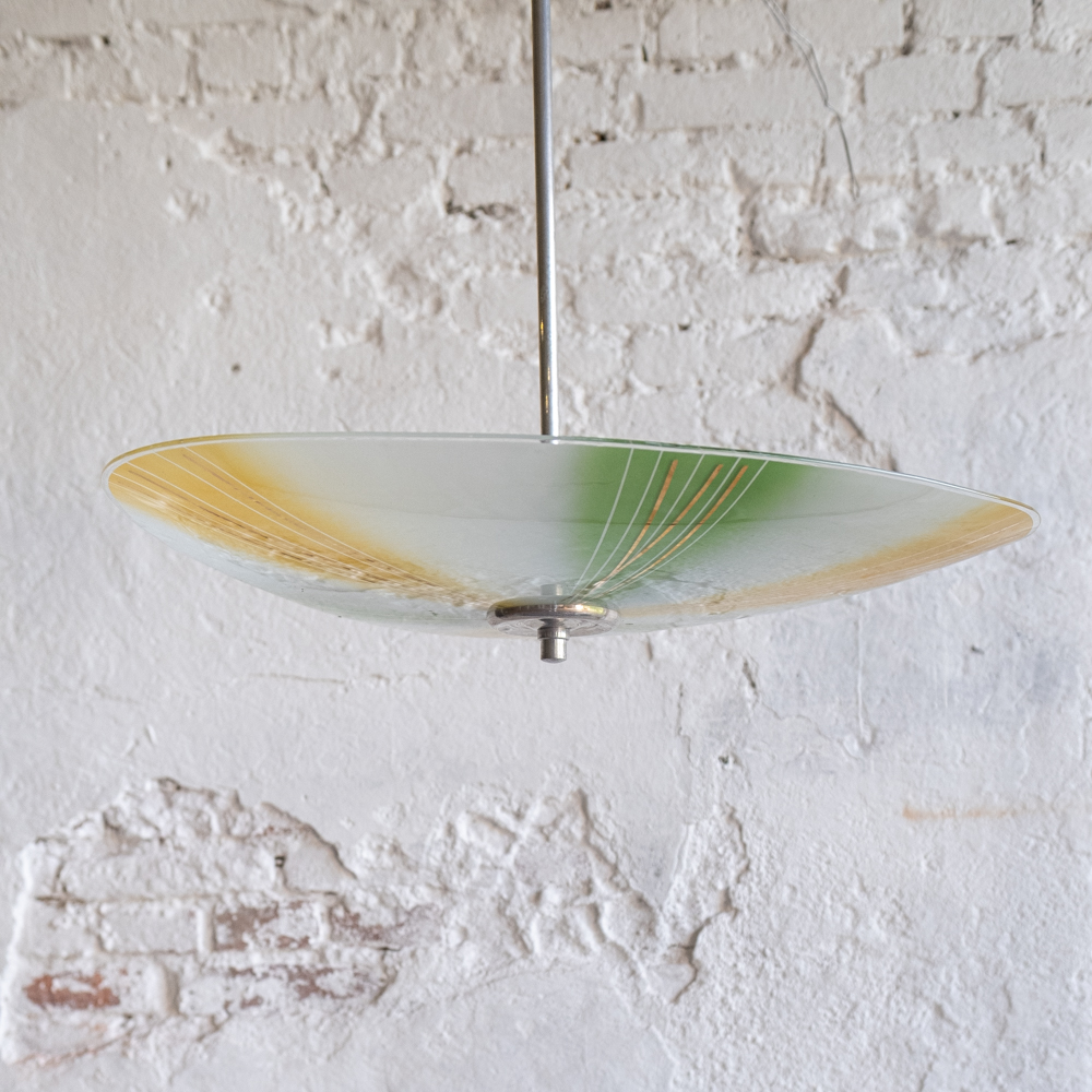 Retro lustr „talíř“ v bruselském stylu z 60 let. Skleněné stínidlo se zeleno žlutými pruhy se zlatými linkami v kombinaci s hliníkovou tyčí. 250 V, 3 x 40 W